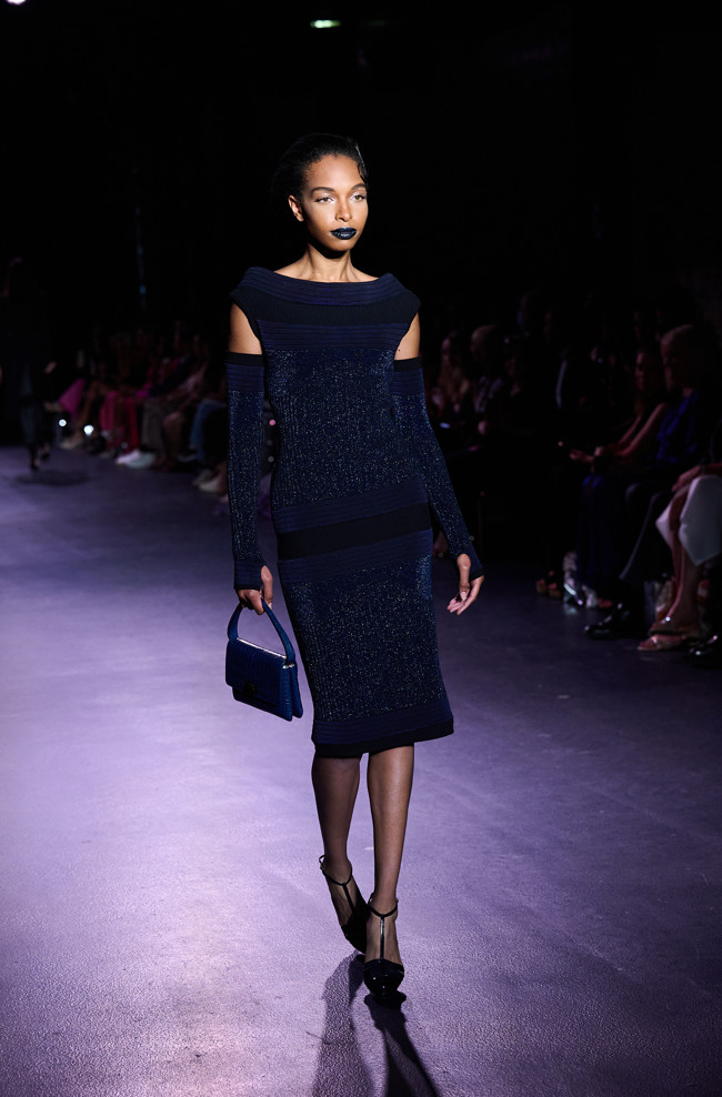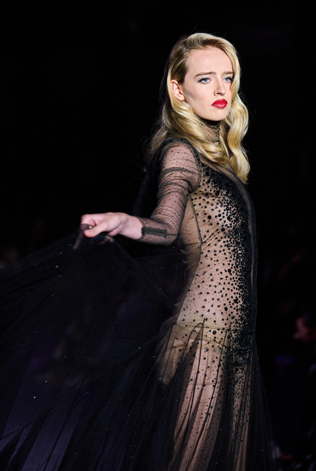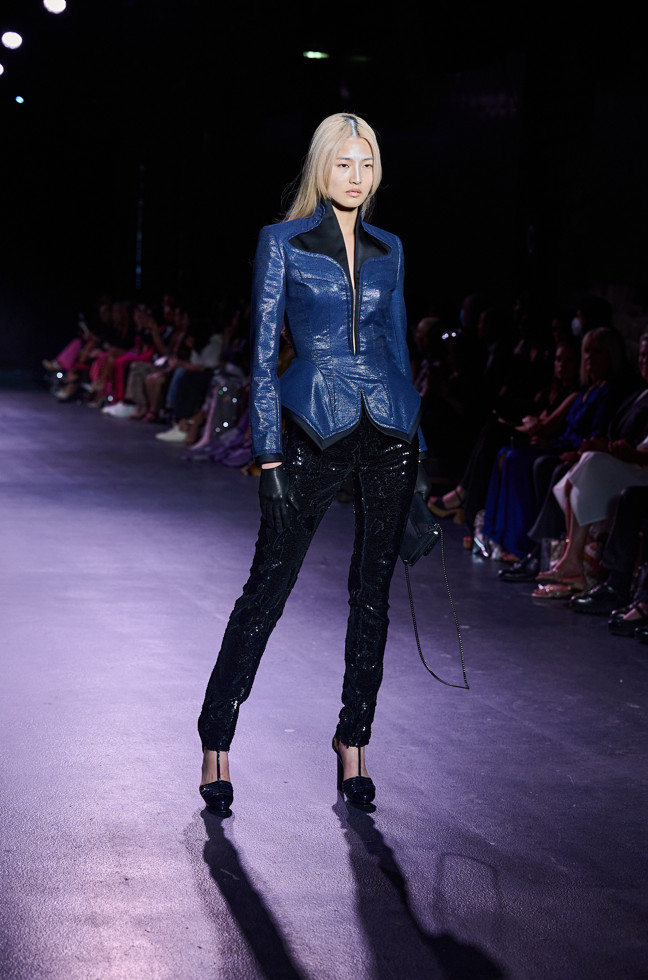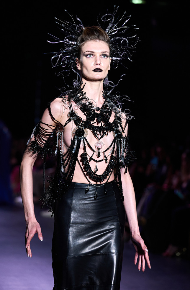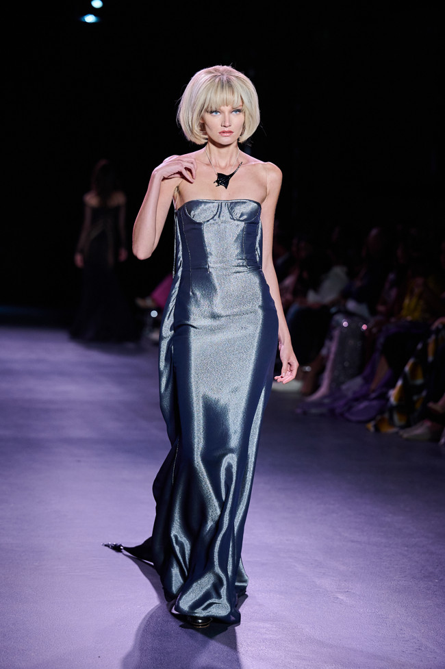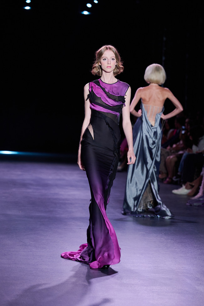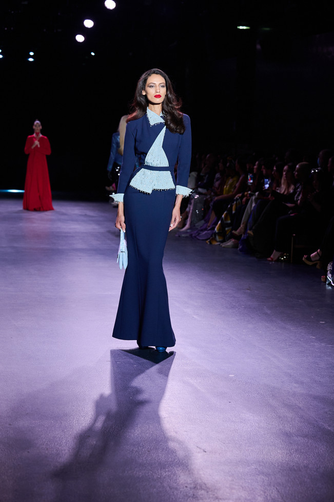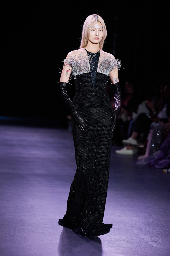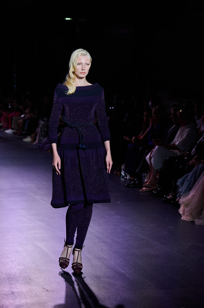 In his color palette for the season, Julien Fournié makes shades of black and midnight blue sing. He also chooses to weave metallic coloured threads together, moulds bodies into 3D silk jersey, translates the skin of the oceanic creatures he cherishes here into the pattern forming the mesh of a fine jersey, and emphasizes the skin with a sheer fish scale embroidery on a “nude” tulle sheath, uses organza to depict the iridescence of light when it is reflected in the pelagic space.