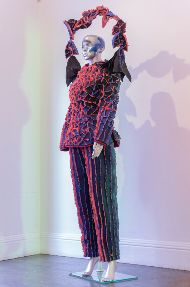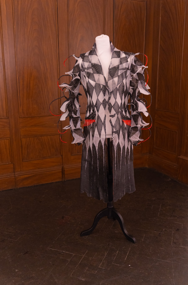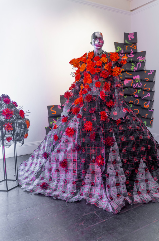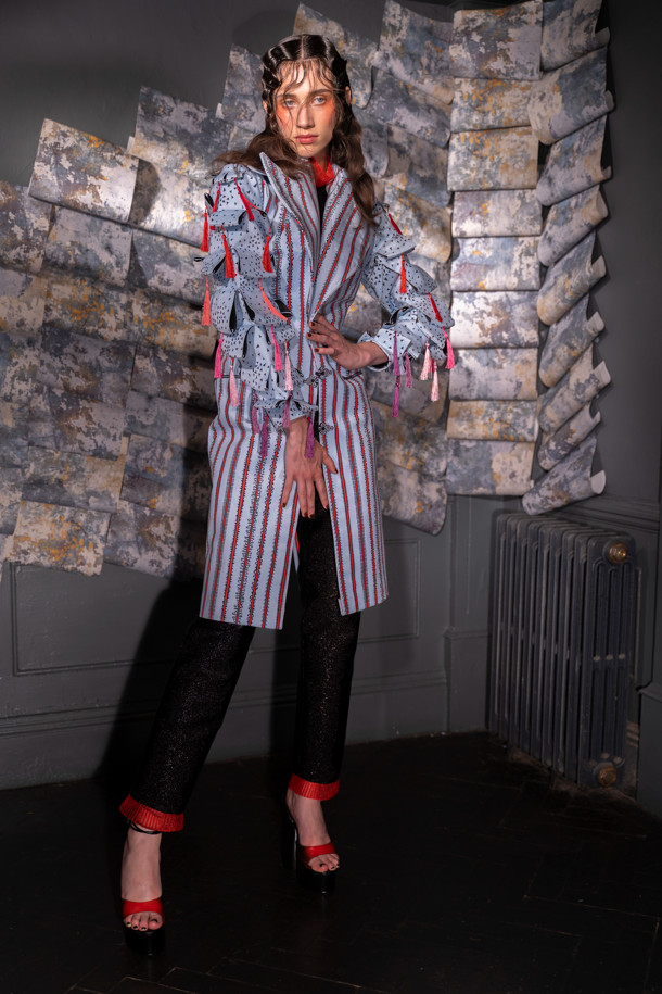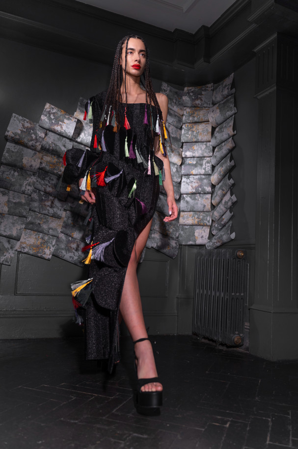 Staying away from the trends of fast fashion, the emerging designer aims to create clothes that are completely free from social chaos, aiming for the wearer to experience escapism and freedom from the opinions of forecasting trends. Her work is a form of hedonistic architecture, with structurally elaborate statement pieces seeking to puzzle and challenge the imagination, bringing the wearer pleasure. After graduating from CSM with a first, the Sarabande scholar felt motivated to expand on her work, demonstrating her broad range of skills to create additional intricately crafted pieces to form a full 10 look Ready-To-Wear collection.