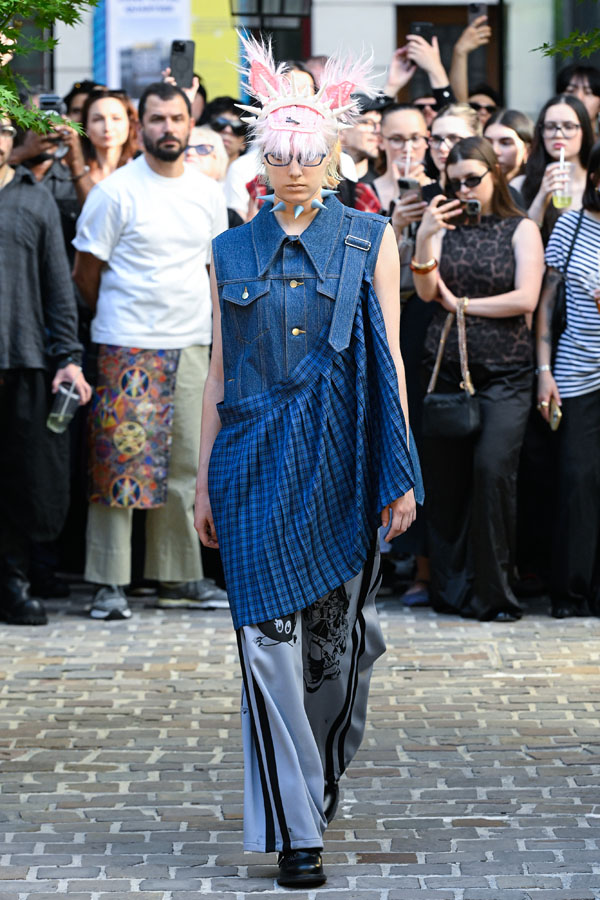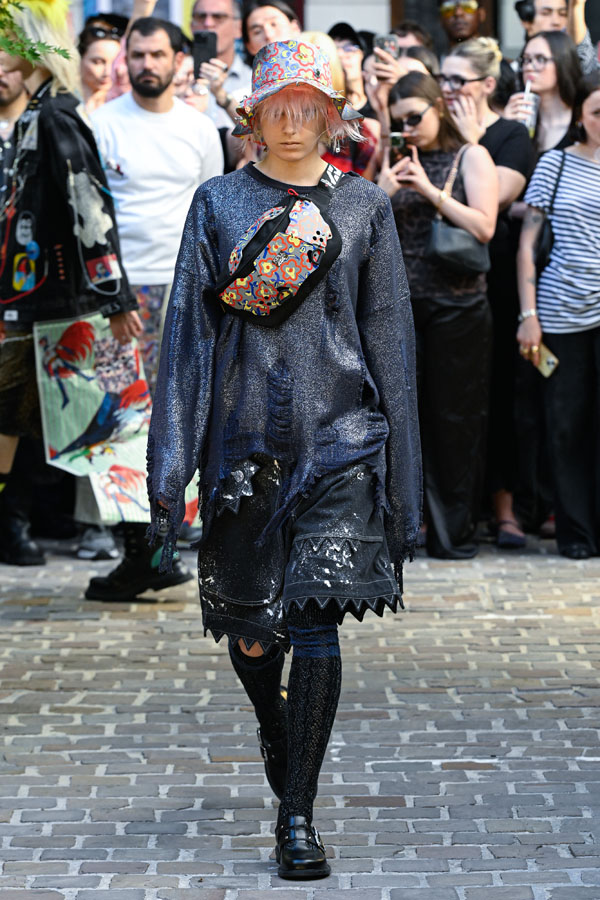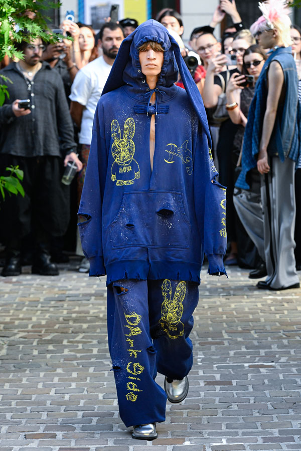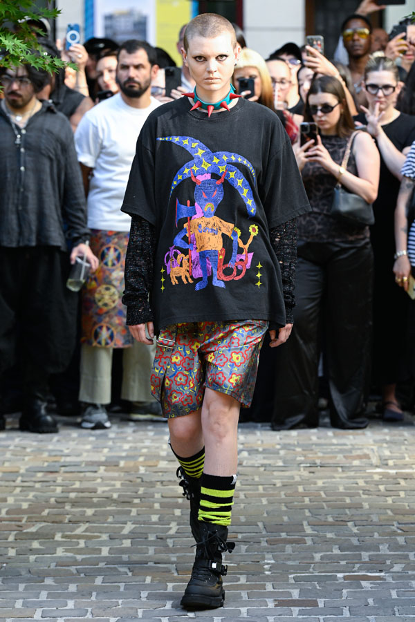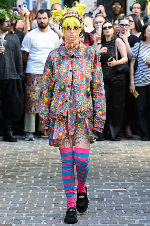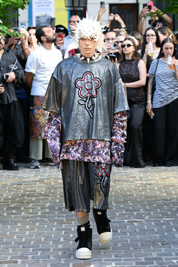 KIDILL is distinctively capable of coexisting punk and cyber aesthetics, symbols entwined with lush florals and destruction, kawaii and grotesque intermingling across garments, textiles, and silhouettes. This confluence perpetually generates fresh déjà vu that defies homogenization. The collection’s embrace of ambivalence and psychological complexity, alongside the subversion of hierarchical cultural values, resonates deeply with punk’s rebellious lineage, marking the emergence of a new narrative.
