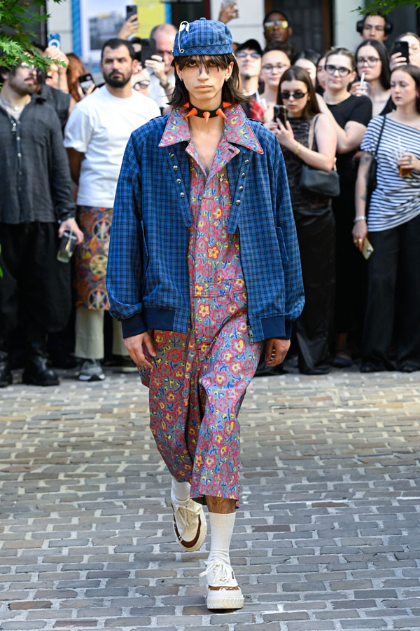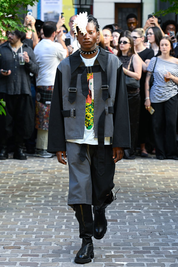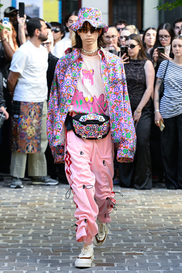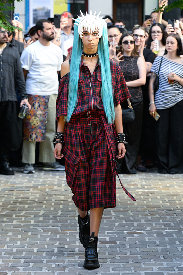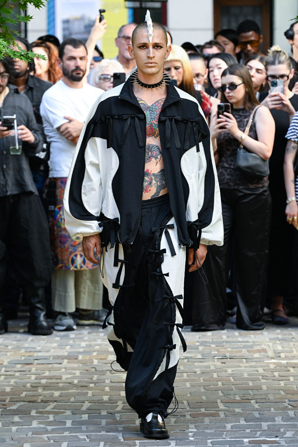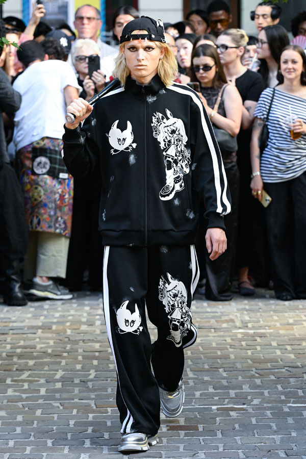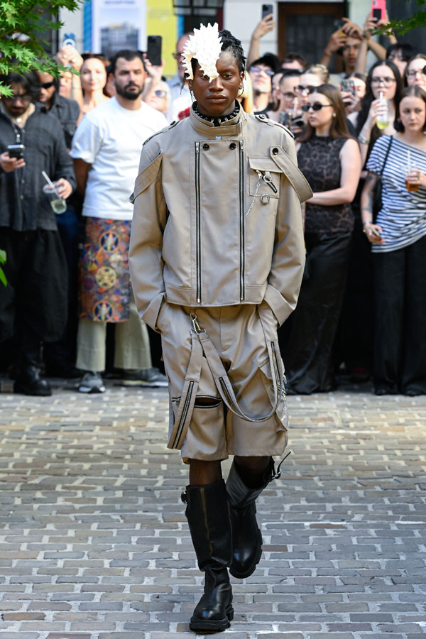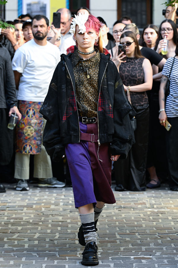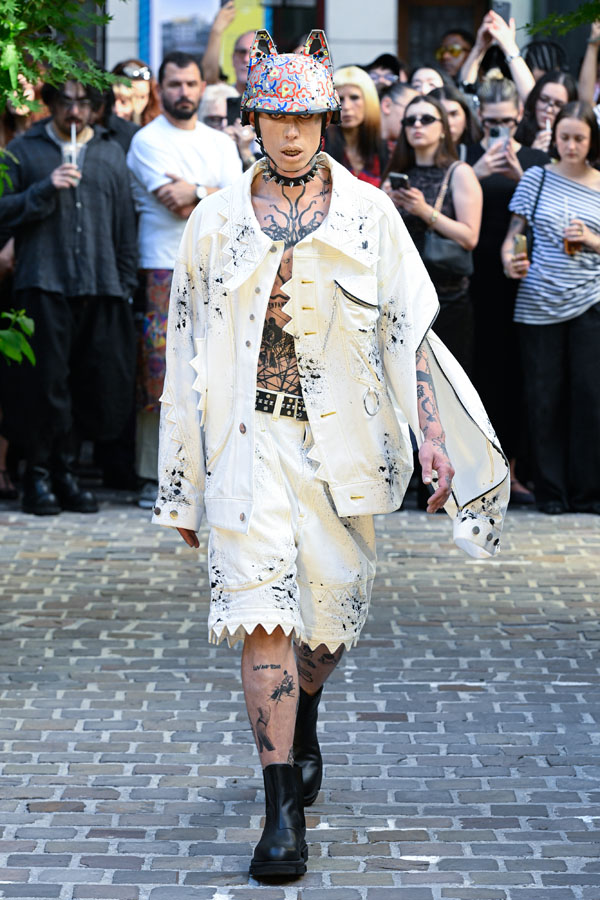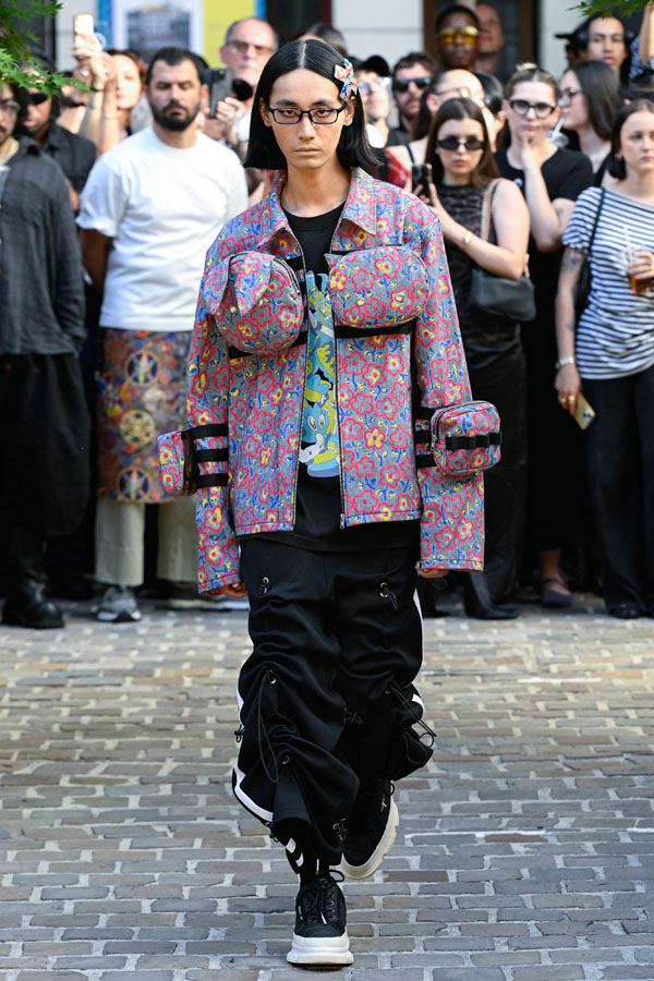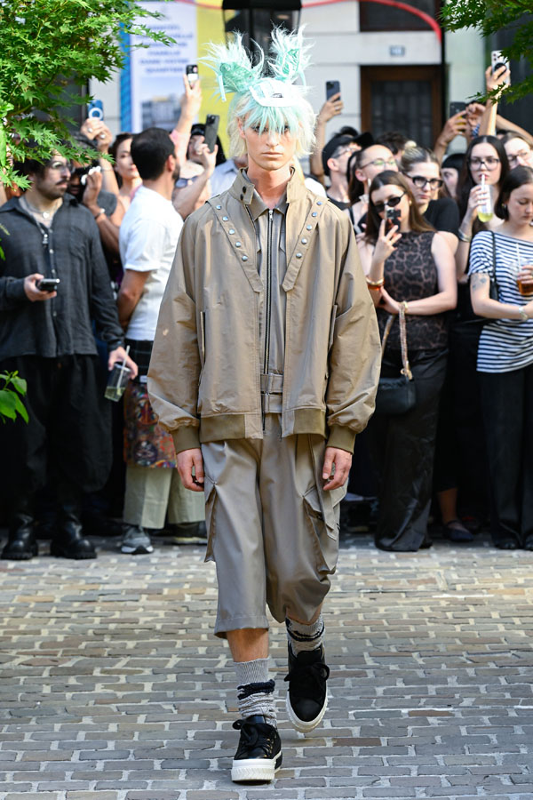 The Spring/Summer 2026 collection reimagines Tokyo’s cultural memory—shifting its lens from Harajuku to Akihabara, while spanning distinct eras and reconstructing design fragments into a new visual narrative. Silhouettes inspired by Godzilla’s scales and rubberized textures drawn from figurines evoke what Sueyasu describes as a distinctly Japanese tactile aesthetic. Accessories range from acrylic resin body armor crafted in collaboration with Chuocho Tactical Crafts (CTCTYO) to the floral-patterned “armored nekomimi ear unit”, encouraging the wearers to be “figurized” and transform into figurines themselves. One-of-a-kind pieces also emerge from a collaboration with Tatsunoko Production, pioneers of early Japanese anime, featuring iconic titles such as Science Ninja Team Gatchaman and Mach GoGoGo. The presentation, staged on the opening day of Mens Paris Fashion Week, paid homage to Japanese hospitality “Omotenashi”, unfolding as a tea ceremony with LES TROIS CHOCOLATS, where artisanal chocolates were served alongside traditional tea.