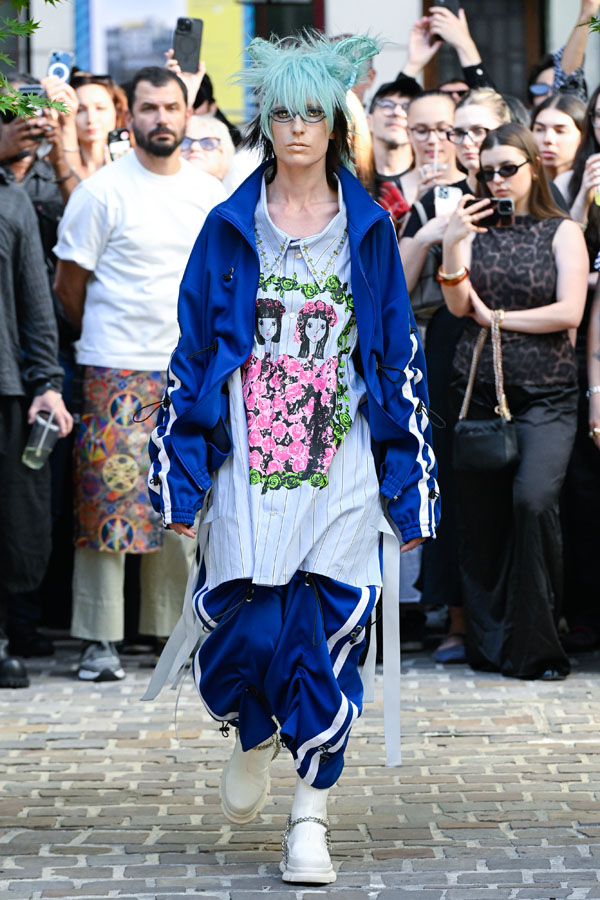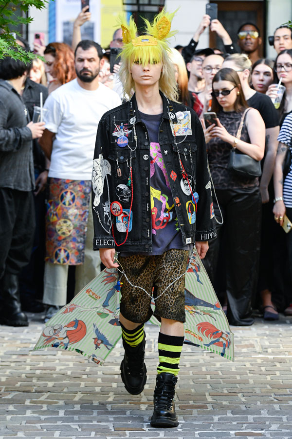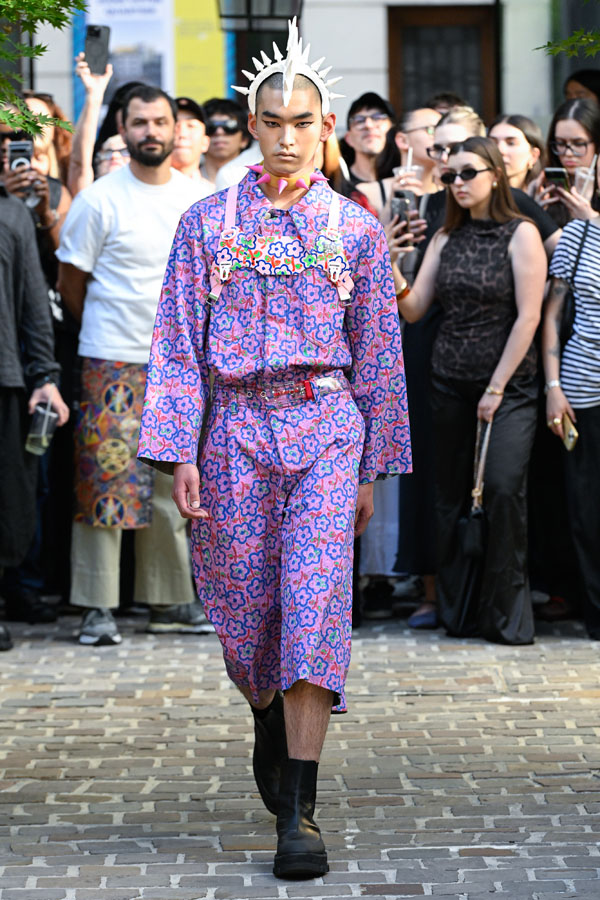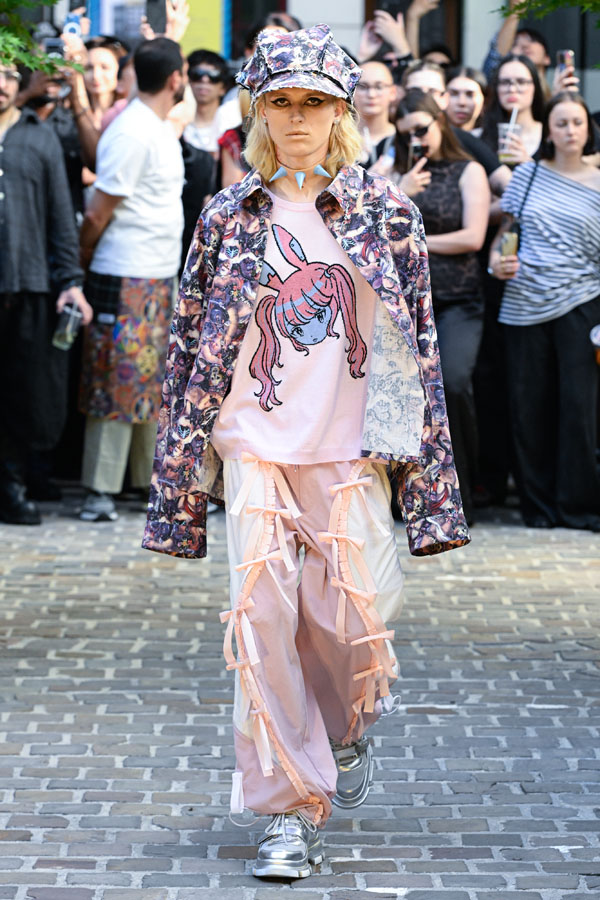 The quiet creativity of those once relegated to society’s margins — their energy, over time, now filtering into the mainstream culture. Shaped by contemplations from the Fall/Winter 2025 season, Hiroaki Sueyasu directly confronted this reality, finding himself increasingly captivated by the multitude of cultures flourishing in Japan. At the essence of this fascination lies a characteristically Japanese imagination, vividly expressed through realms of anime, figurines, electronic music, and cosplay.
