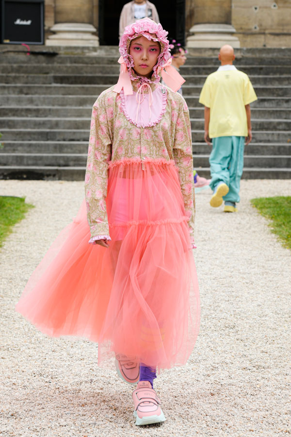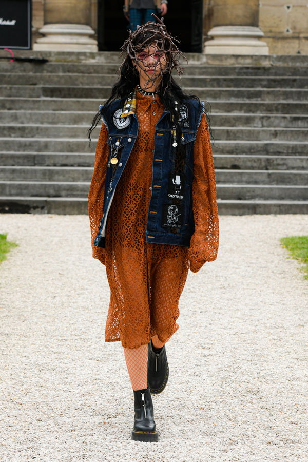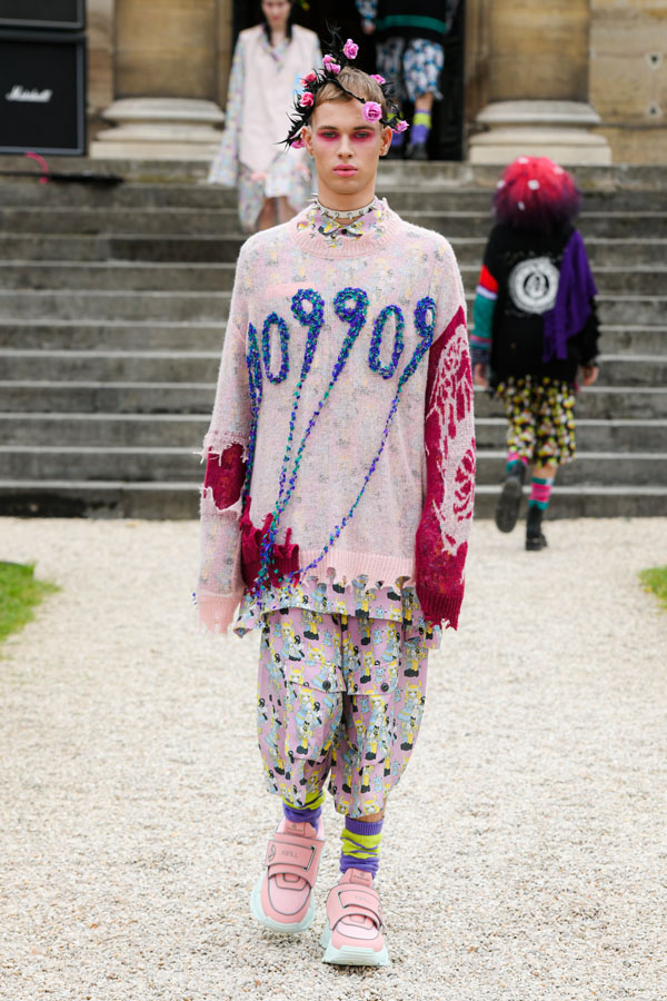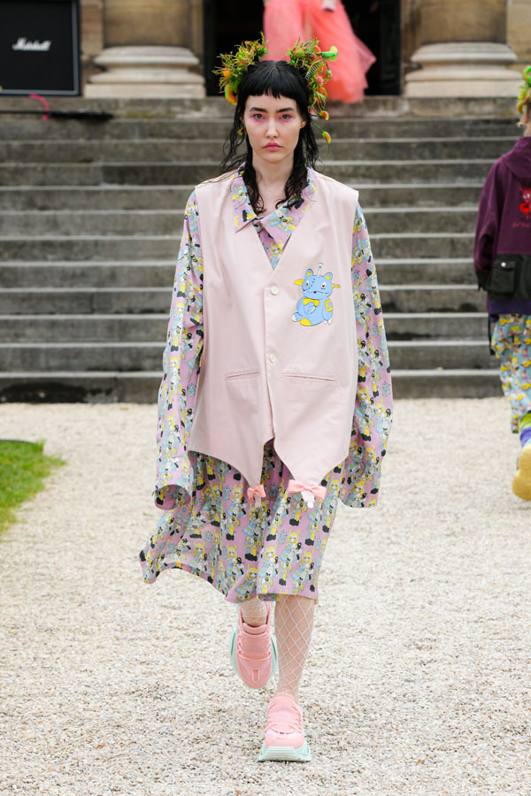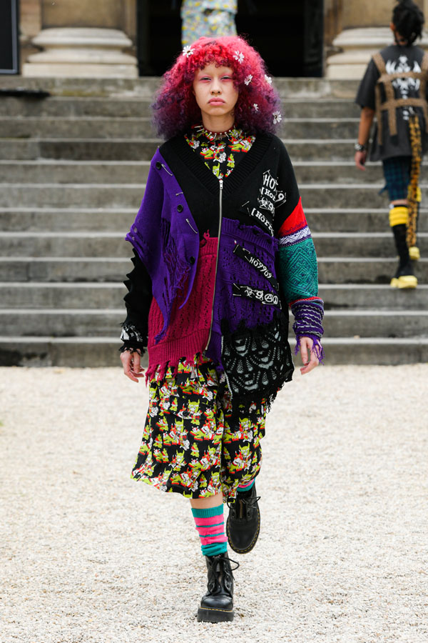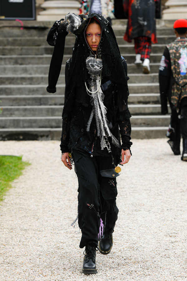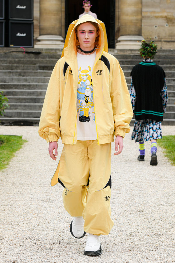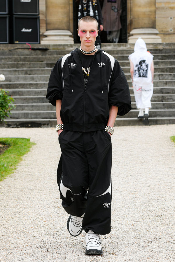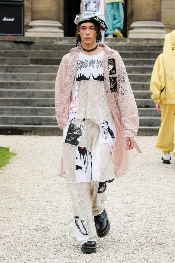 The designer expresses and is inspired by the “Tokyo-ness”‘s vibe emanating from the musicians, while blending streetstyle inspirations captured in Harajuku, more specifically the “Lolita” style. Suesayu also expands his collection by adding deconstructed pieces from vintage metal t-shirts, a shoulder bag that contains suprising textures of tattered and eroded fabrics, sleeveless suit jackets and vintage suit pants created by tailors. The collection also includes sports jackets and games t-shirts made in collaboration with UMBRO.