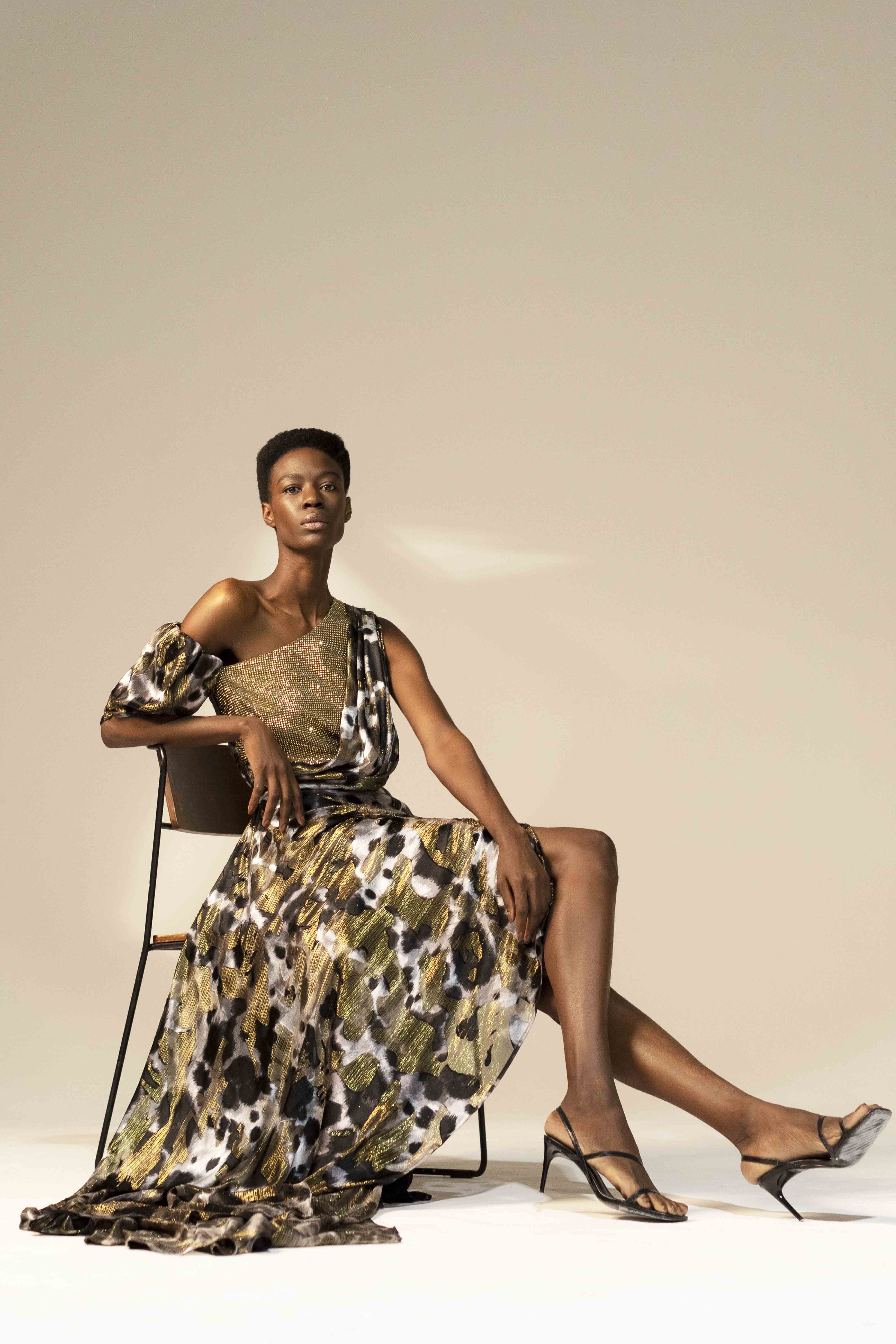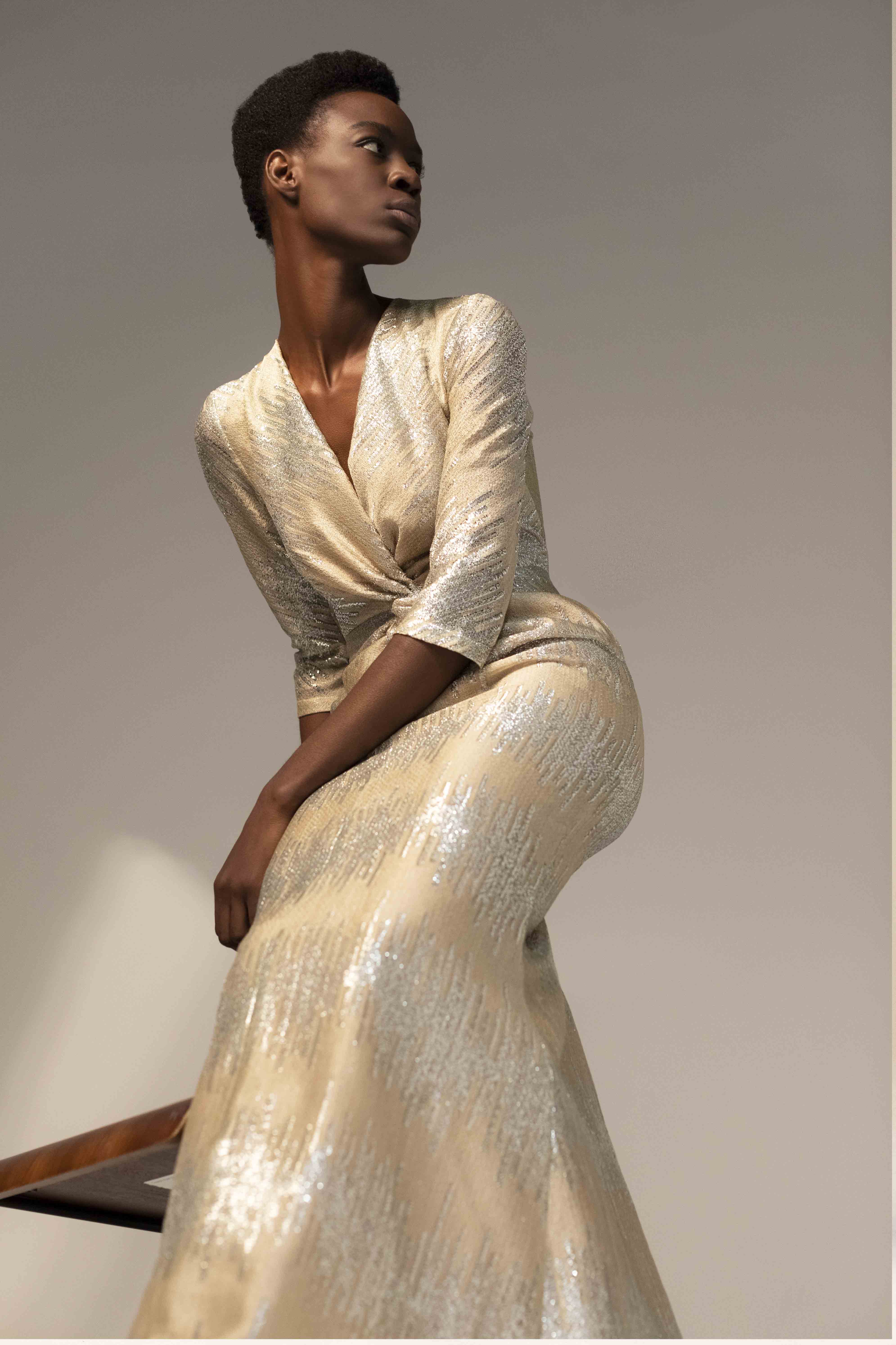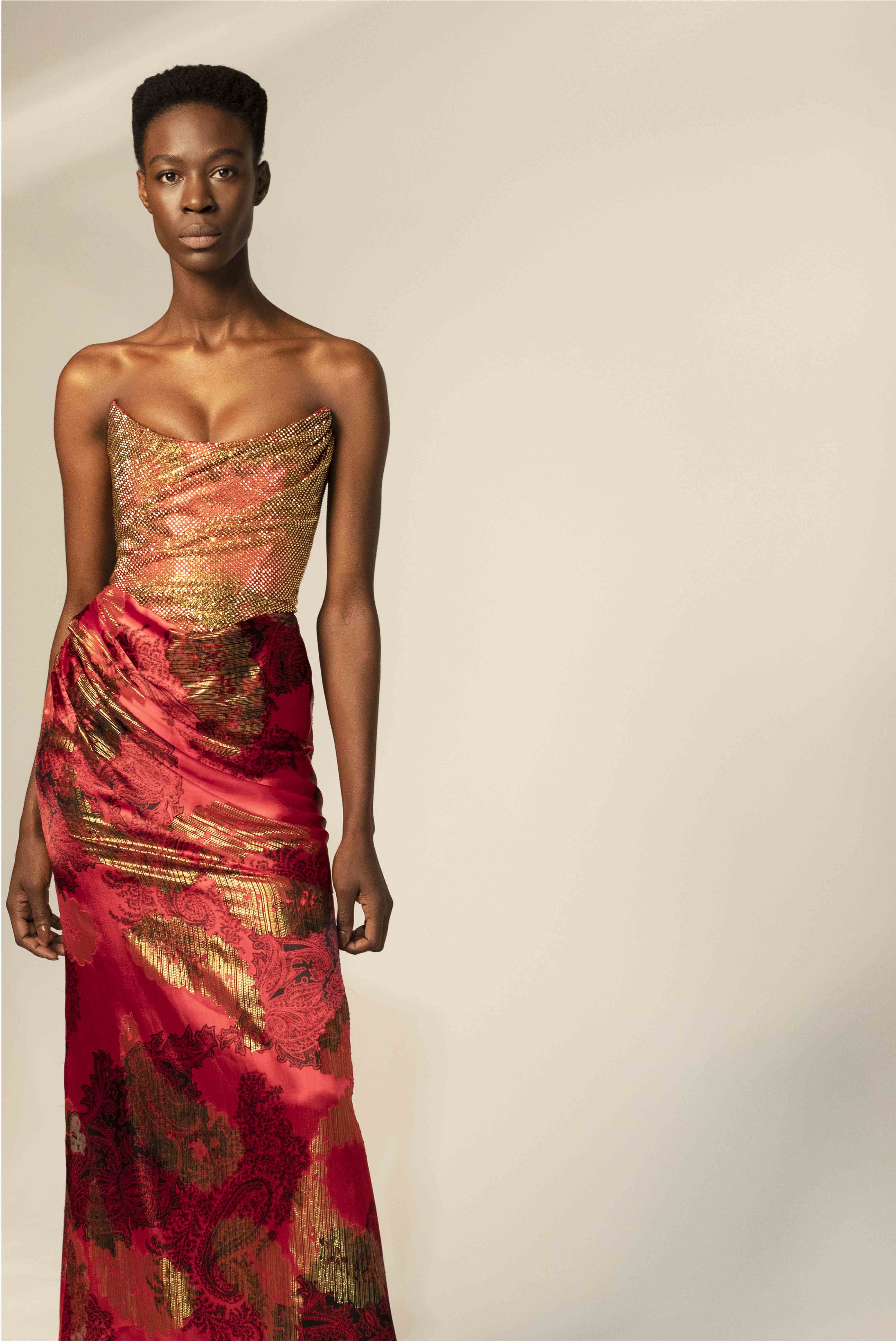 Clean lines and corsets unveil gold crystal details representing the attractive and fascinating traits disguised in every woman ready to stand out from the crowds.