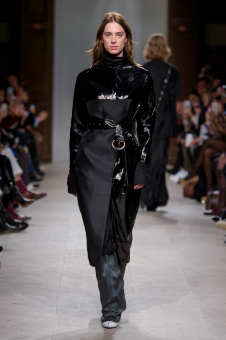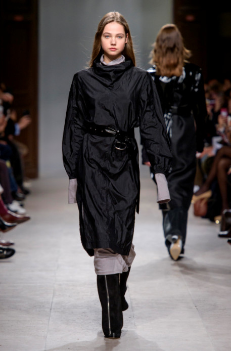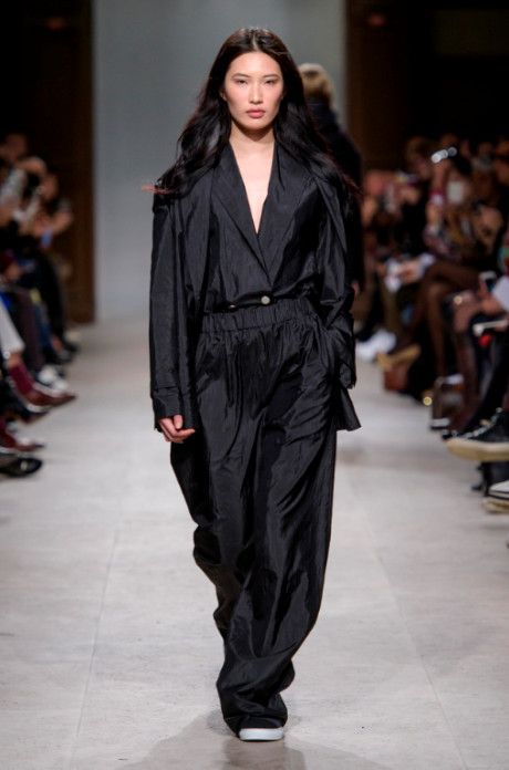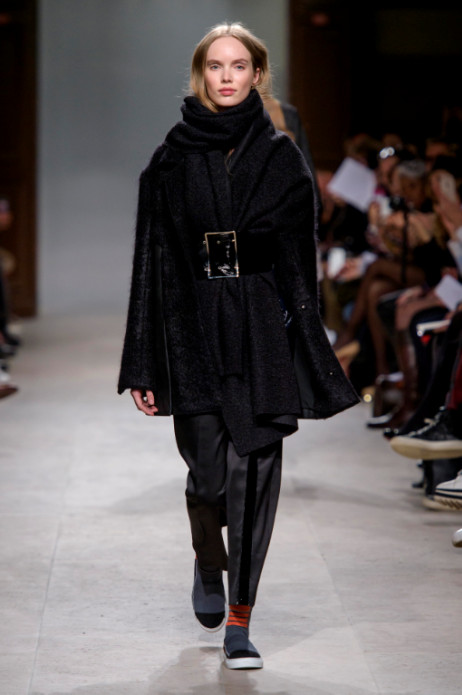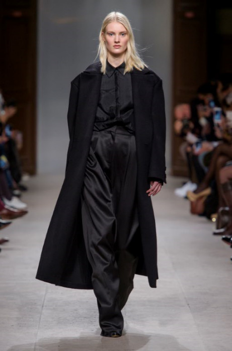 Throughout the silhouettes, there is comforting pure cashmere mixed with laminated cotton, dry wool and silk, inspired by the colours and textures of the work of Alberto Burri on the combustion of vinyl, which one imagines taking life on a Stella Tennant.