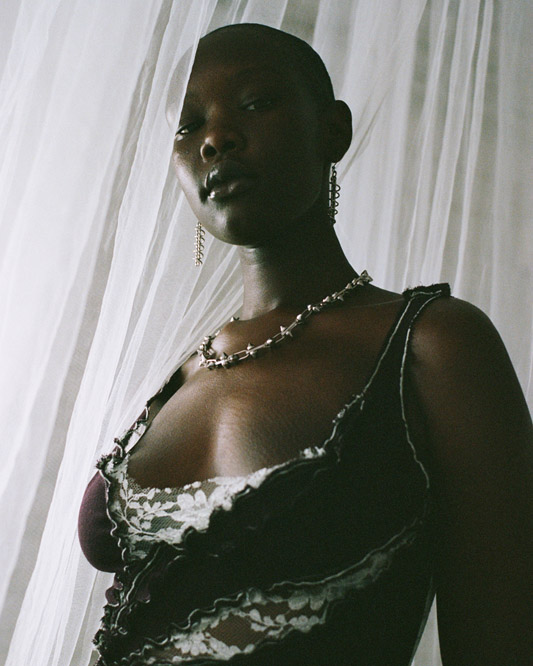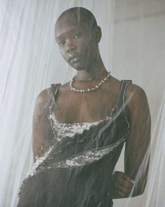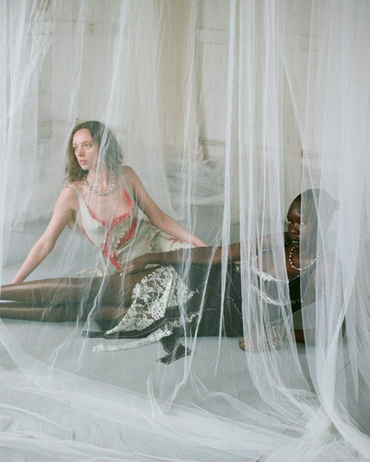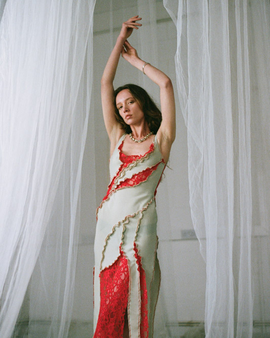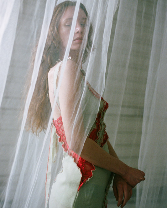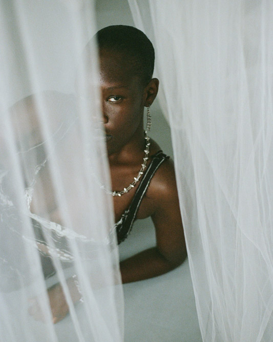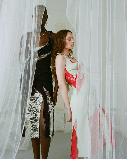 In this capsule collection, Creative Director Alexander Barakat explores themes of liminality and the concept of being in-between. It delves into the realms between life and death, day and night, and body and soul. Focusing on womenswear, the third capsule introduces the striking ‘Chrysalis dress’ available in various colorways. These garments investigate the delicate nature of our protective mechanisms, which encompass masks, boundaries, and our sense of self. Just like a chrysalis that grows and hardens, only to be shed in a continuous cycle of rebirth and renewal, we grapple with what to reveal and what to conceal, often attempting to hide scars with humour and disguising trauma as adornment. This collection reflects the fragility of these self-made defences, which both define and confine us as we pursue self-fulfilment and growth in our twenties.