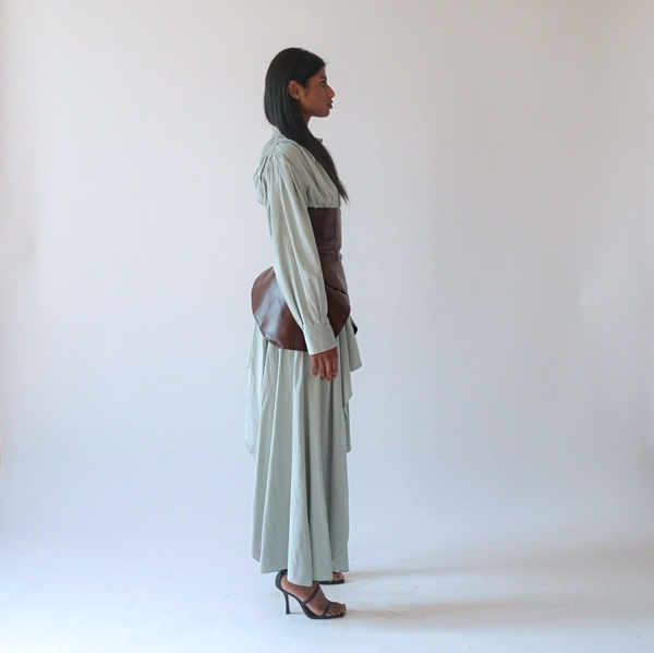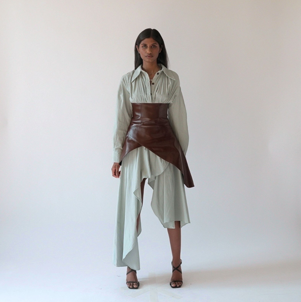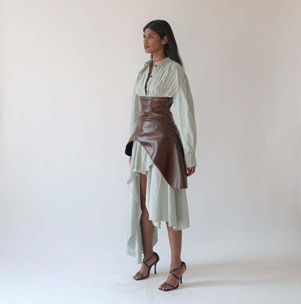 At the heart of Piece of Mind is Creative Director Alexander Barakat’s exploration of duality – between natural and synthetic, softness and structure, self and environment. Designed and hand-crafted in Krucible’s London studio by the self-taught designer, the collection is built around deliberate contrasts: flowerlike deadstock silk bias cuts layered under sharp vegan leather tailoring, washed cottons frayed by hand, and asymmetric silhouettes that resist perfection. Barakat views asymmetry as the ultimate expression of luxury, and the enemy of mass production.