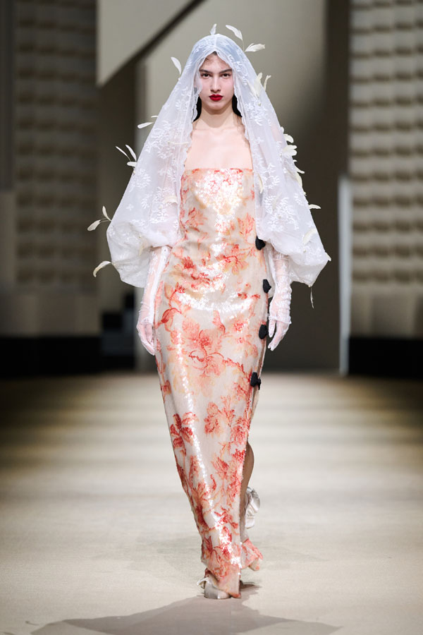 Haunting Crush presents Chinese satin that weaves ultimate elegance. The X-shaped silhouette conveys grace and distinction, while lace and pearls add a touch of romance. Bright and lively, it evokes the enchanting world of oriental Rococo.
