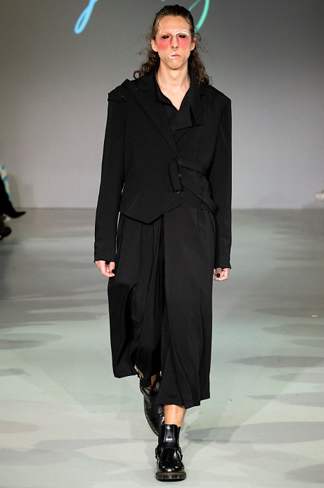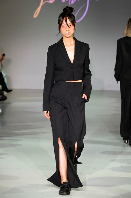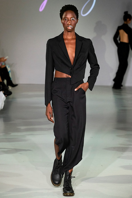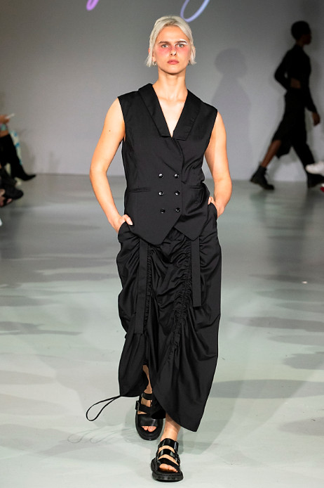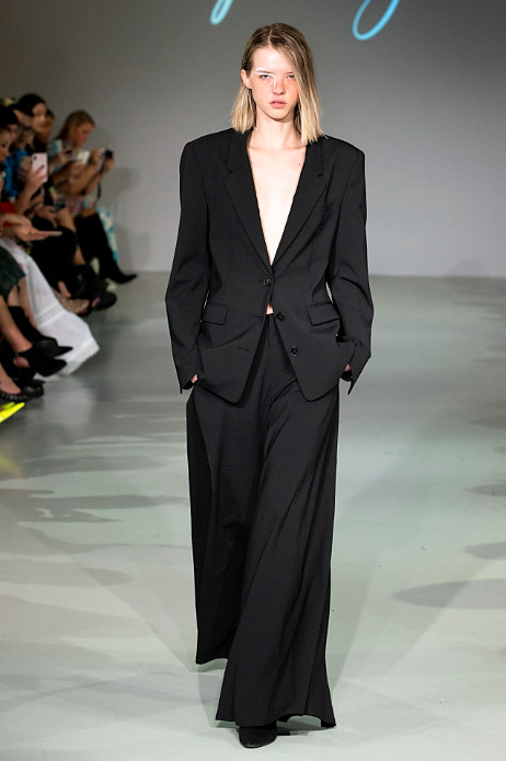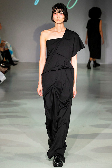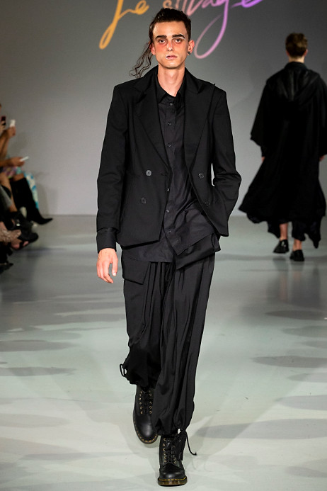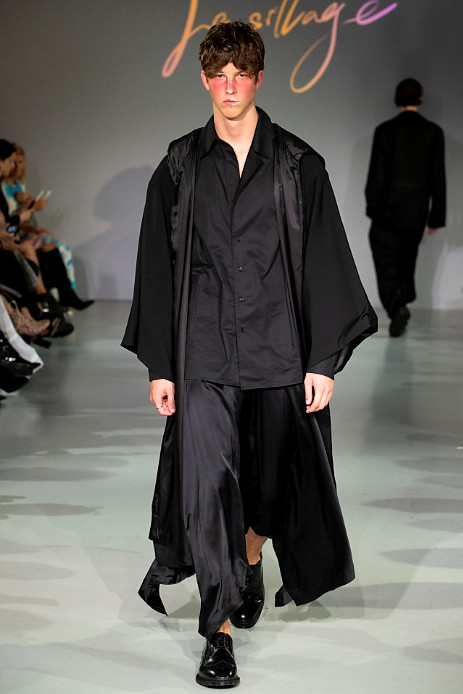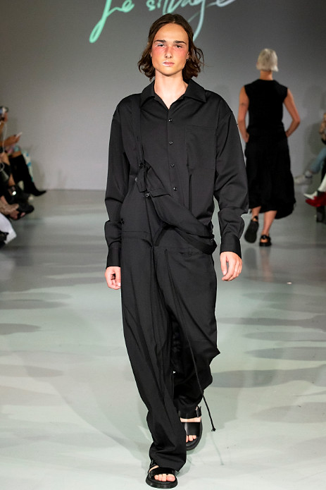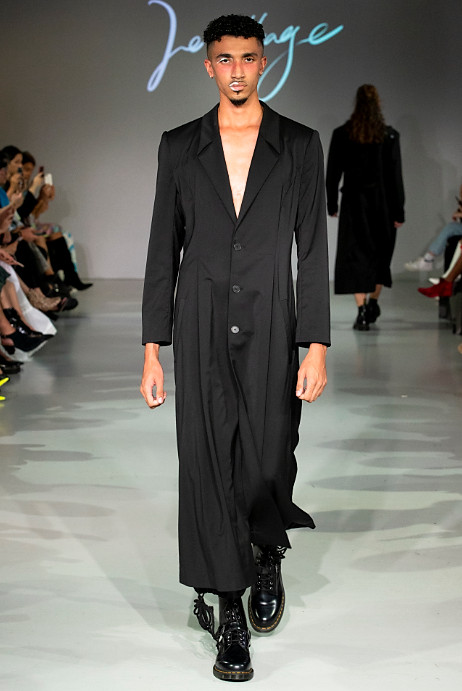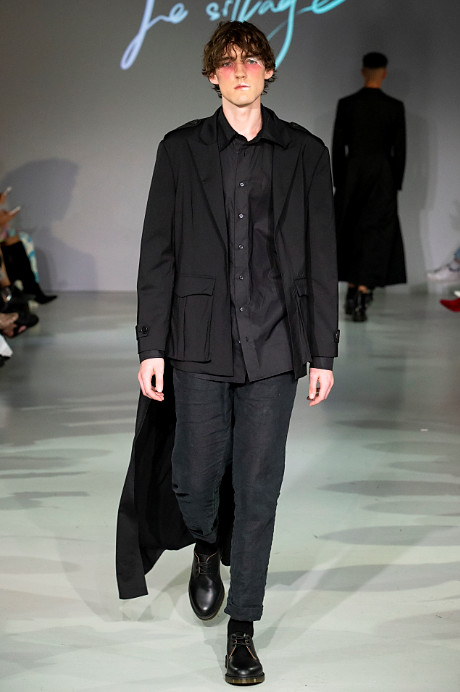 Le Silage’s debut during London Fashion Week is compiled in an almost all black collection which reflects the brands clean aesthetic. Black is often regarded as a monotonous colour, but it also brings a high-level of dignity to people as it acts as a disguise. In terms of design, Le Sillage carries out morphological changes and deconstruction through vertical cutting and crossed gender styles.