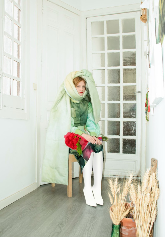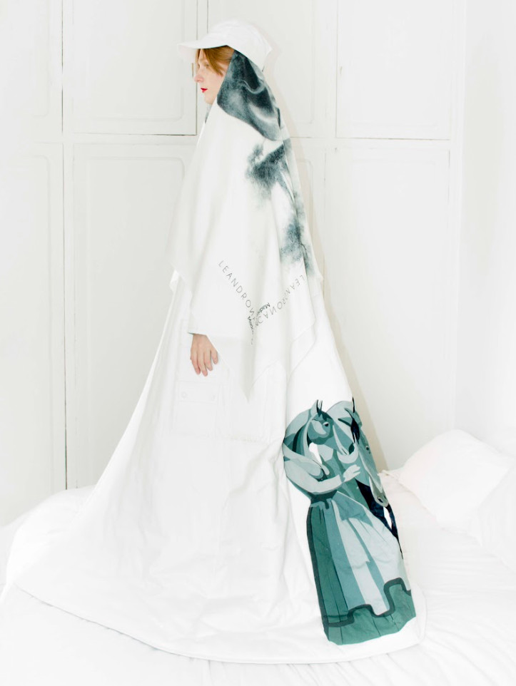 - Maxi reversible coat with padding. On the outside, the work created by María Rubio has been printed on cotton fabric. On the inside, Mas Telas, with the technique of the oil mill, has recreated the print in gray and black scale.