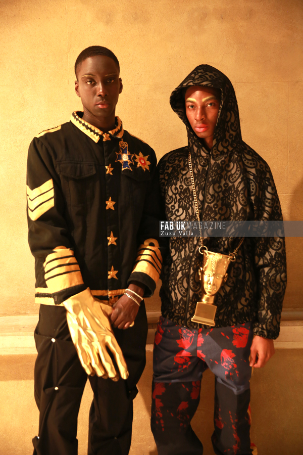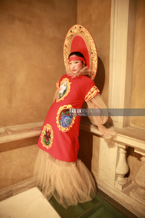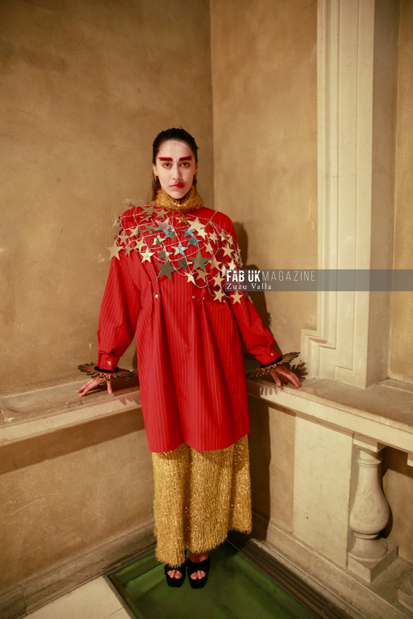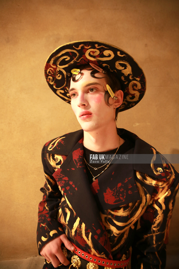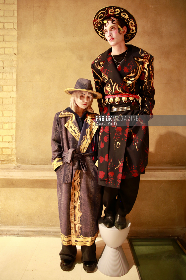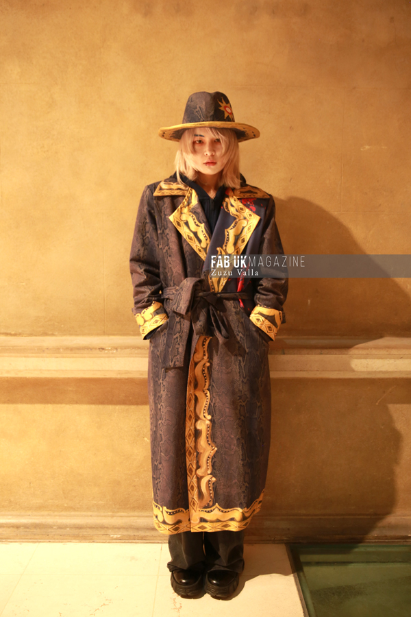 Beyond its artistic appeal, “Fashion is Art” integrates structured, military-inspired elements. Drawing from the disciplined lines of queen’s guard uniforms, the collection showcases belted coats and trousers adorned with bold red and gold stripes. This interplay between strength and elegance underscores the collection’s distinctive aesthetic.