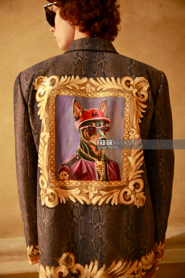 Pridon Niguriani’s latest work draws deeply from his appreciation for fine art. Inspired by a visit to the Gallerie d’Italia and enriched by collaborations with his community of artists, “Fashion is Art” embodies a genuine connection between fashion and creativity. Each piece in the collection is a canvas, featuring hand-painted designs that required meticulous craftsmanship—some taking up to seven days to complete. Delicate female portraits, intricate florals, and lifelike depictions of wild animals are key motifs, reinforcing the collection’s artistic ethos.