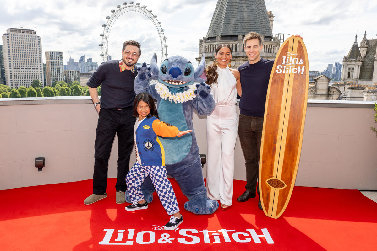(L to R) Dean Fleischer Camp, Maia Kealoha, Stitch, Sydney Agudong and Jonathan Eirich land in London to promote Disney’s “Lilo & Stitch”, at The Corinthia Hotel on May 12th, 2025 in London, England. The film is in cinemas from May 21st. (Photo by StillMoving.Net for The Walt Disney Company Limited)