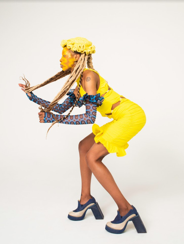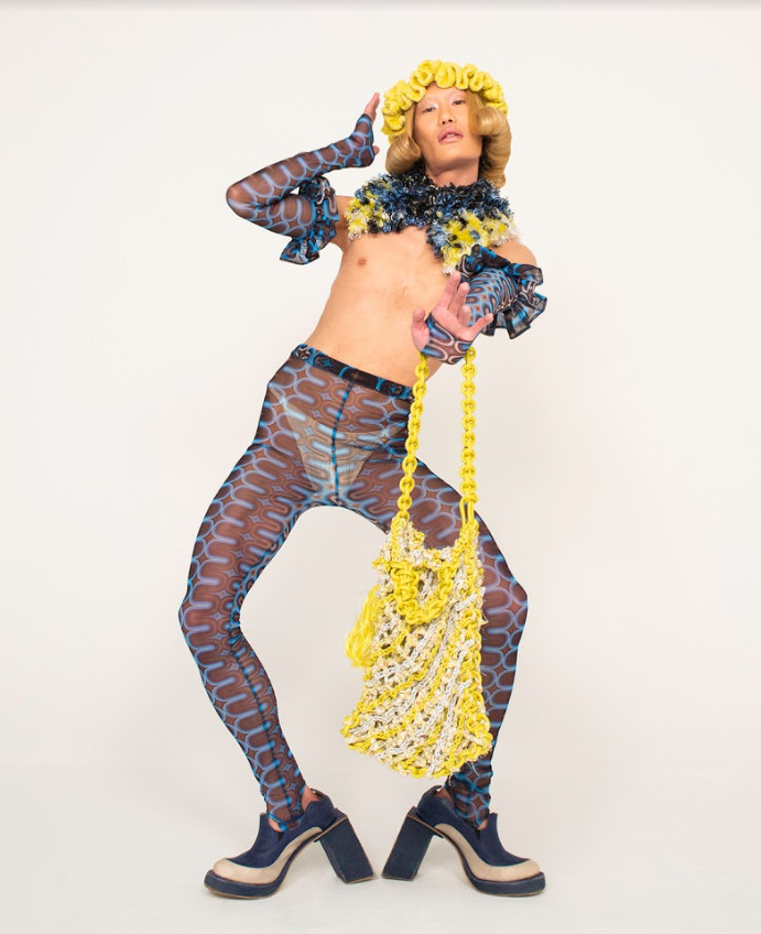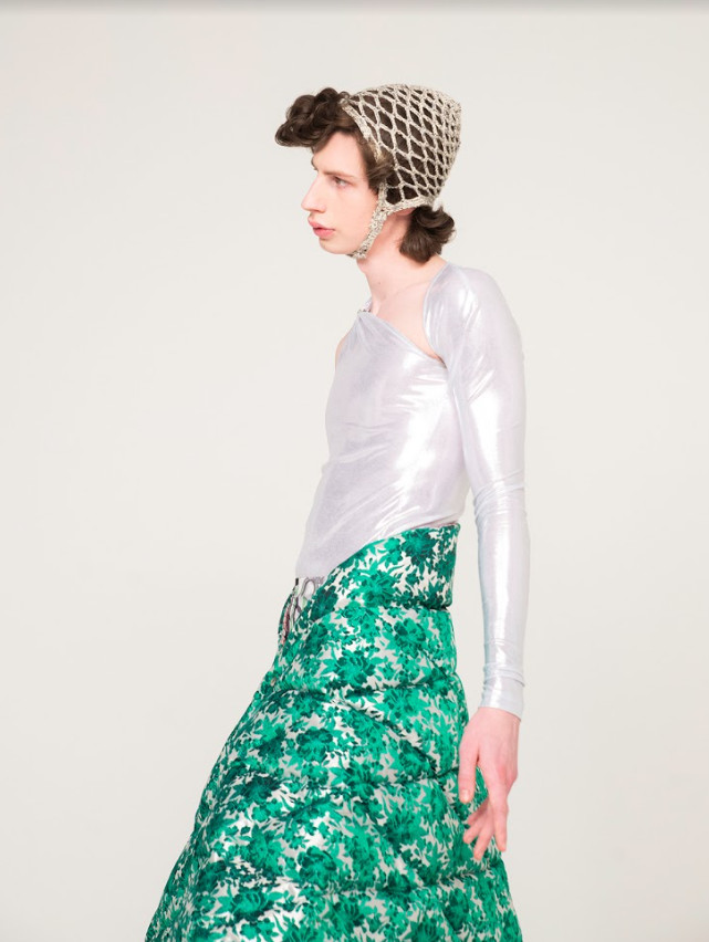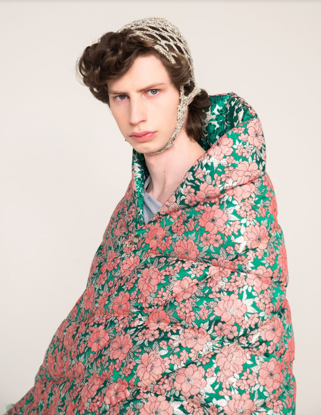 Although the title presents a religious connotation, the concept of the collection is rather one of creation. Namely, the necessity of constructing dreamscapes and utopias in one’s own mind when sheltered from impressions from the outside world. Call it daydreaming or escapism, but envisioning a better world is a necessity to bring ourselves and our communities forward. Within utopia exists dystopia, which leads to Leonardsson’s interpretation of the word. Having experienced the outside world mainly through a display of pixels during the course of the pandemic, they saw endless possibilities of self-expression and communication with the entire world all at once through modern technology. Highly inspiring, and utopian in one sense of the word. But at the same time, a digital realm is only real for as long as the power is switched on, and once logged off reality remains. Recycled synthetic jerseys with otherworldly shine, reprocessed polyester cords crocheted into statuary constructions and tight, figure hugging superhero-like pattern constructions all tell the story of a digital utopia where everyone can envision their own dreams, while duvet inspired puffer jackets, up-cycled floral bedsheets and dead-stock yarn crocheted into soft helmet like hats portray the domestic contradiction which protects the dreamscape.