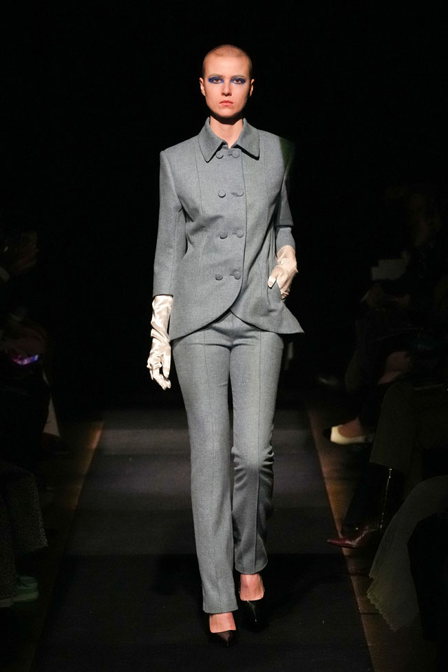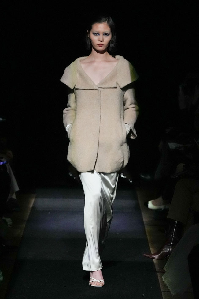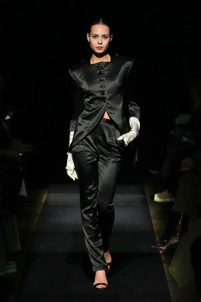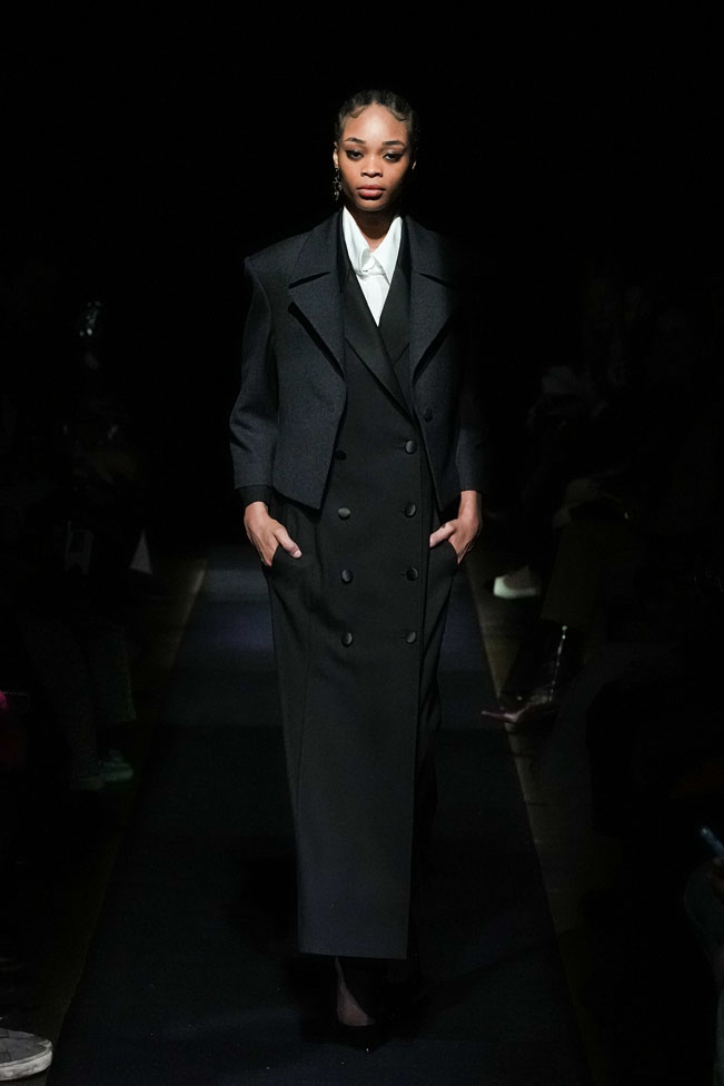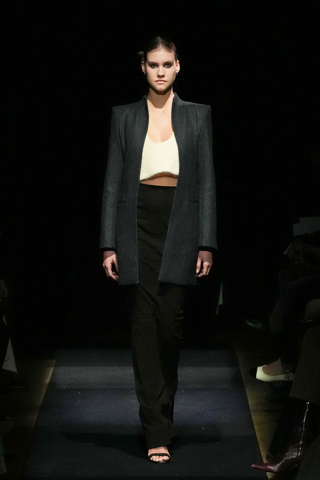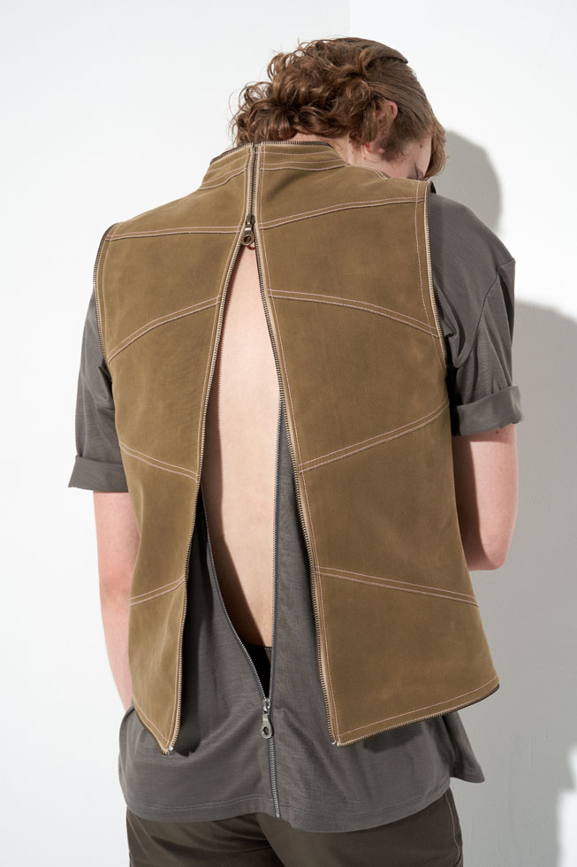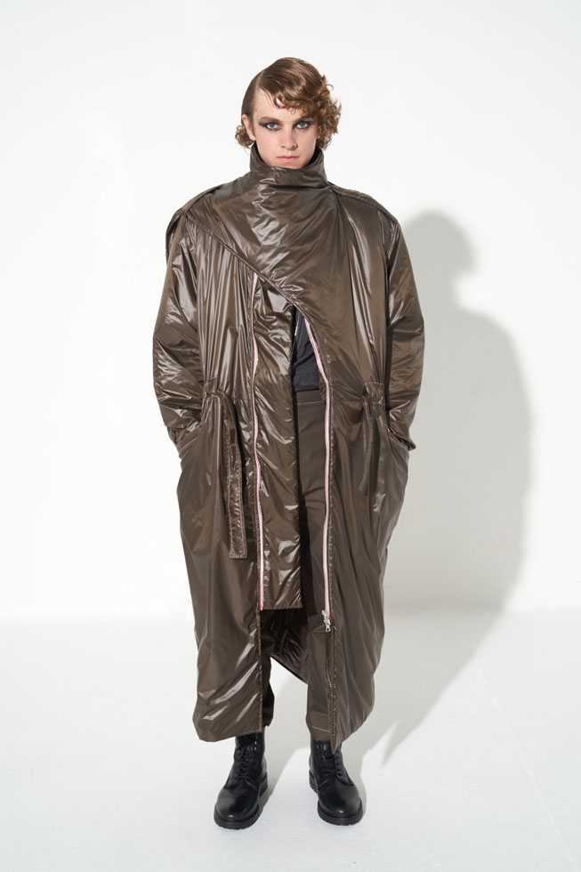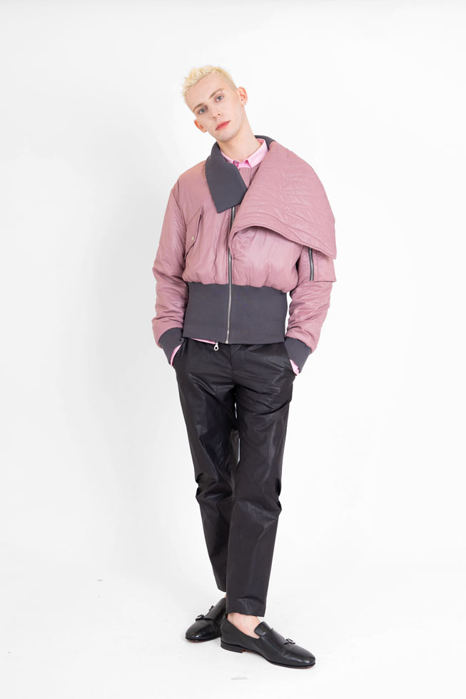 YEF STUDIO’s collection created a modern contemporary silhouette in menswear using British youth culture references from the late 70s to the late 80s through the manipulation of fabric and the control of structural details, as well as the integration of femininity.