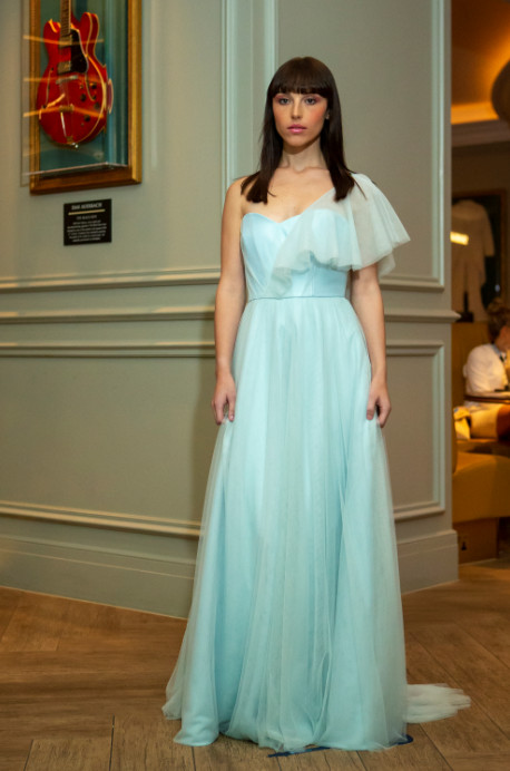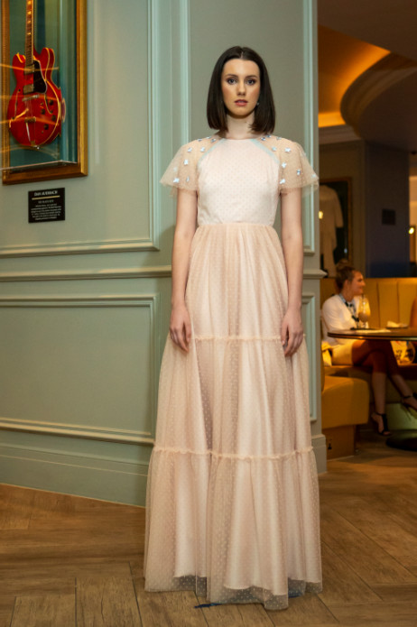 Louise’s ethereal collection of gowns and jumpsuits were inspired by the idea of creating beauty among the chaos we have all faced this year. Dreaming of brighter days, the designs are romantic, yet subtly playful and the muted pastel tones add to the dreamlike feel for the collection.