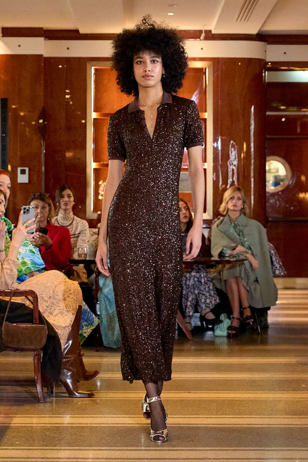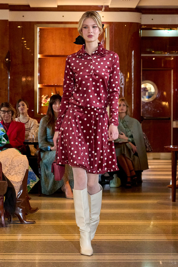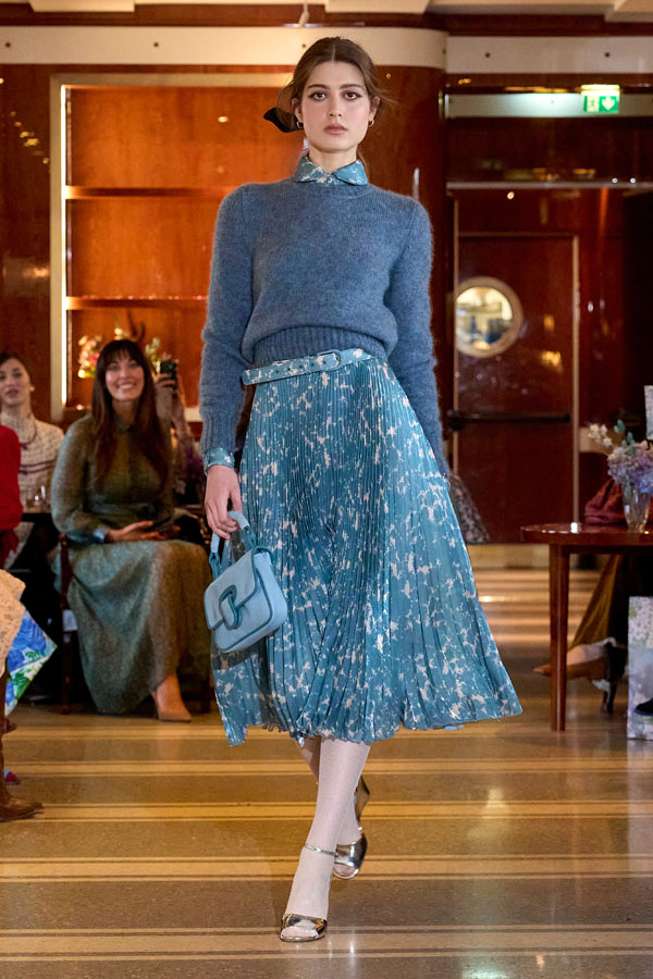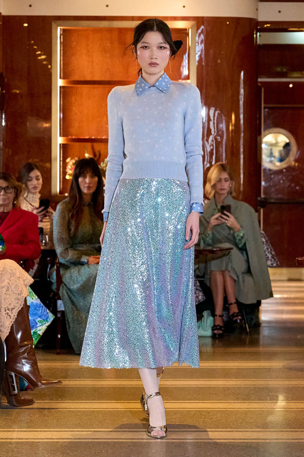 The color palette embodies three themes: The Sky—featuring shades of blue, ivory, and ice; The Earth—with deep chestnut, garnet, and mustard hues; and The Light—capturing the radiance of gold and platinum. Signature looks include polka-dot knitwear paired with slim velvet trousers, bustiers with flared skirts, and midnight blue mikado sheath dresses that appear to move with the wind.