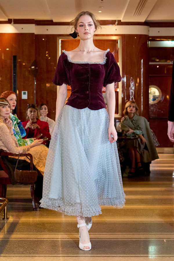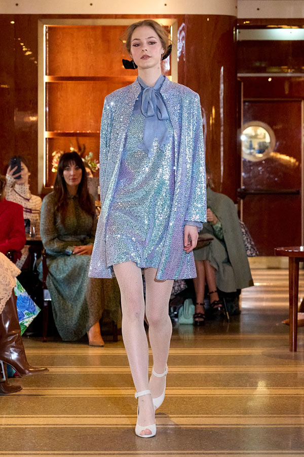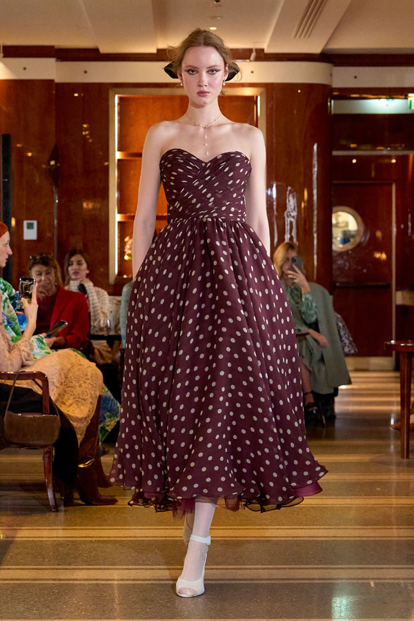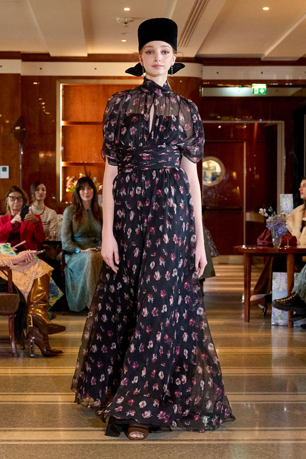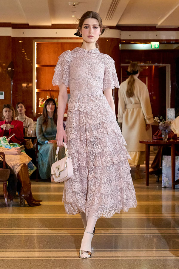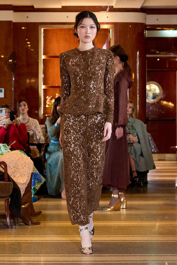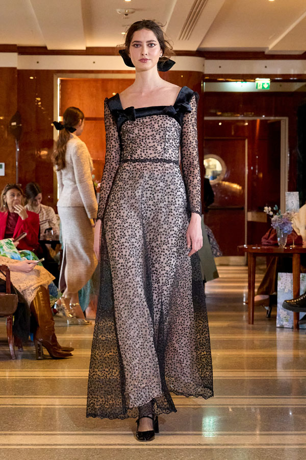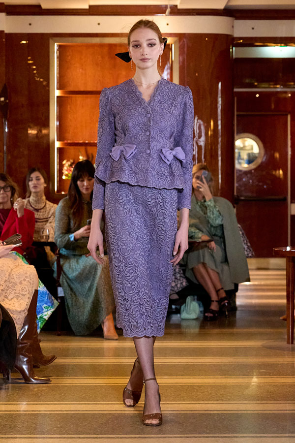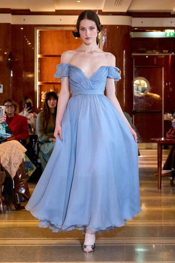 Drawing from its heritage, the brand presents sculptural yet delicate designs that highlight the waist while playing with ethereal and sensual elements. Luxurious fabrics such as warm tweeds, mohair, cotton velvet, and stretch taffeta are elegantly combined with georgette, organza, and intricate lace, interwoven with subtle lurex threads for a shimmering effect.