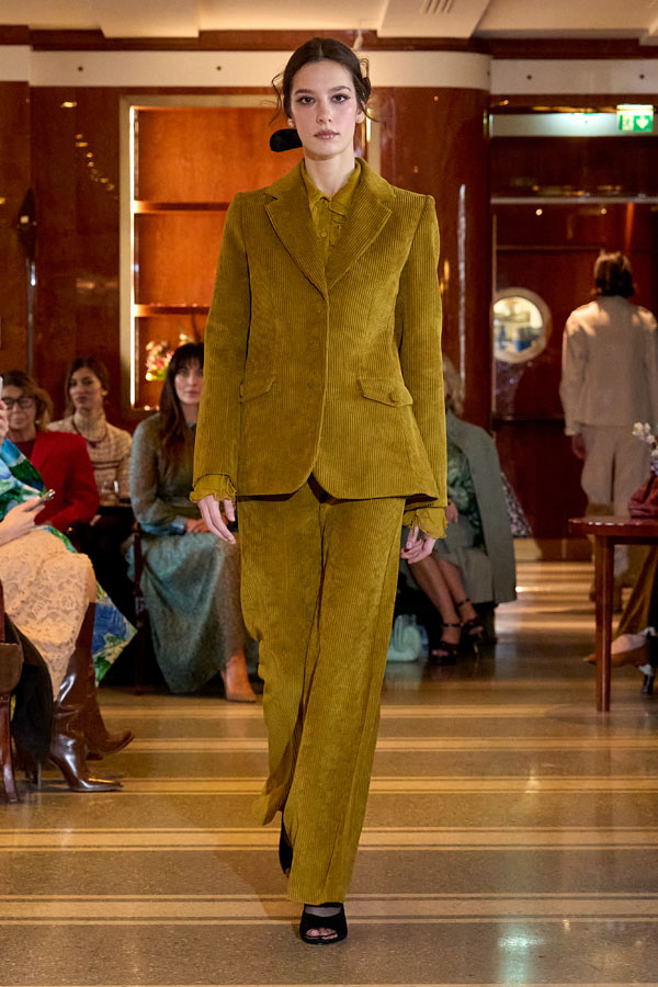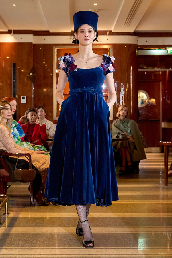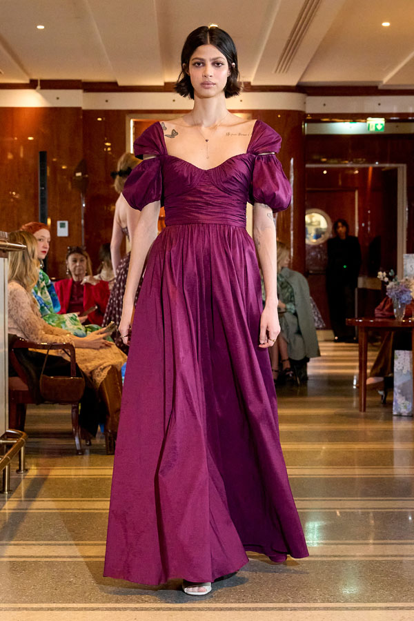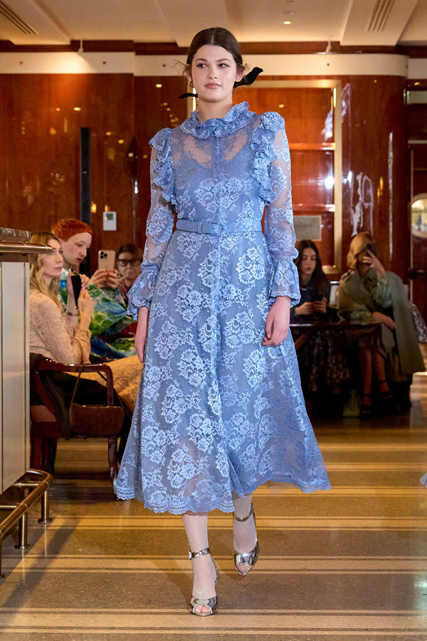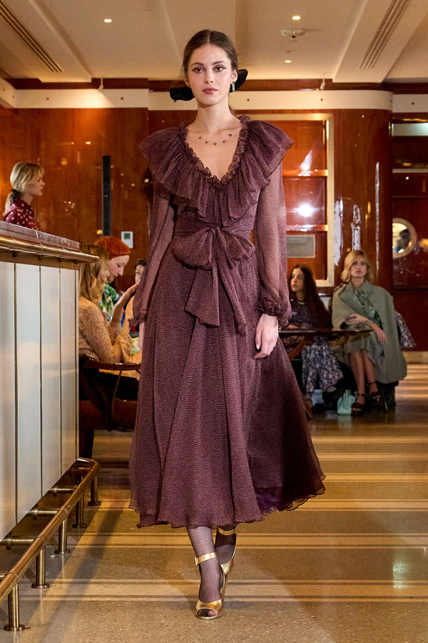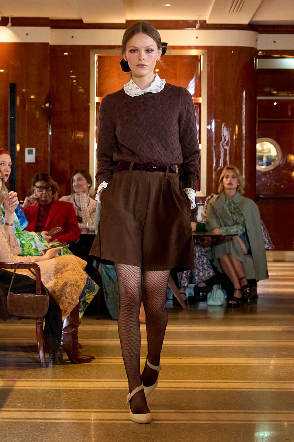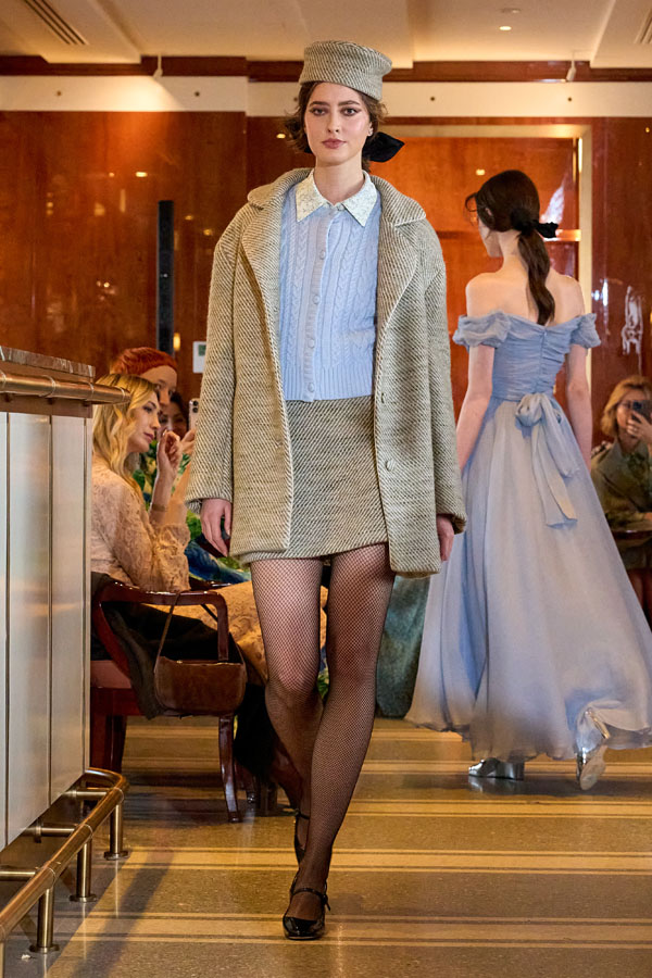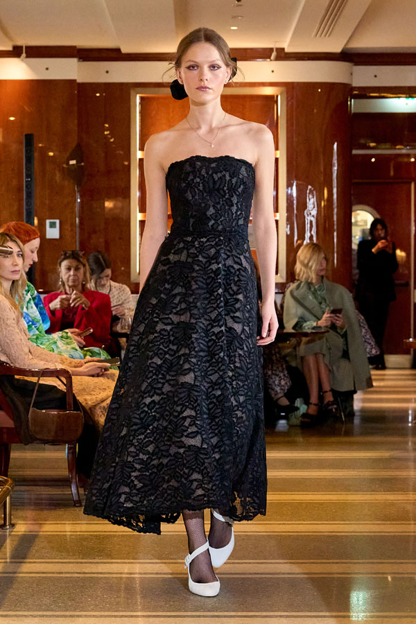 Drawing from its heritage, the brand presents sculptural yet delicate designs that highlight the waist while playing with ethereal and sensual elements. Luxurious fabrics such as warm tweeds, mohair, cotton velvet, and stretch taffeta are elegantly combined with georgette, organza, and intricate lace, interwoven with subtle lurex threads for a shimmering effect.