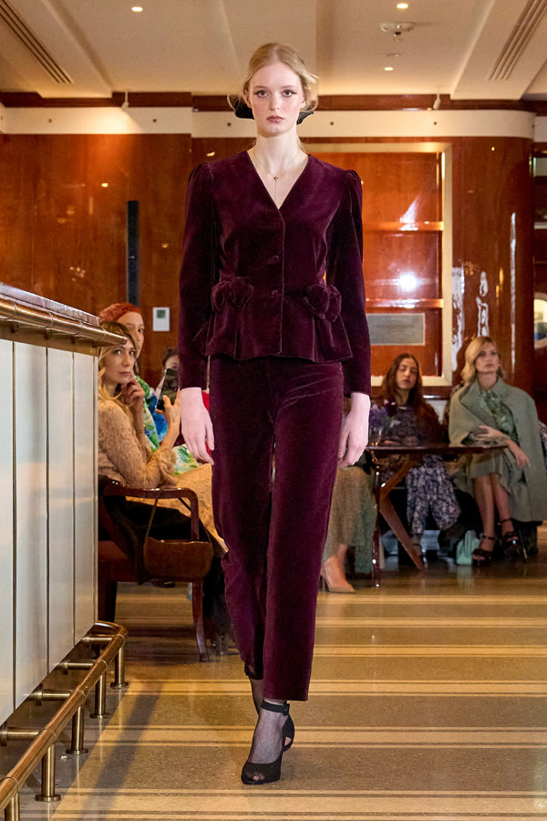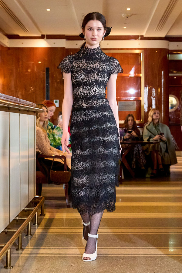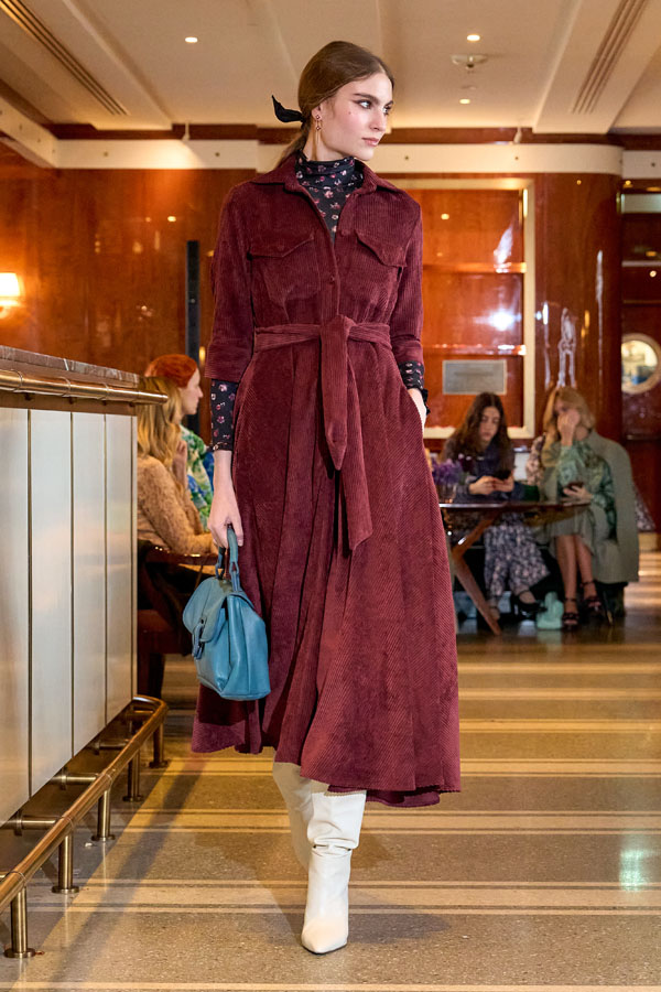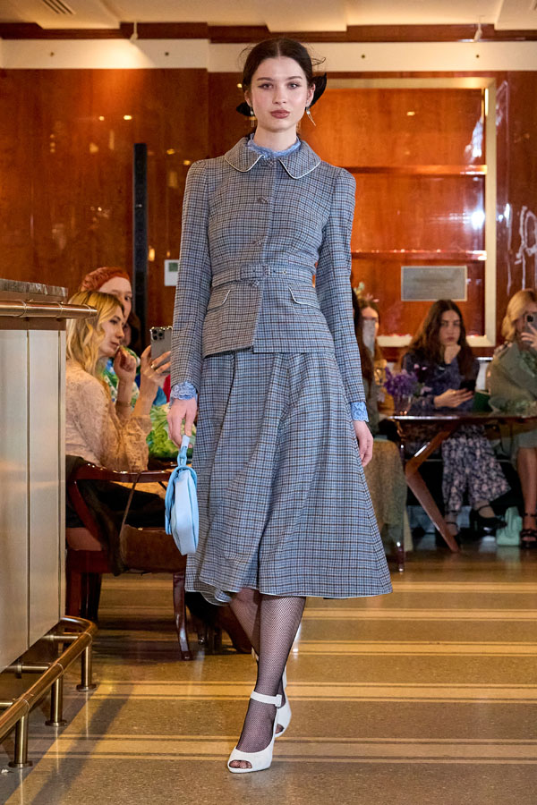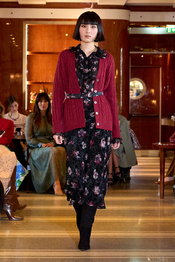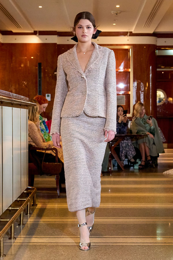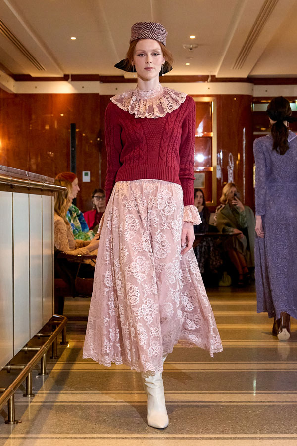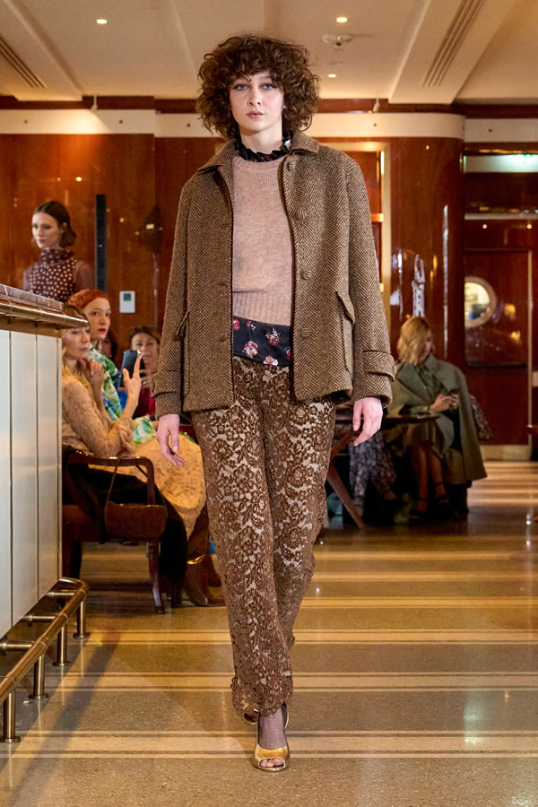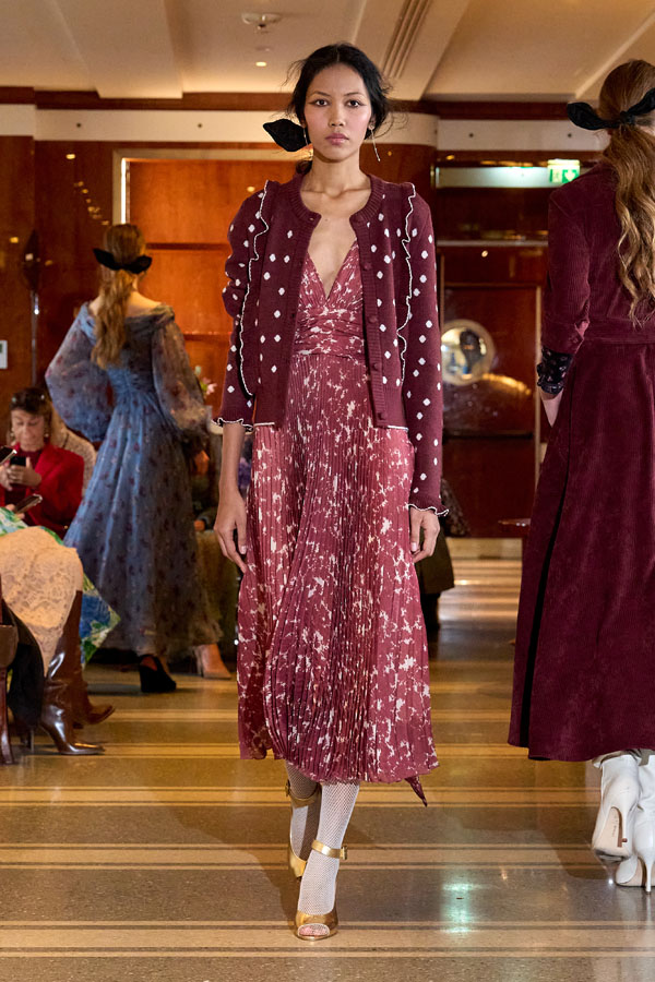 Drawing from its heritage, the brand presents sculptural yet delicate designs that highlight the waist while playing with ethereal and sensual elements. Luxurious fabrics such as warm tweeds, mohair, cotton velvet, and stretch taffeta are elegantly combined with georgette, organza, and intricate lace, interwoven with subtle lurex threads for a shimmering effect.