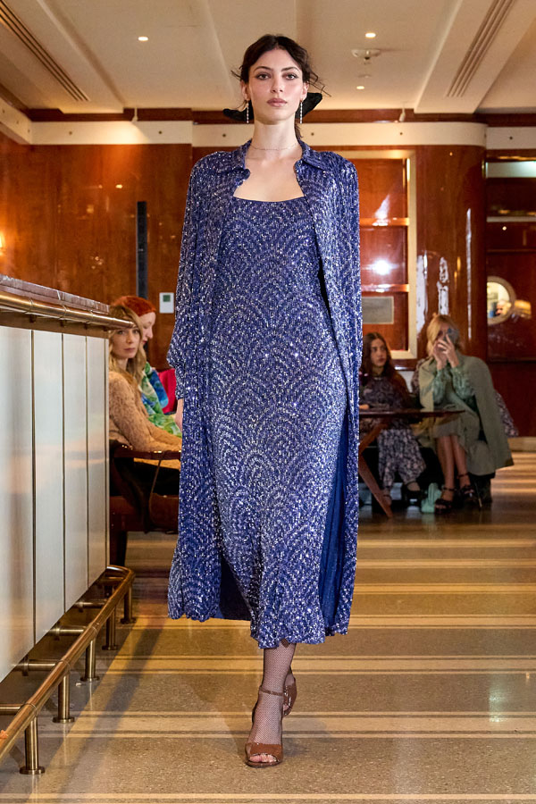 For eveningwear, shimmering organza gowns with gold-thread embroidery, platinum jersey ensembles, and dazzling sequin-adorned pieces take center stage, exuding a refined and modern sophistication.