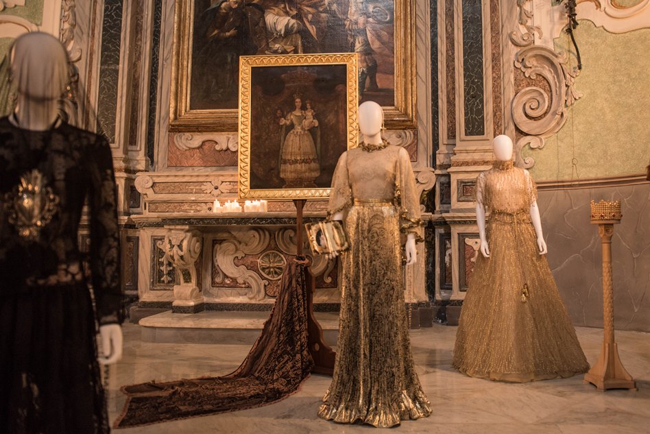 The multifaceted aspects of the sacredness of the popular tradition of this area are thus explored, underlining its powerful symbolic value. and at the same time celebrate the savoir-faire of Italian high fashion.