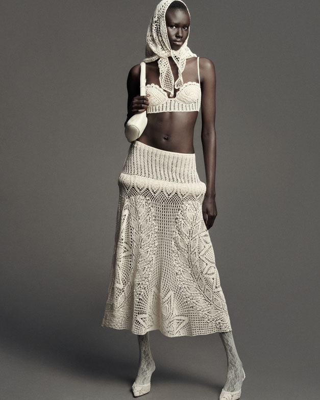 Magda Butrym’s enduring fascination with Slavic heritage is vividly present in the Pre-Fall 2025 collection, manifested through unexpected handmade crochet details. A semi-sheer crochet skirt adorned with floral doilies surprises with mini-pannier padding. Lace embellishes the bustier and hemline of a floral slip dress and peeks out from beneath leather shorts, while the grunge-inspired bride-to-be wears a white crochet veil. The collection also revisits the headscarf—a quintessentially Slavic code—reimagined in butter-soft leather, knitted mélange, or faded floral prints, exuding sharp, feminine chic.