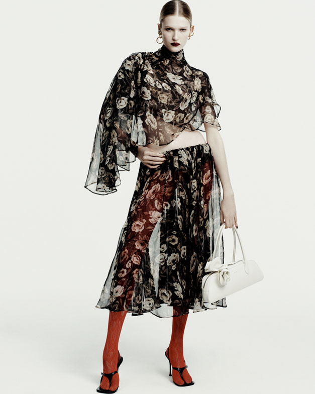 The collection’s fearless essence was inspired by the documented style of grunge icons such as PJ Harvey’s breezy vintage shifts, Courtney Love’s stage slip-dresses, Juliette Lewis’ broken-glamour, and Polish rock icon Kora’s unorthodox fashion. Real women inspire Magda Butrym, and the designer aimed to convey authentic attitude—not only through the spontaneous layering of a masculine black leather vest over a delicate sage-green floral chiffon dress but also in the models’ dynamic, lively poses choreographed by Pat Bogusławski in the lookbook.