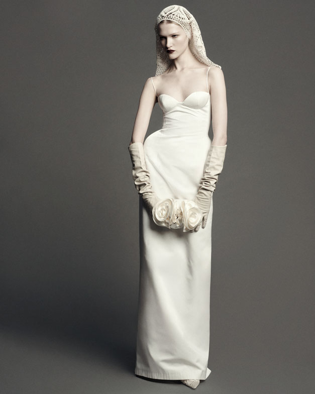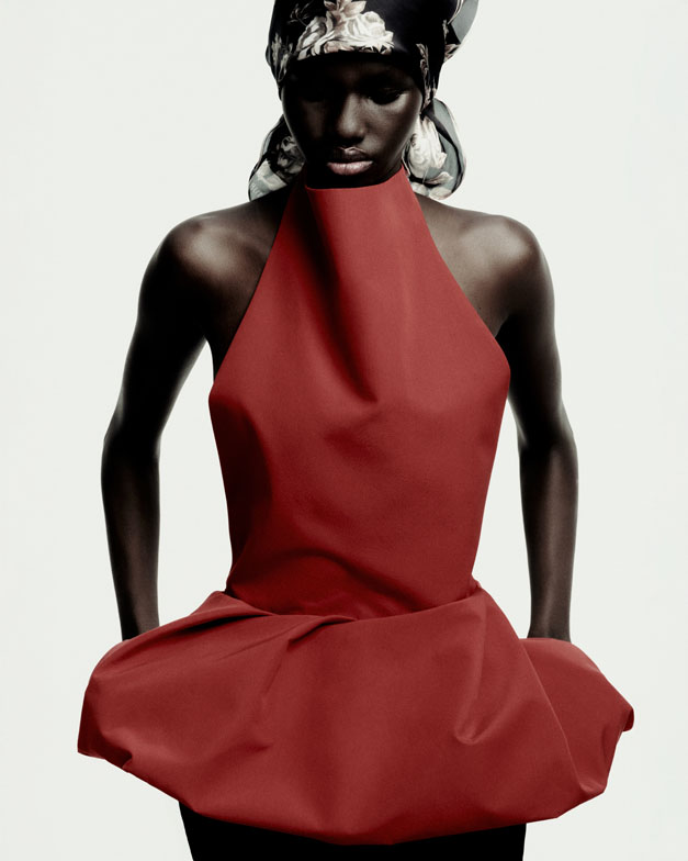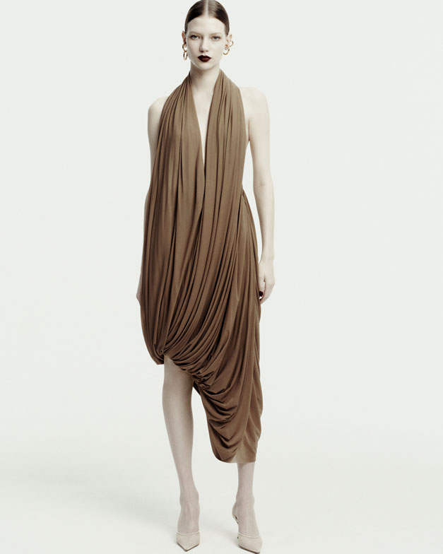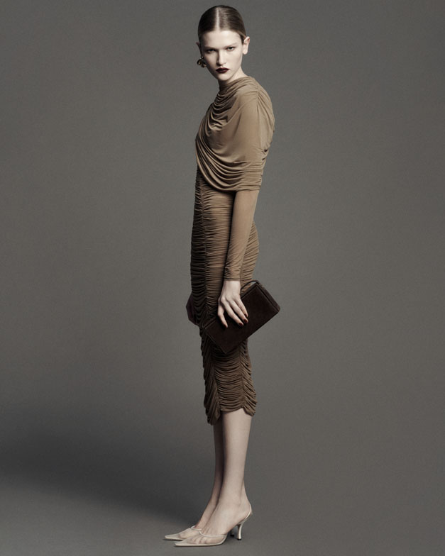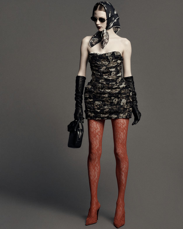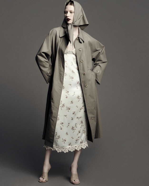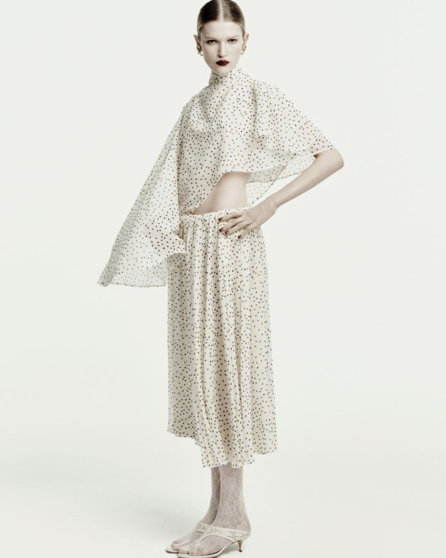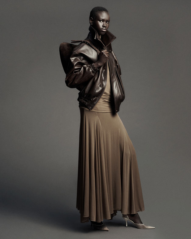 Beneath the grunge-inspired layers lies a space for unapologetic elegance—a form of rebellion in today’s fast-paced world. Statuesque refinement is showcased in a semi-sheer evening gown crafted from wire-structured silk, evoking the soft, sculptural beauty of a blossoming petal or the calla lilies immortalized by Robert Mapplethorpe. Polka-dotted noble silks, ruched dresses, billowy skirts, and cascading drapes of earthy, mocha-toned eveningwear embody undone femininity—a grunge perspective compellingly reimagined by the designer.