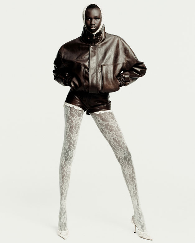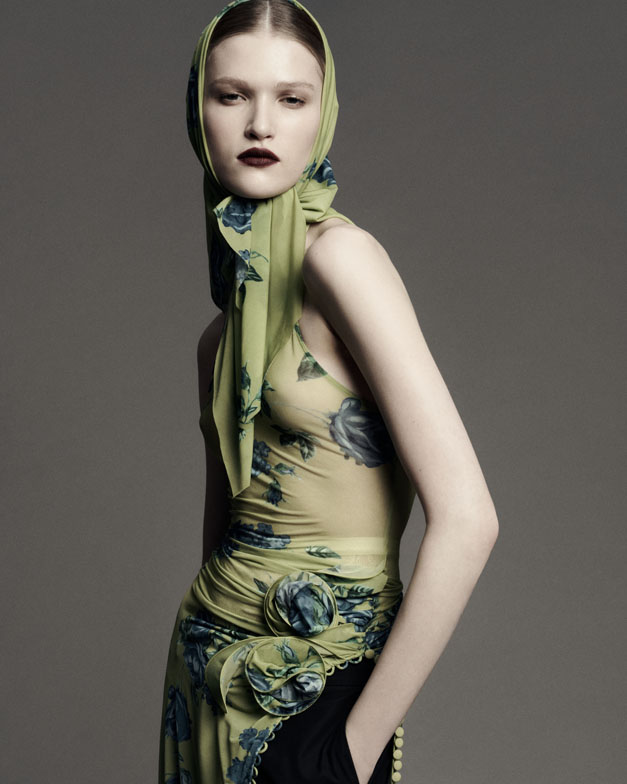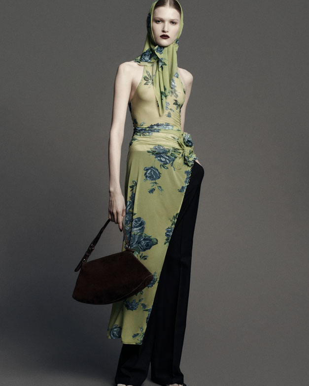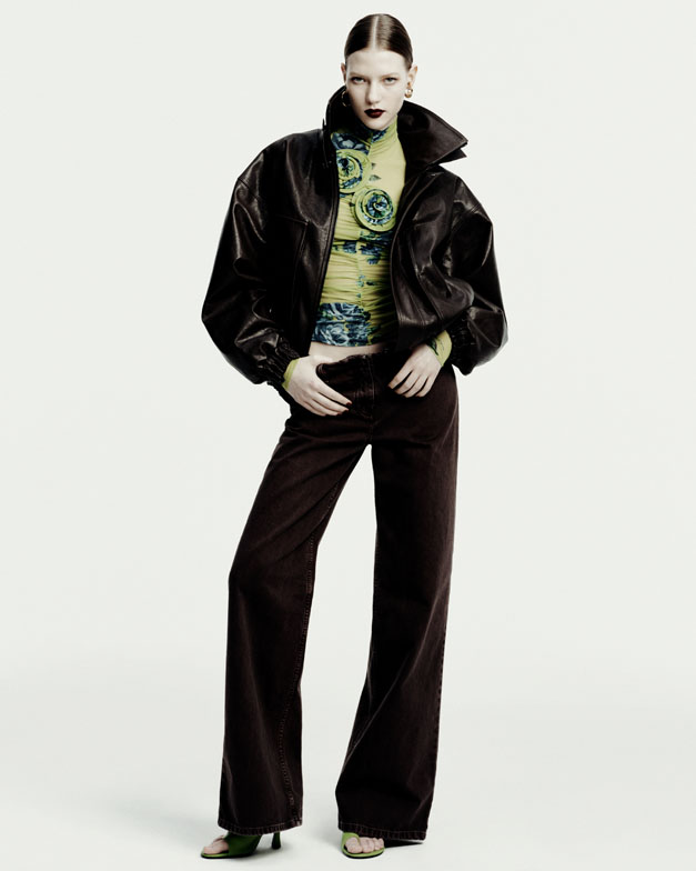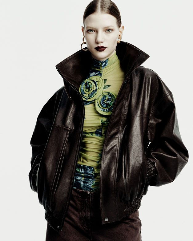 The collection’s fearless essence was inspired by the documented style of grunge icons such as PJ Harvey’s breezy vintage shifts, Courtney Love’s stage slip-dresses, Juliette Lewis’ broken-glamour, and Polish rock icon Kora’s unorthodox fashion. Real women inspire Magda Butrym, and the designer aimed to convey authentic attitude—not only through the spontaneous layering of a masculine black leather vest over a delicate sage-green floral chiffon dress but also in the models’ dynamic, lively poses choreographed by Pat Bogusławski in the lookbook.