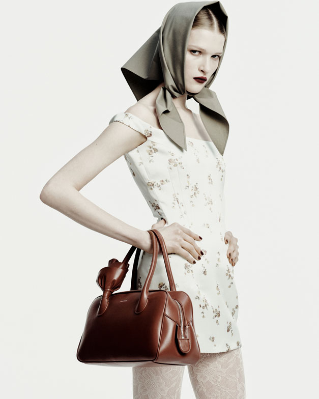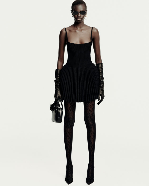 Magda Butrym’s enduring fascination with Slavic heritage is vividly present in the Pre-Fall 2025 collection, manifested through unexpected handmade crochet details. A semi-sheer crochet skirt adorned with floral doilies surprises with mini-pannier padding. Lace embellishes the bustier and hemline of a floral slip dress and peeks out from beneath leather shorts, while the grunge-inspired bride-to-be wears a white crochet veil. The collection also revisits the headscarf—a quintessentially Slavic code—reimagined in butter-soft leather, knitted mélange, or faded floral prints, exuding sharp, feminine chic.