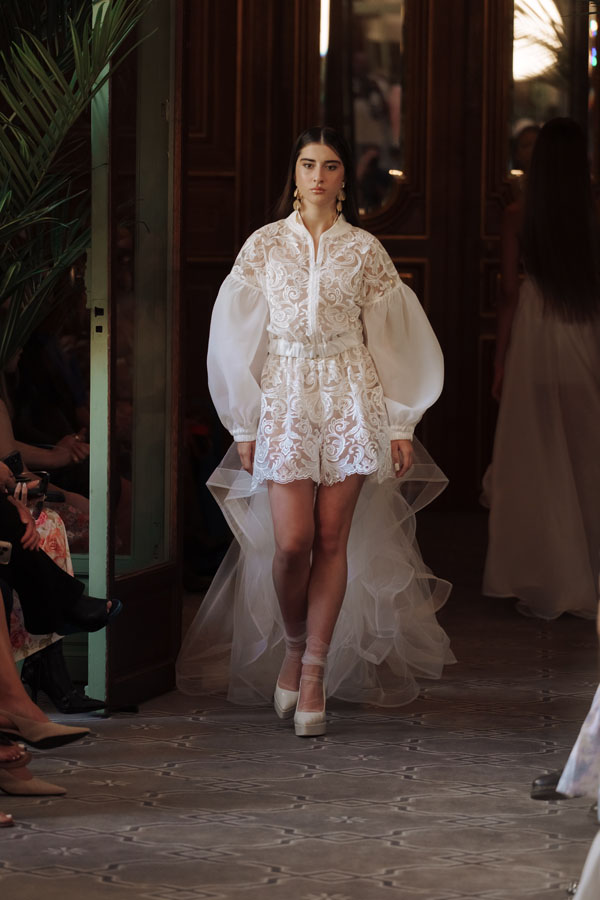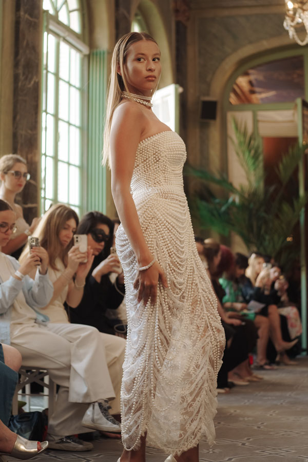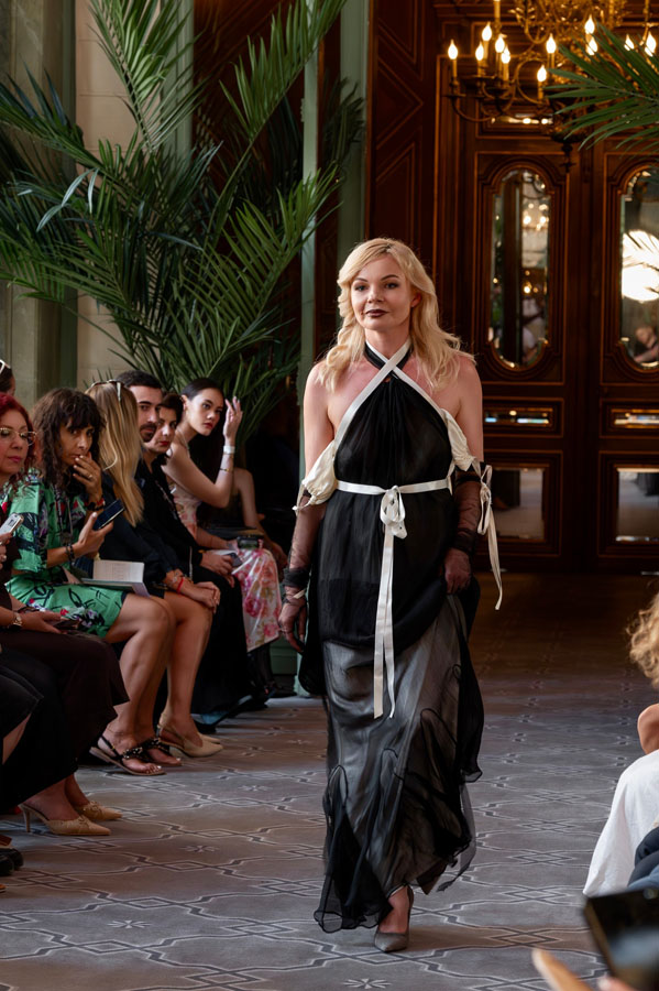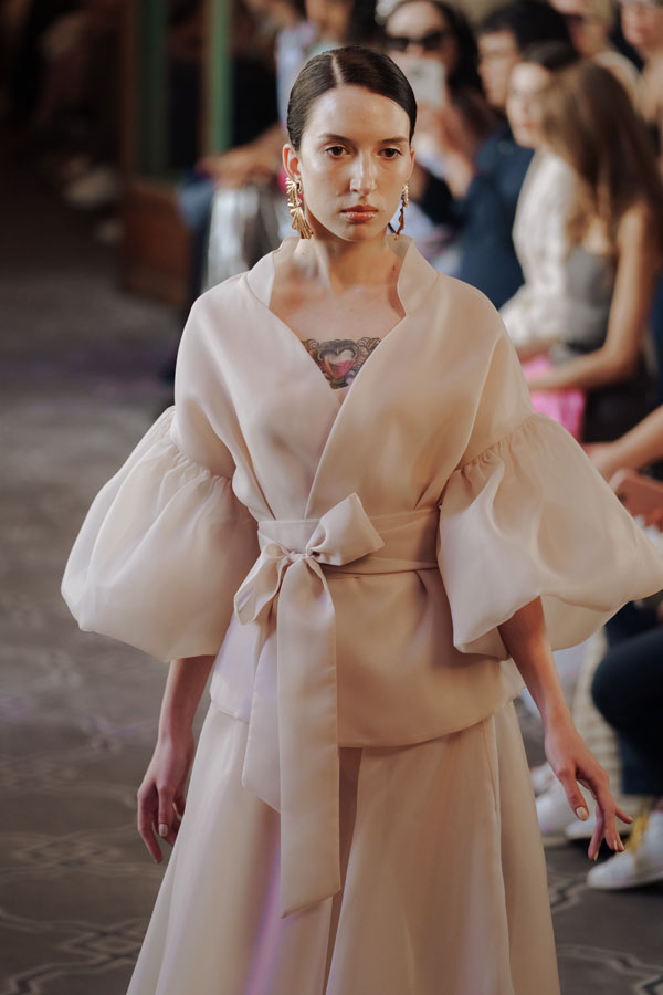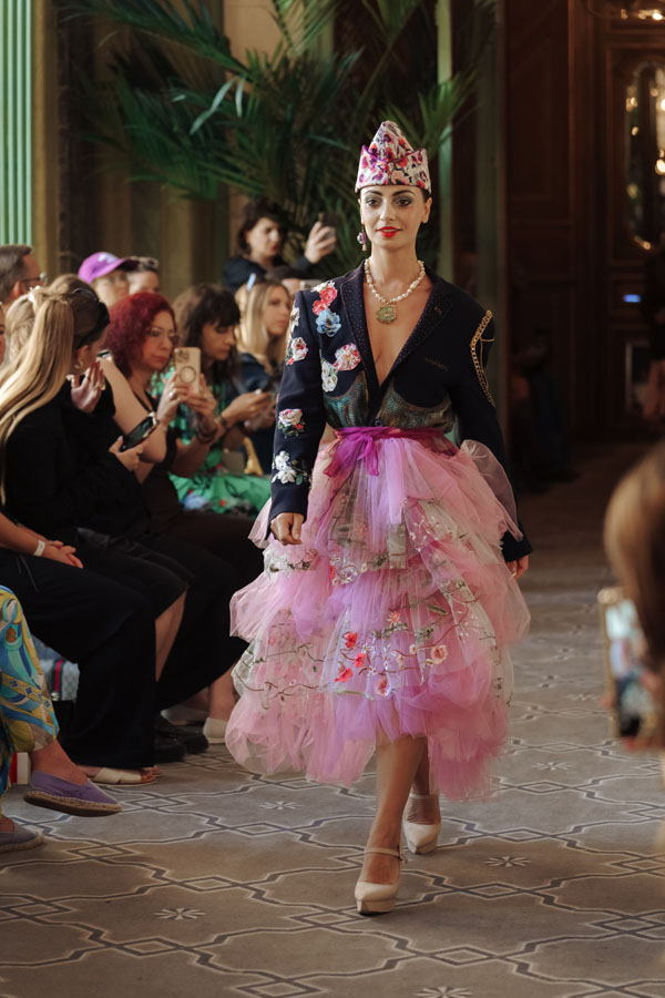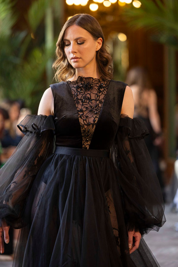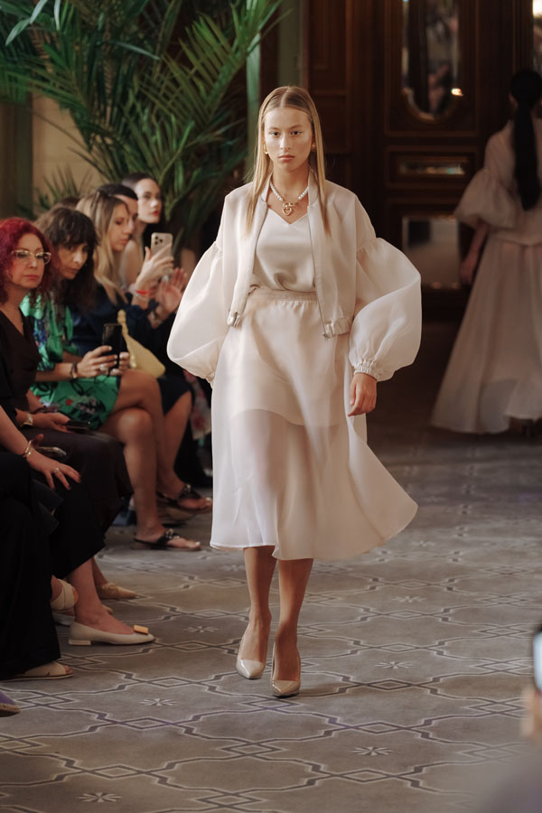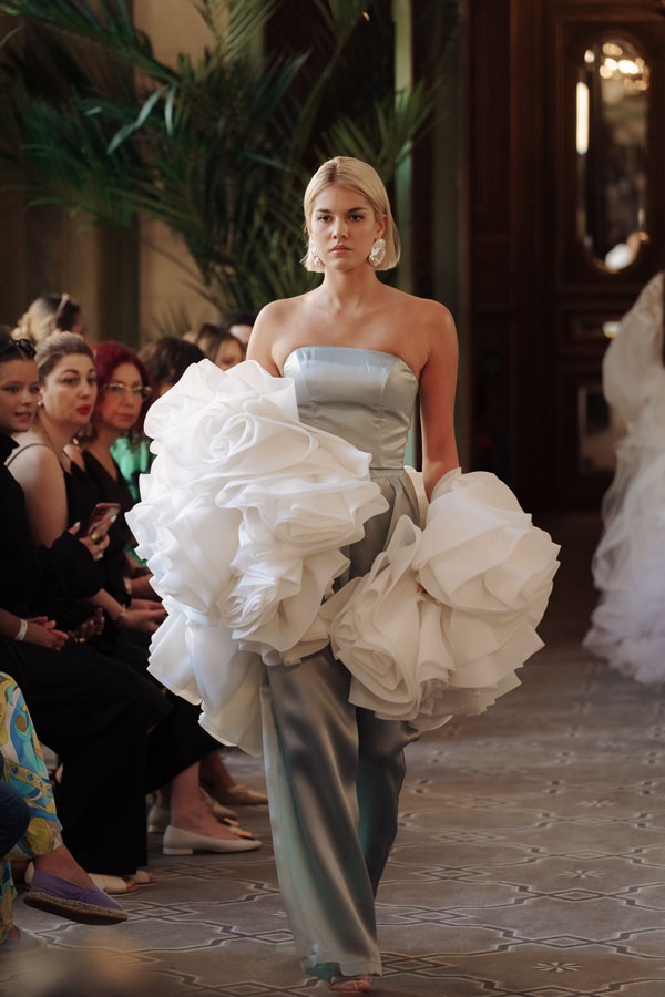 Among the most poetic collections was that of Radapola, the brand founded by Ukrainian-born designer Yulia Radapola, now based in Bulgaria. Every garment is handmade and can take up to 50 hours to complete.“My fashion celebrates the strong, unforgettable woman, someone who shines in clothes that don’t follow trends but rise above them,” says the designer.
