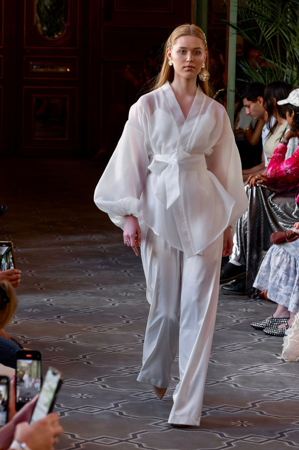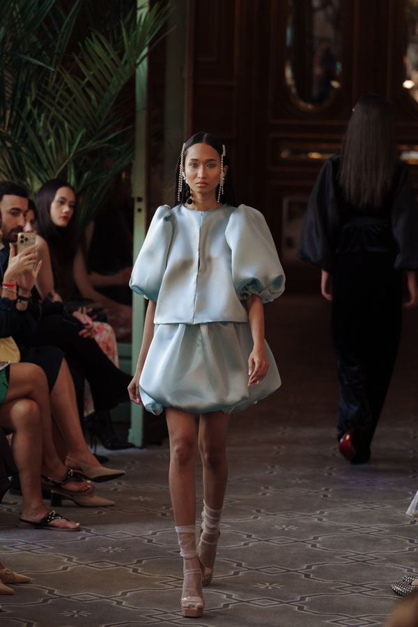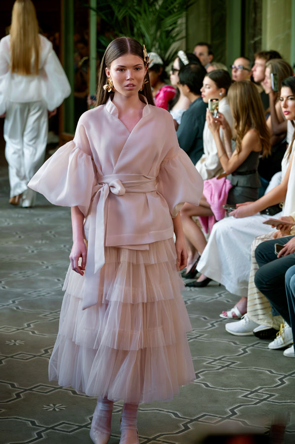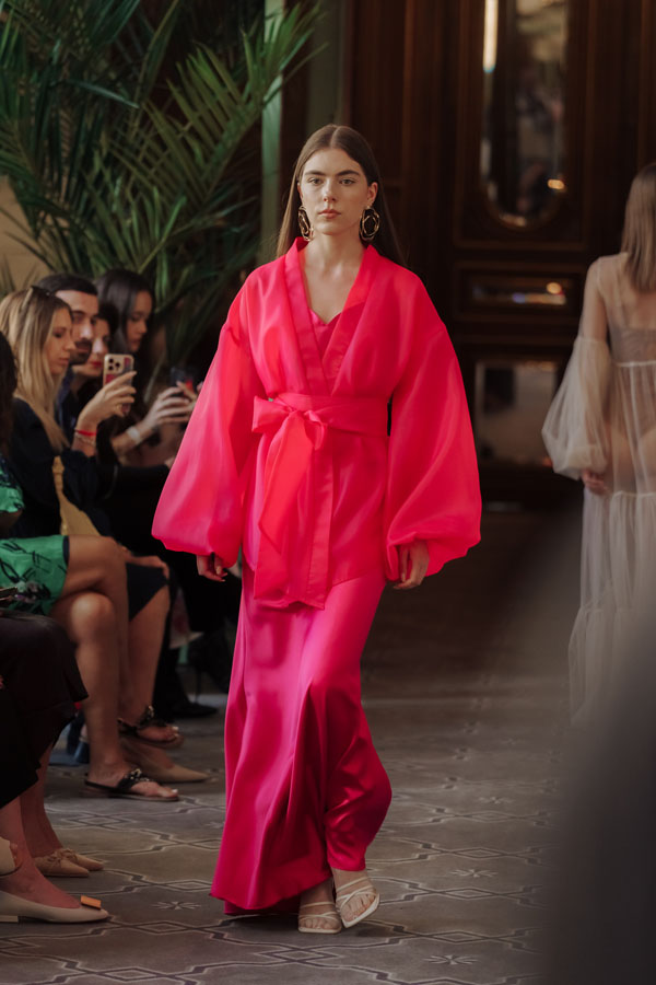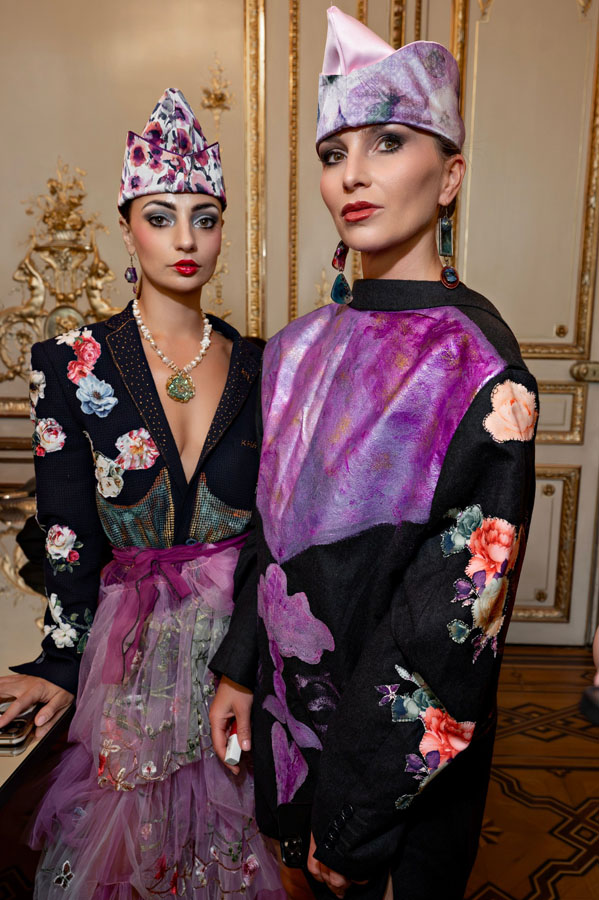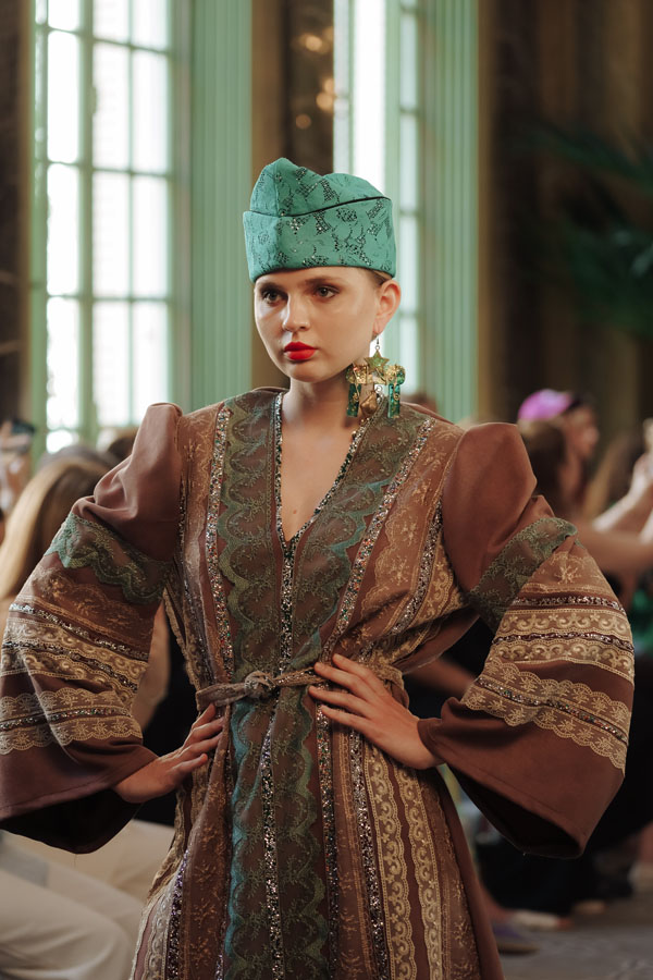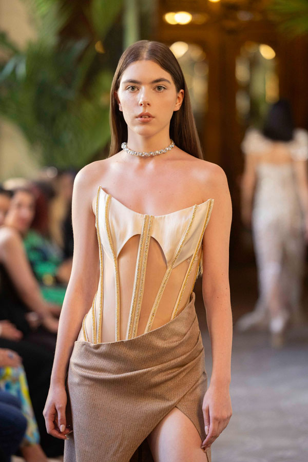 Among the most poetic collections was that of Radapola, the brand founded by Ukrainian-born designer Yulia Radapola, now based in Bulgaria. Every garment is handmade and can take up to 50 hours to complete.“My fashion celebrates the strong, unforgettable woman, someone who shines in clothes that don’t follow trends but rise above them,” says the designer.