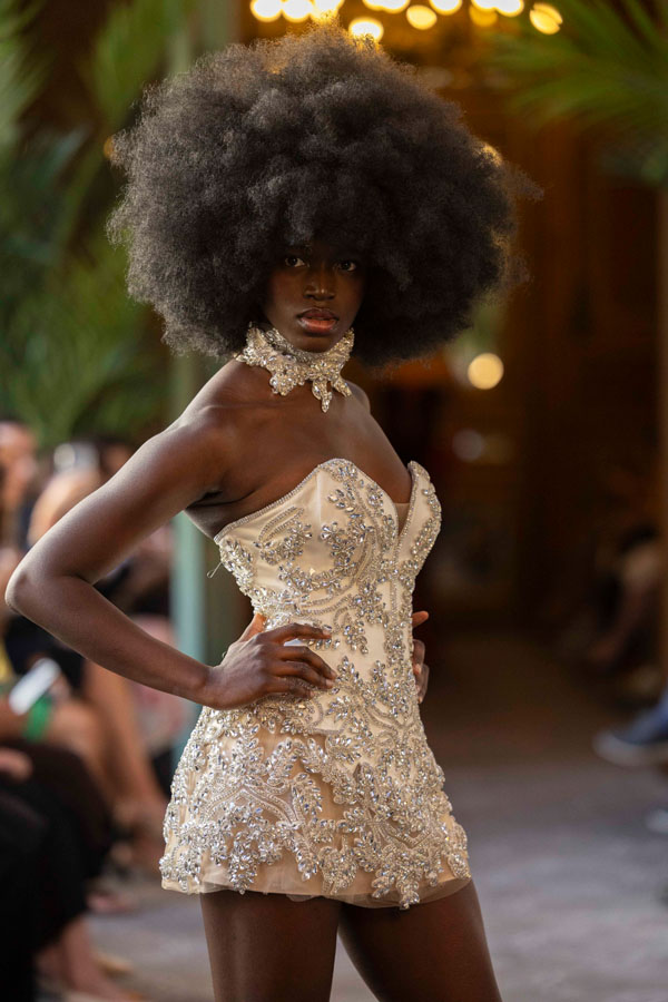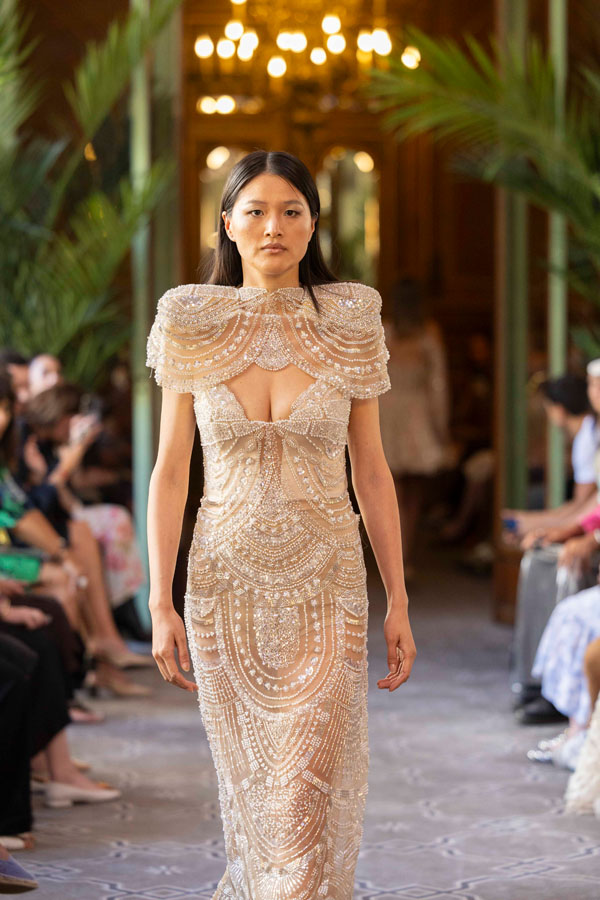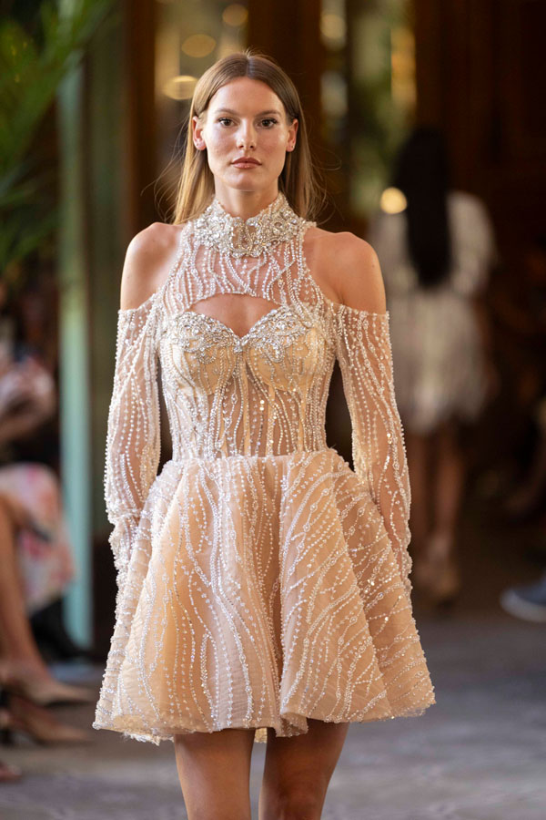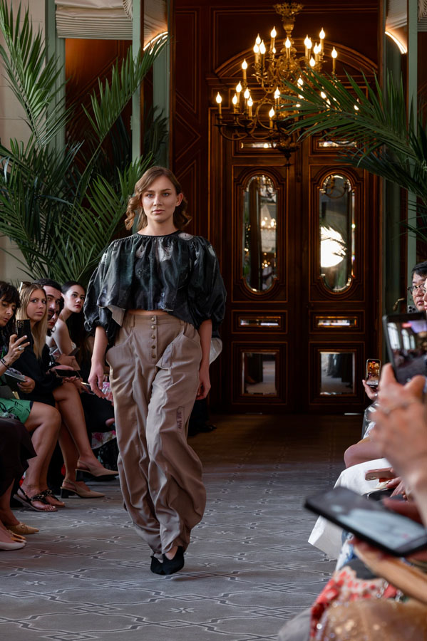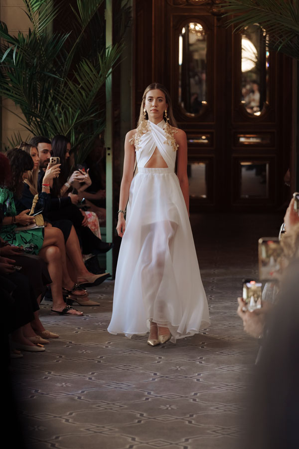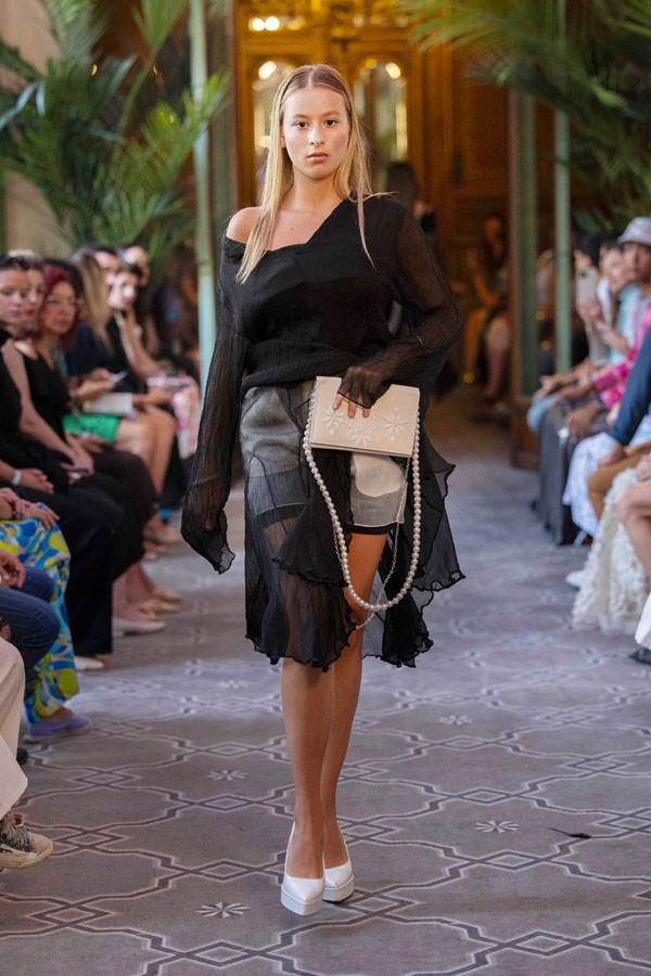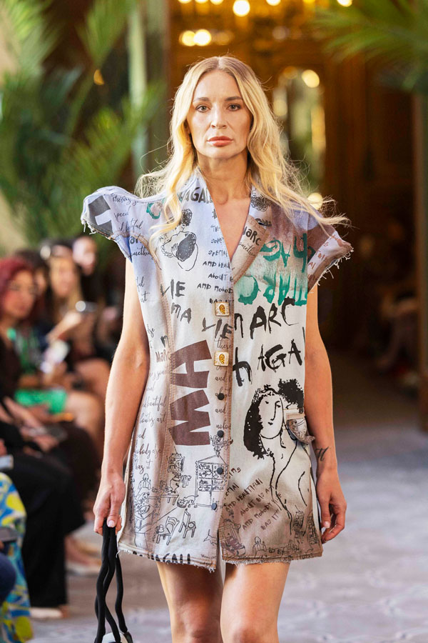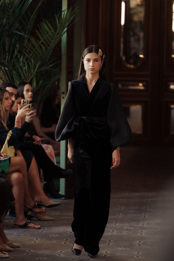 Among the most poetic collections was that of Radapola, the brand founded by Ukrainian-born designer Yulia Radapola, now based in Bulgaria. Every garment is handmade and can take up to 50 hours to complete.“My fashion celebrates the strong, unforgettable woman, someone who shines in clothes that don’t follow trends but rise above them,” says the designer.