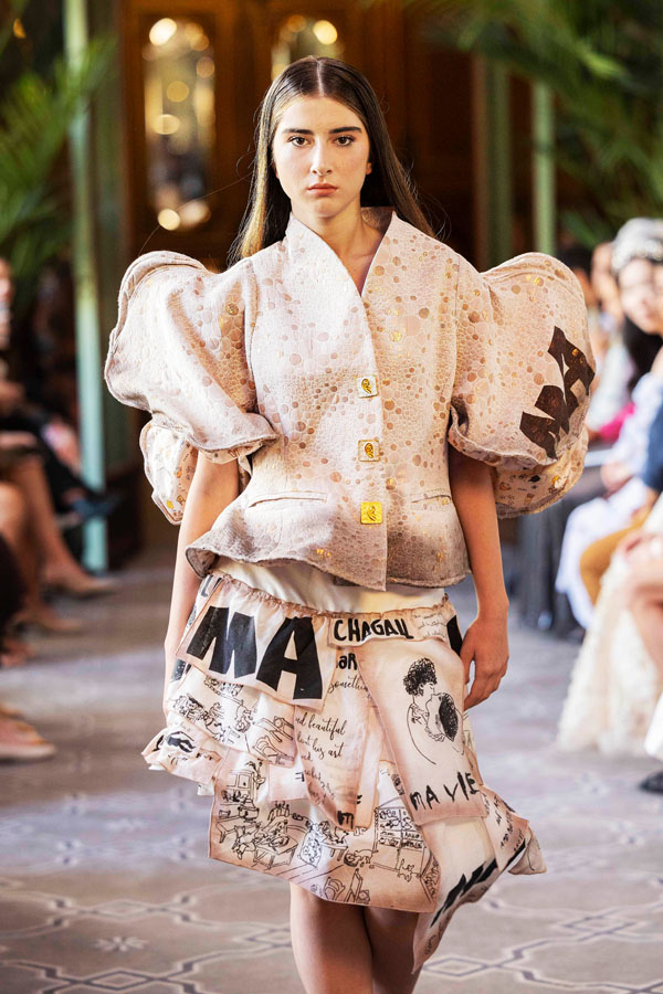 Davidova’s collection, MA VIE, titled after Chagall’s memoir, featured sculptural garments using a technique she calls “floating clothes,” where wire is embedded in the fabric to create light, moving forms.“It’s like the clothes stepped right out of a painting,” she explained.