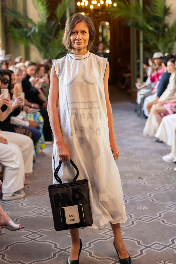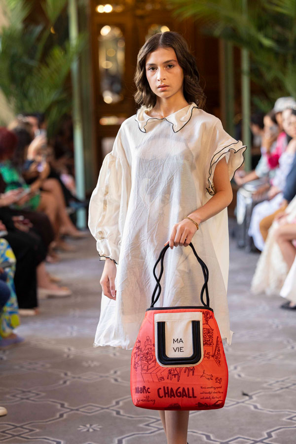 The pieces, decorated with embroidery and custom prints inspired by Chagall’s works, are made from natural materials such as cotton, linen, silk and viscose. She also designed and crafted all accessories shown, including original handbags.