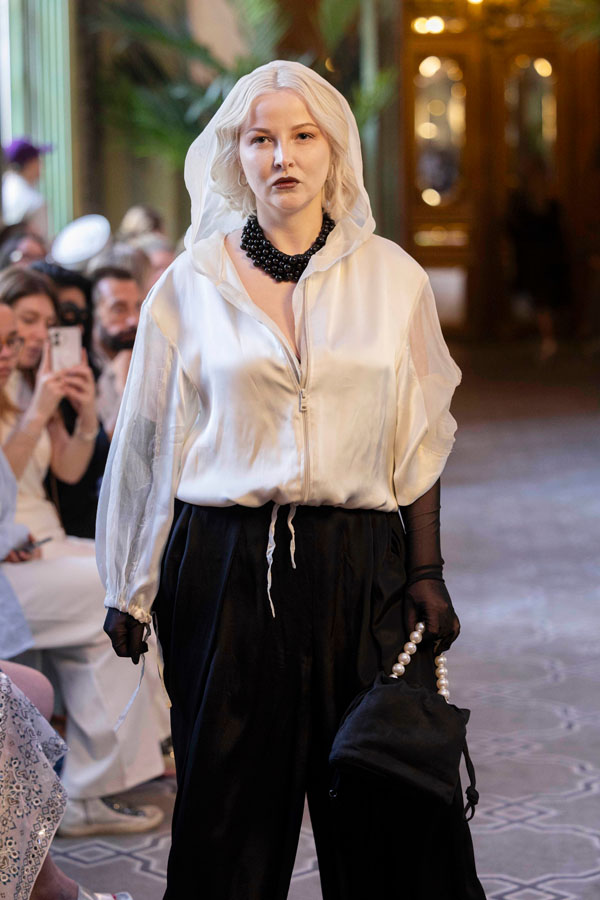 T.Efremova’s collection played in black and white, with sheer fabrics and sleek silhouettes creating a visual rhythm. Her looks evoke mysterious, elegant women, gloved and graceful, like characters stepping out of a Chagall painting. Efremova, who has already shown in Paris, Turkey, and China, focuses on exclusive capsules and custom-made creations.“I’m proud to share my hometown with Chagall. My collection is rooted in that same soil, and expresses that legacy in a modern way.”