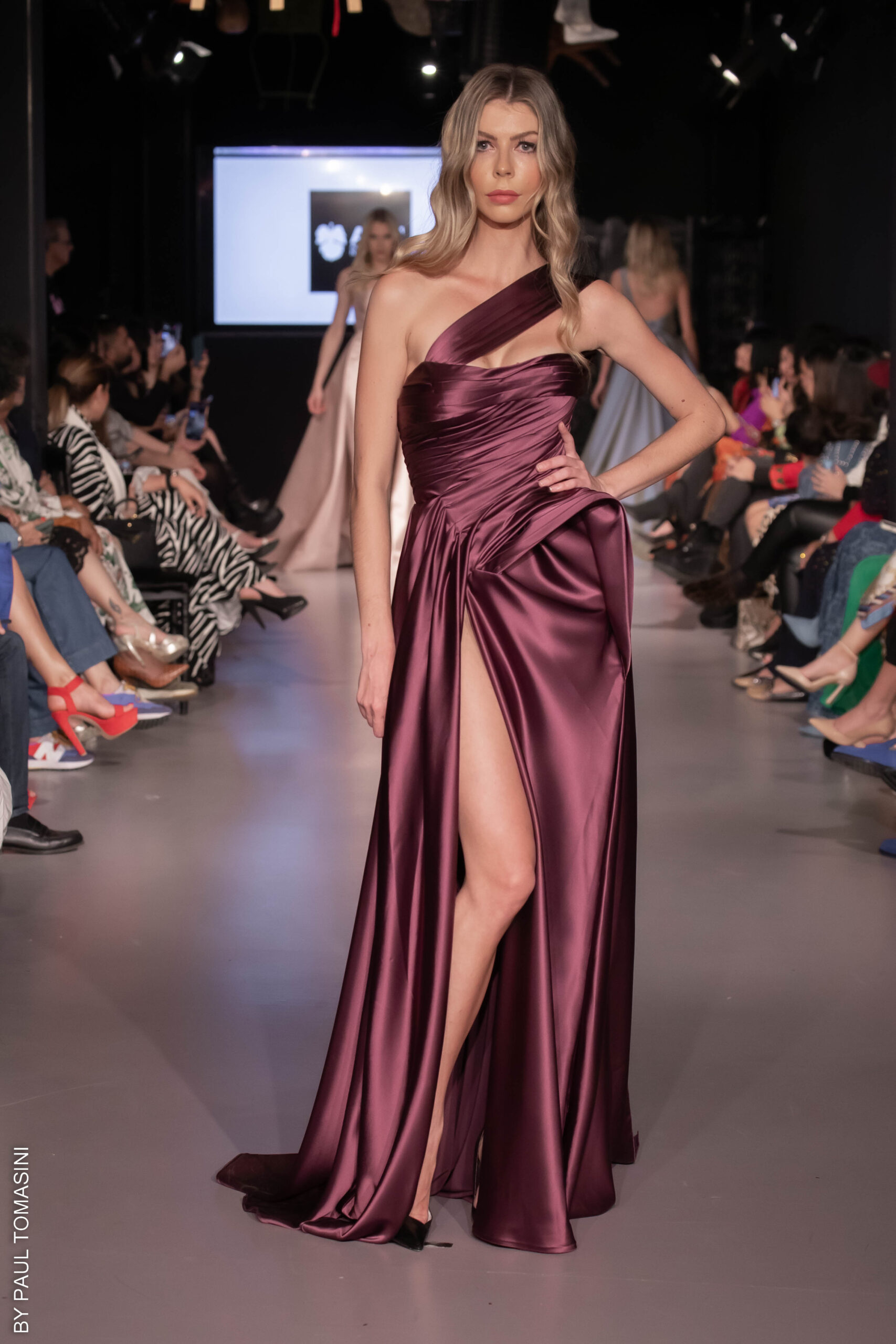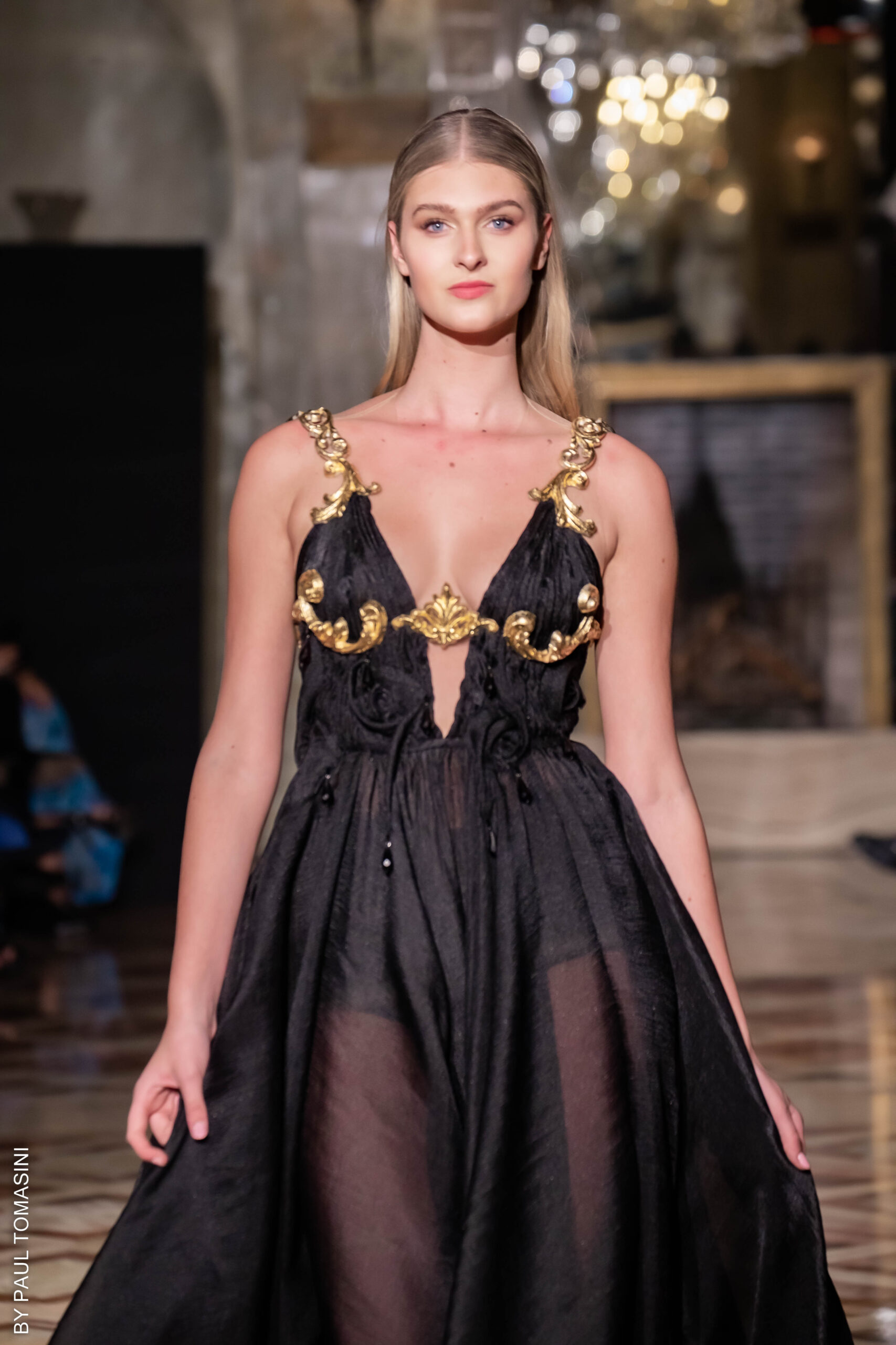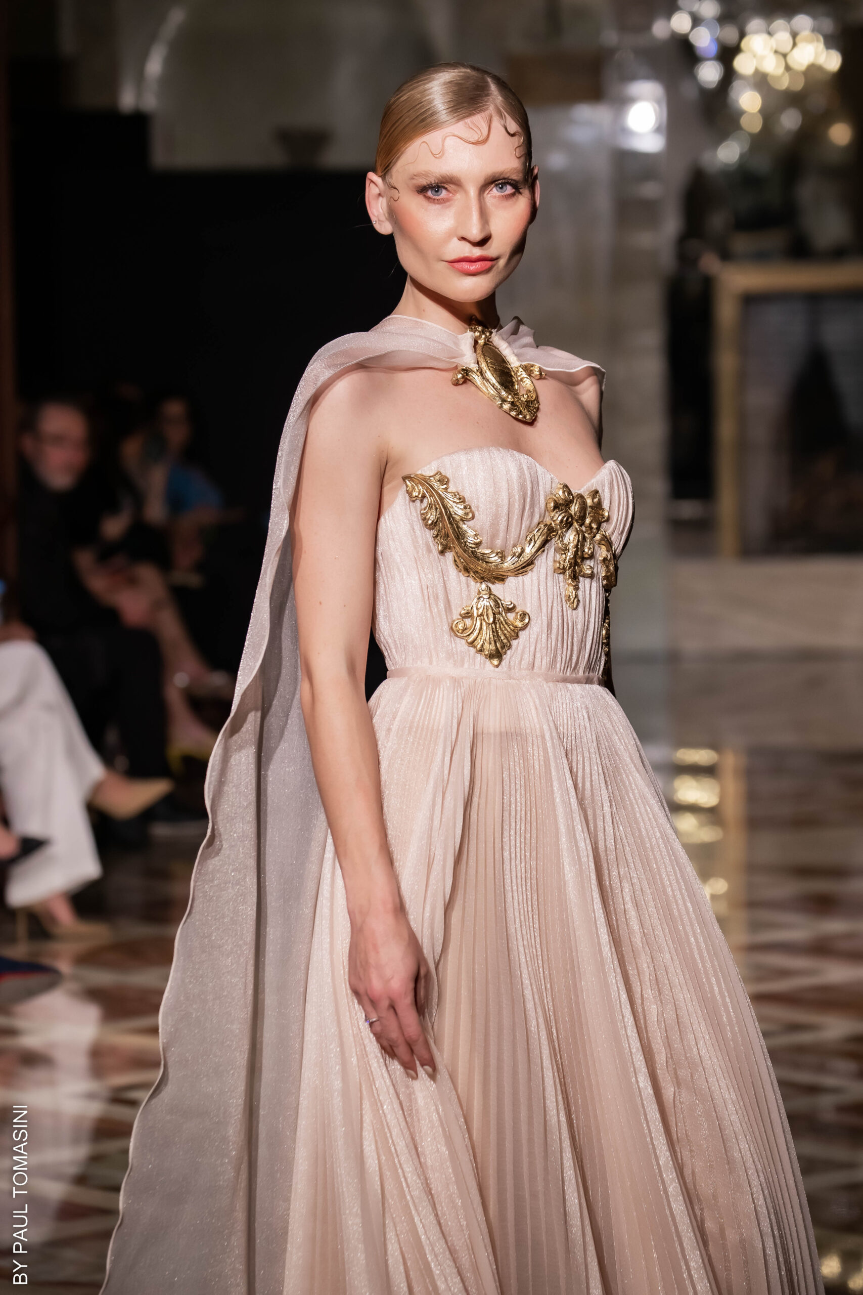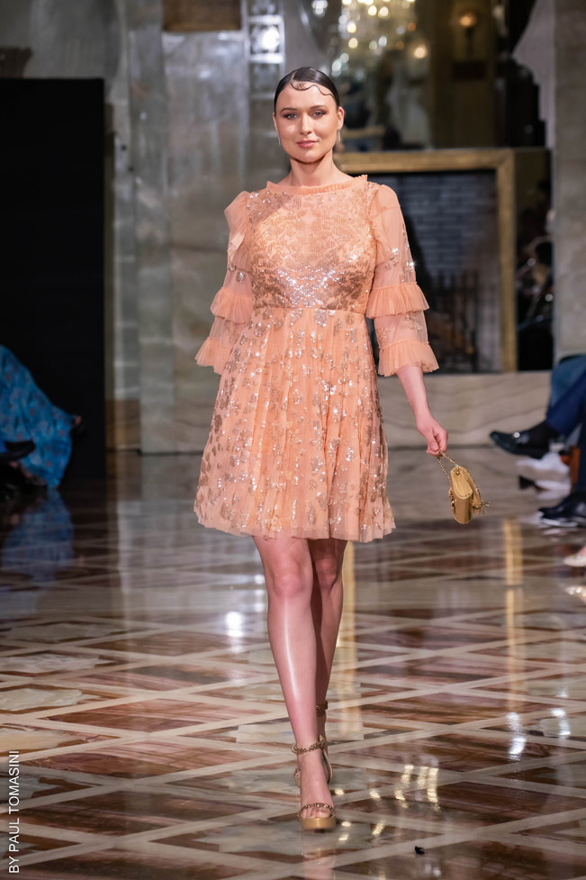 A voluptuous icon of surrealism thanks to Dali, the famous Lips sofa is reinterpreted draped in burgundy taffeta. Mermaid gowns in beige tulle embroidered with cabochons or fringes of golden sequins emphasizing necklines claim the music hall spirit. La Dolce Vita is radicalized with tuxedos enhanced with feathers. Transparencies of soft pink tulle sprinkled with crystals and extravagant embroidery complete this dreamlike and burlesque vision. Maxi dresses in crumpled tulle reveal the audacity of this first muse of glamour.A sulfurous diva without self-censorship and an unbridled style.