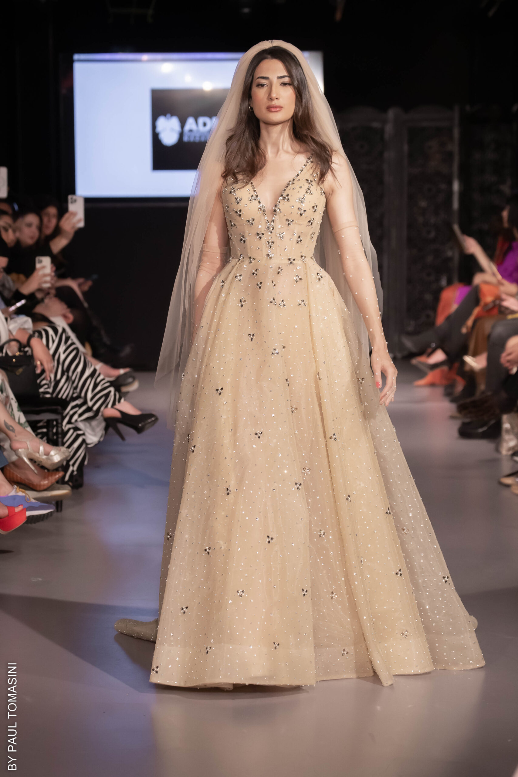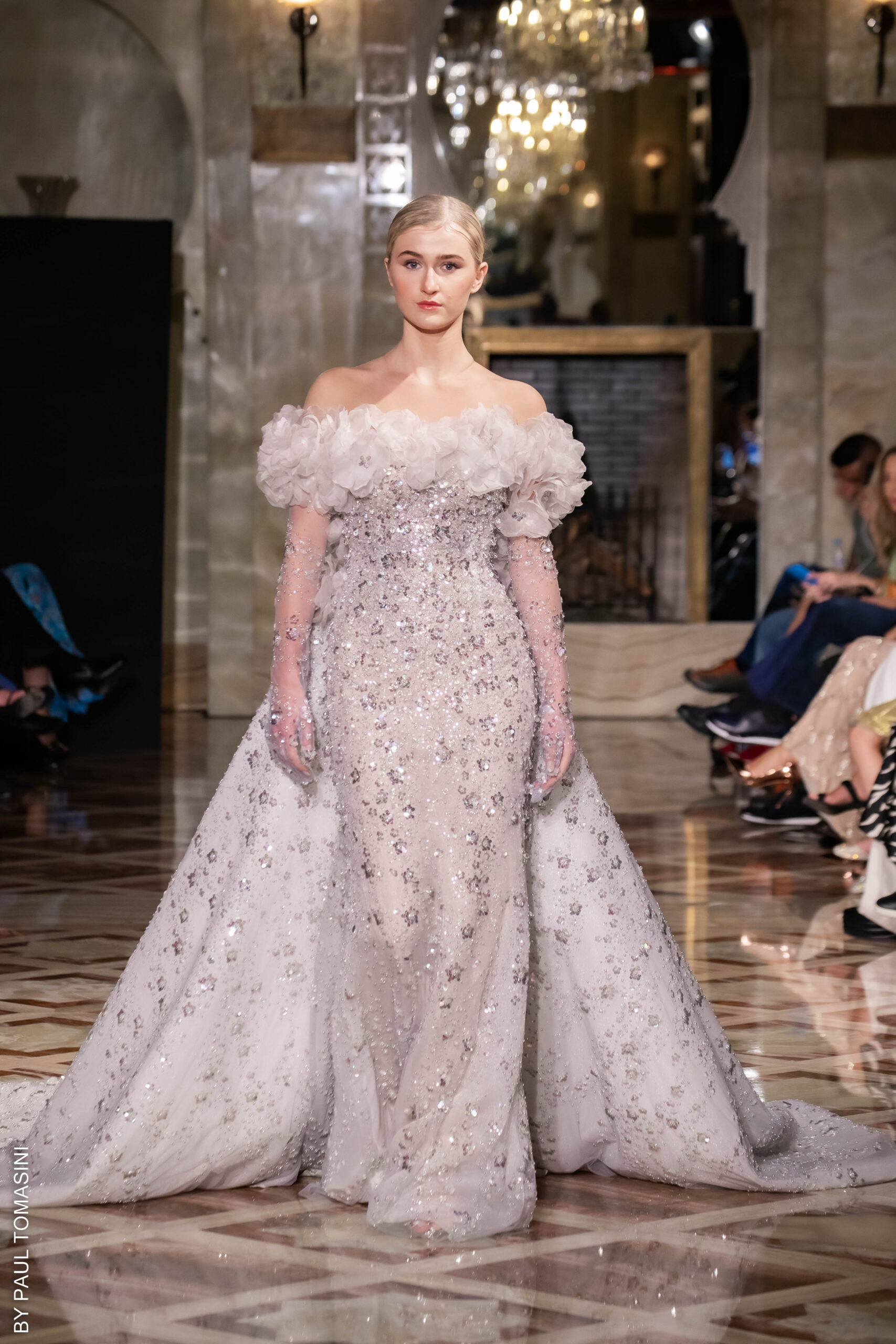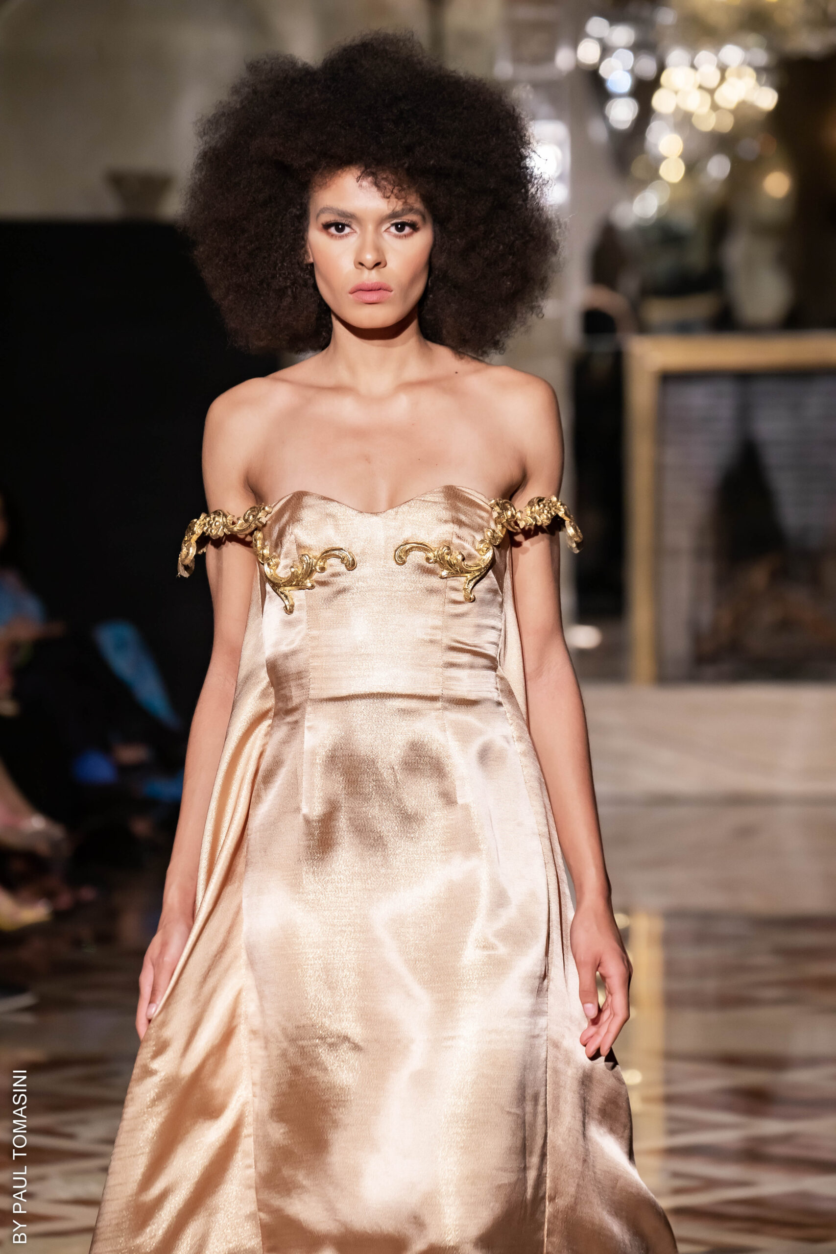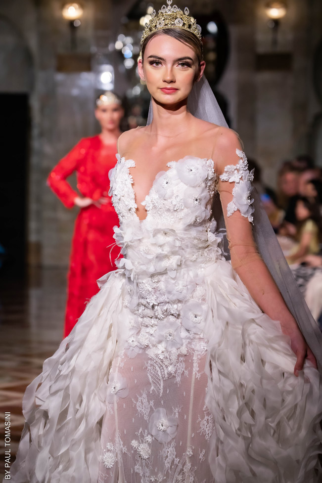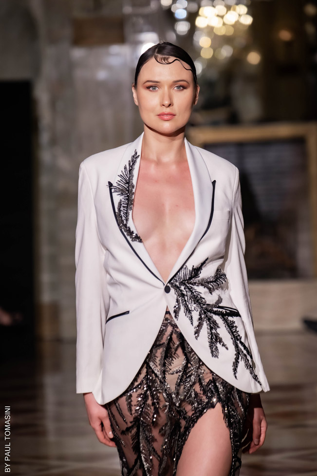 She receives her clients by appointment in her private showroom, in the refined comfort of a warm, immaculate white salon, very glamorous, totally couture. A number of celebrities have been carried away by the magic and talent of the designer who stages prestigious weddings and majestic parties for French and international clients.