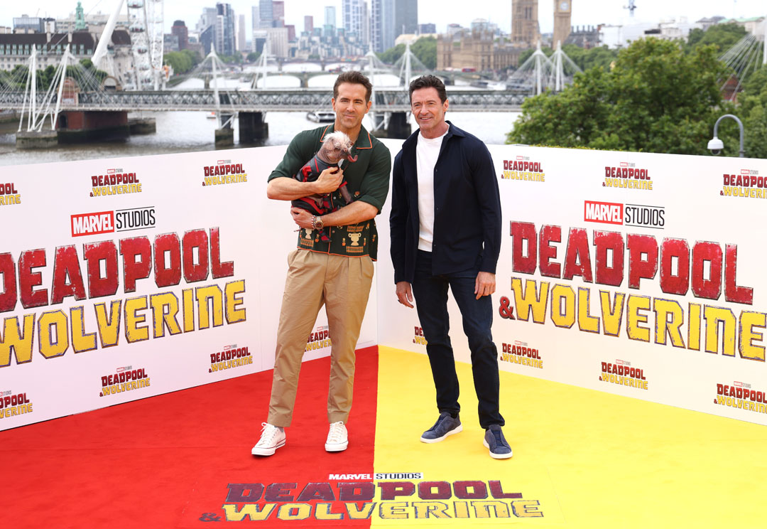 (L to R) Peggy aka ‘Dogpool’, Ryan Reynolds and Hugh Jackman attend the UK Photocall of Marvel Studios’ ‘Deadpool & Wolverine’ at IET London, London on July 12th, 2024. (Photo by StillMoving.Net for The Walt Disney Company Limited)