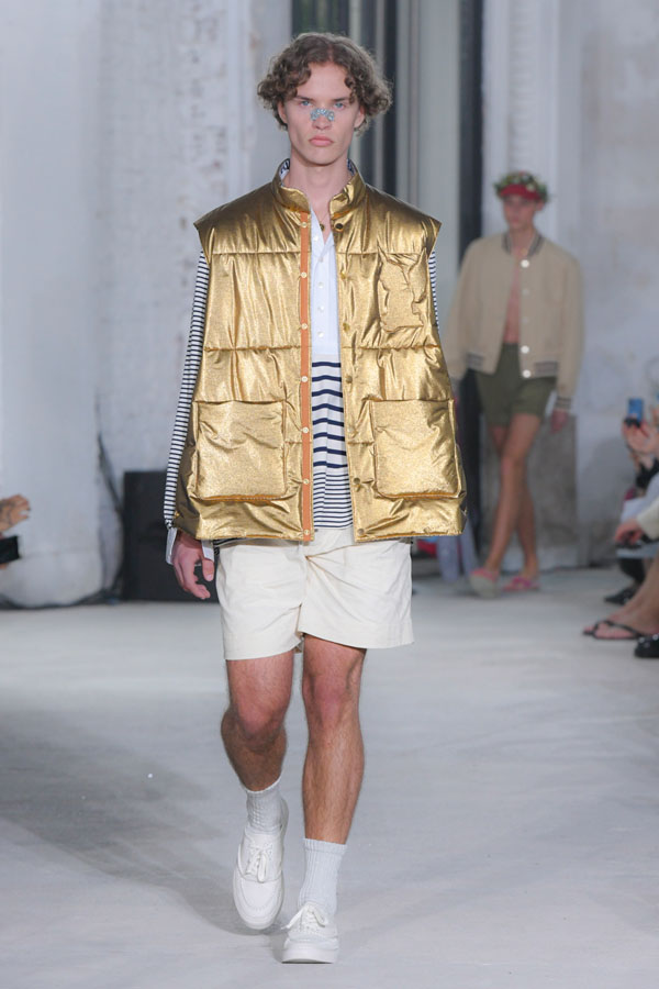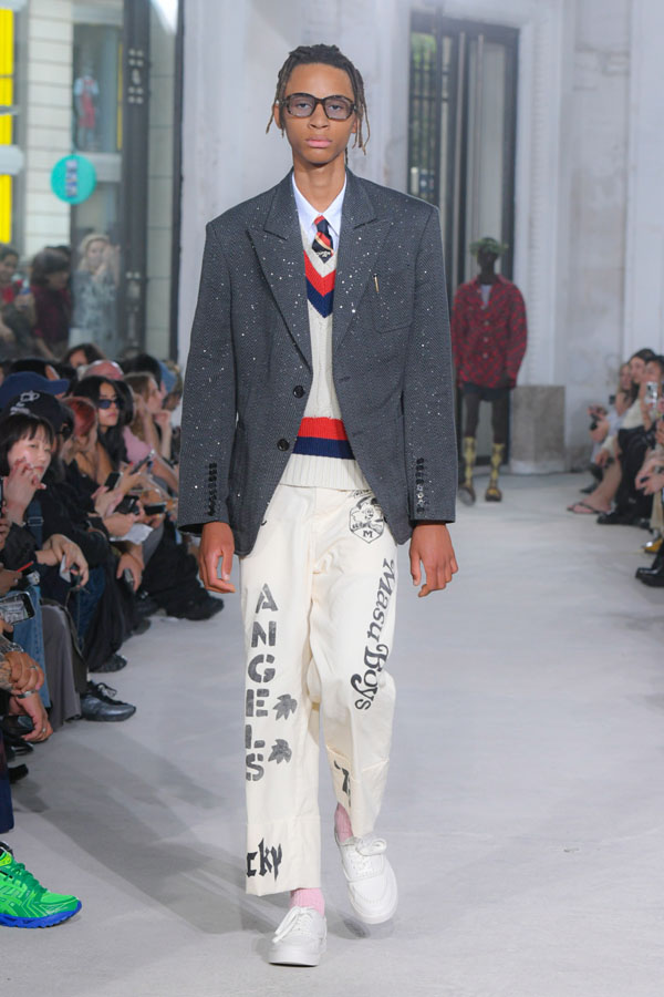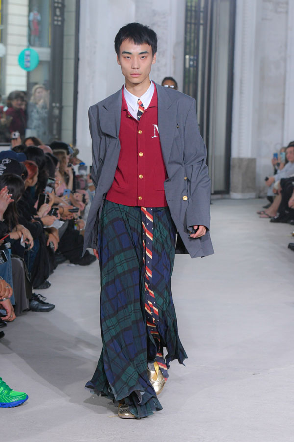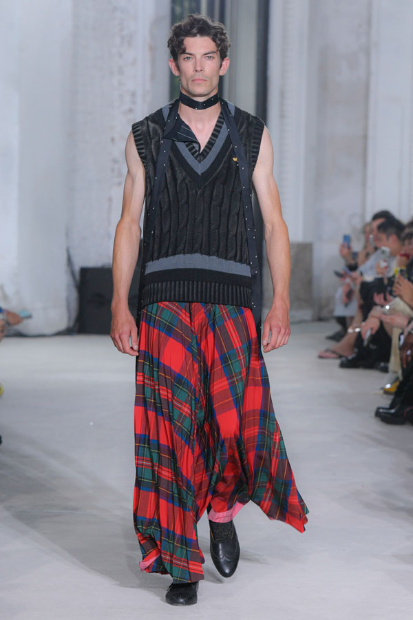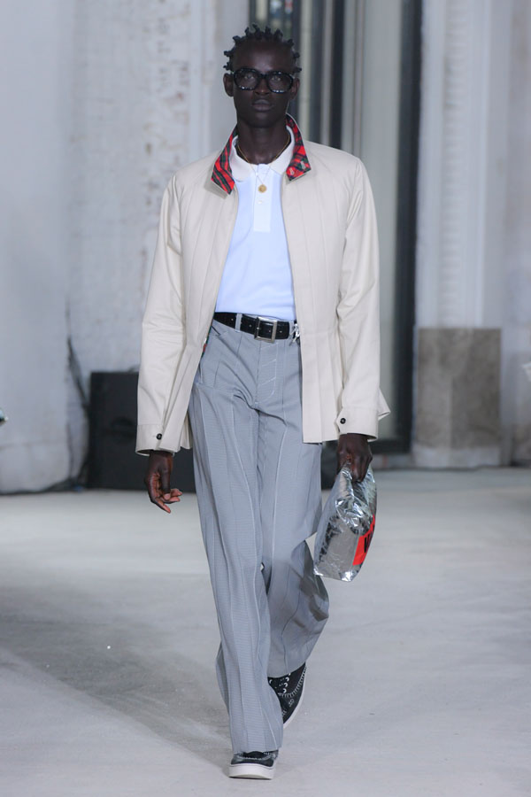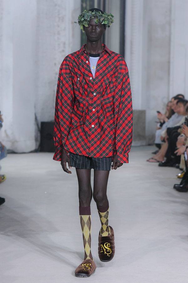 The imagination that questions the existing can weave different stories. The Spring/Summer 2025 collection unveiled on Haussmann Boulevard in Paris is filled with straightforward reinterpretations that directly confront traditional and Ivy styles. With his usual light touch, the designer turned his gaze to the `style’ like mature ivy and the items and outfits that symbolise them. He unraveled navy blazers, marine stripes, and argyle patterns, not only slicing through clichés but also technically transforming forms with smocking and deforming classics with accordion pleats, liberating concepts effortlessly. This playful collection, shedding the abstraction of style, can be seen as a meeting of familiarity and artistic dressing. Shinpei truly envisions the beginning of another tale.