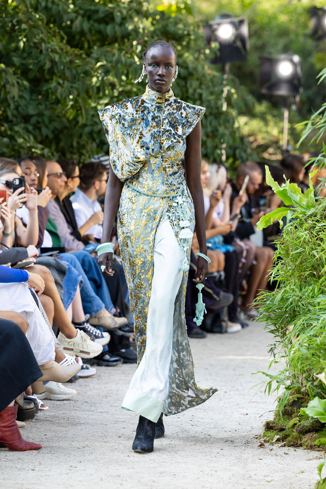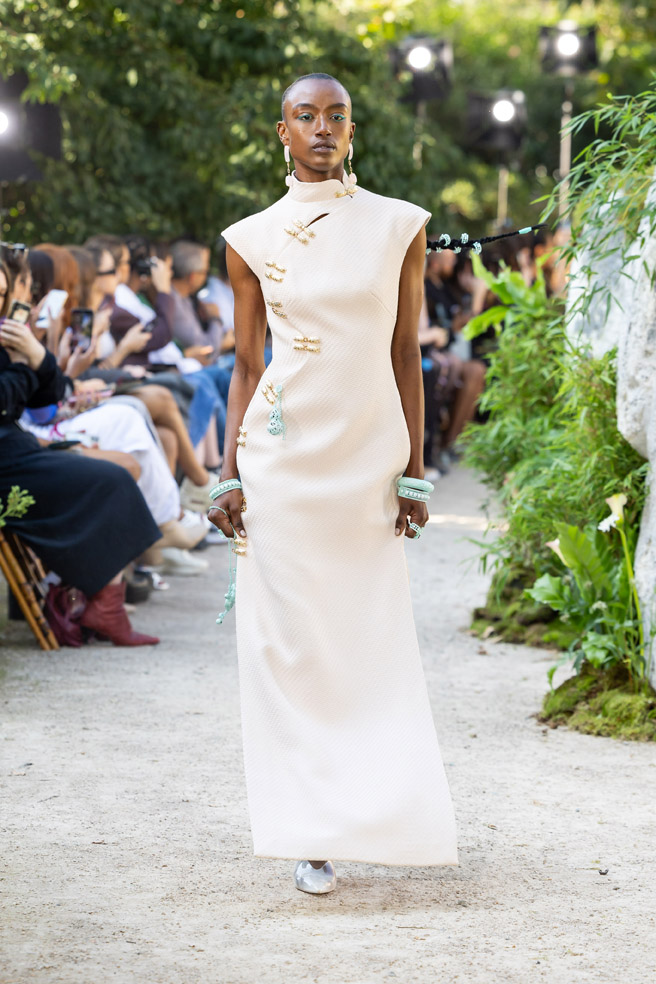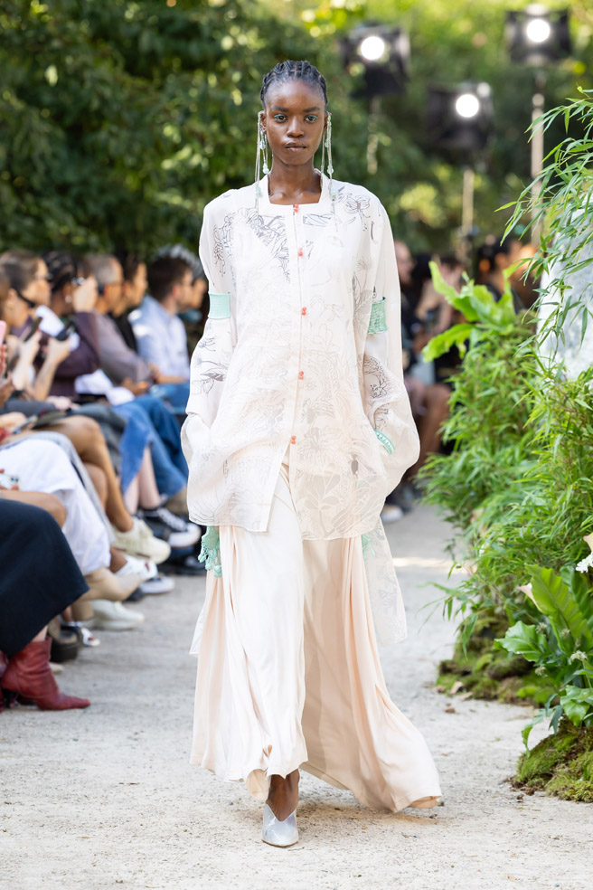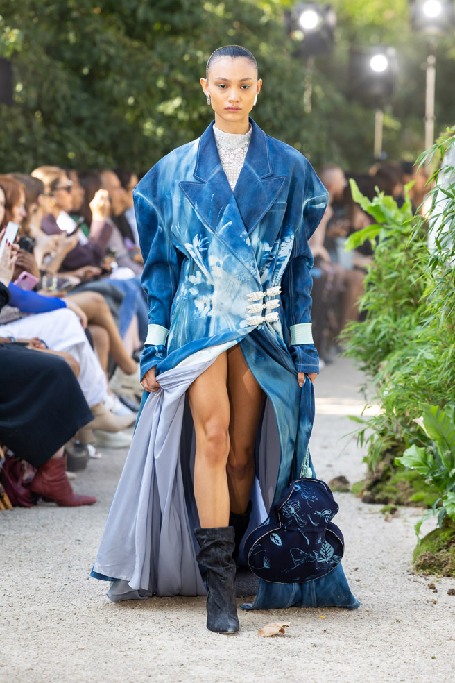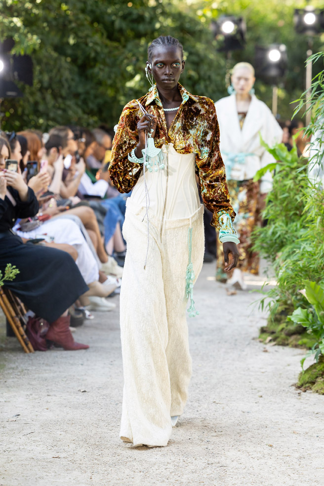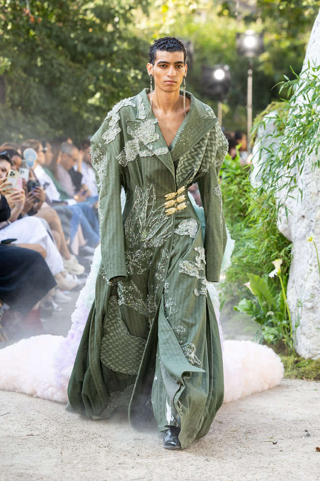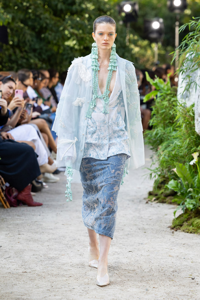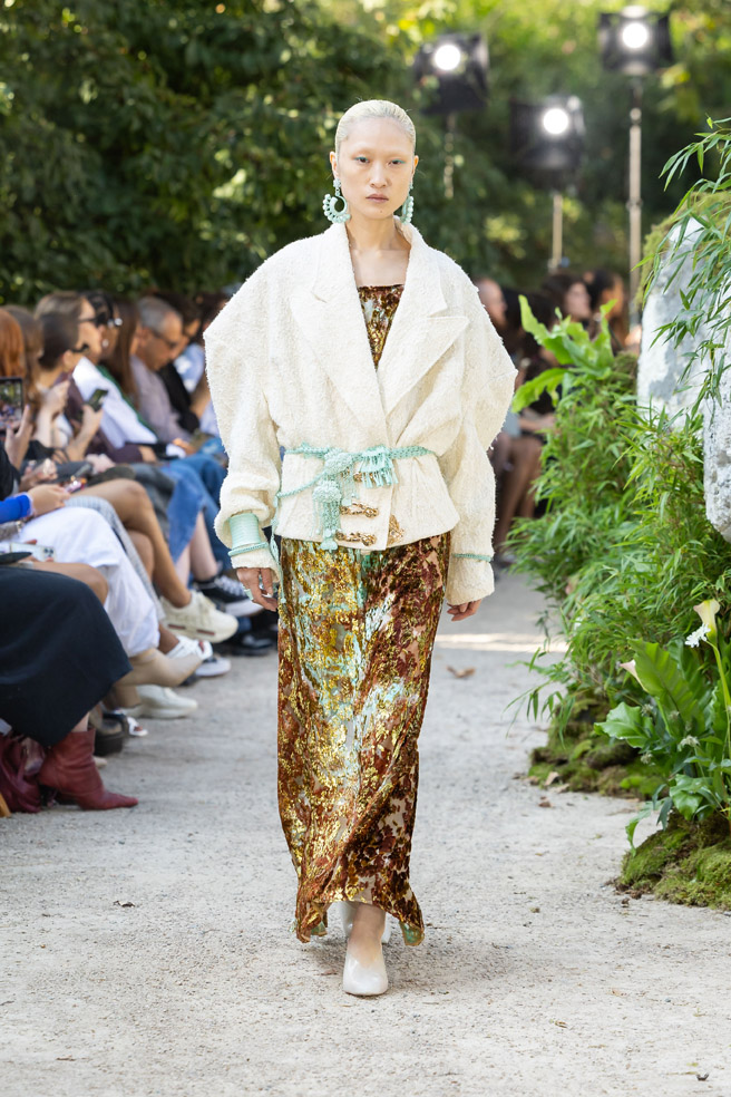 In Zhang’s signature maximalist style, the collection plays with textures that flow like poetry, creating a dance of light and shadow that adds depth and dimension to each ensemble. Layering becomes a metaphor for the layers of healing and rejuvenation that one can experience through fashion.