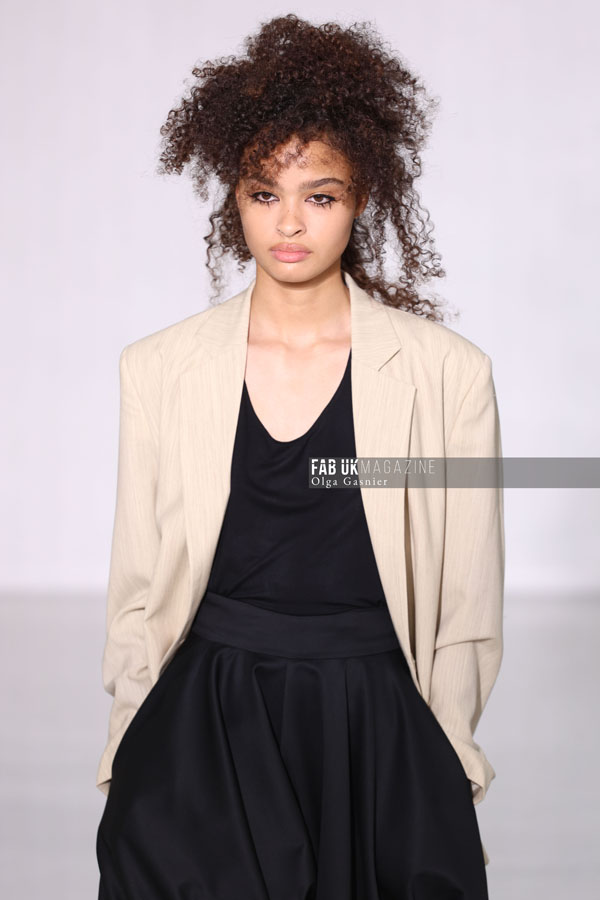 Asymmetry, layered draping, and fluid silhouettes evoke the passage of time. White, black, sandy tones, and gradients reflect transitions from beginning to end. Eras collide in looks: bloomer trousers with a tailored jacket, organza draped over a basic T-shirt.