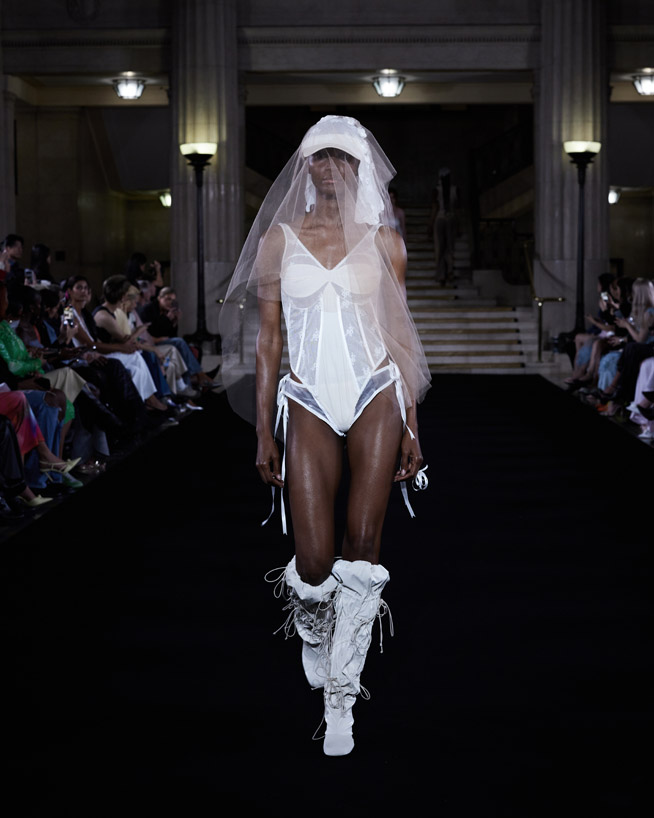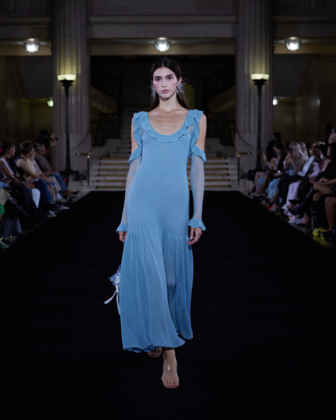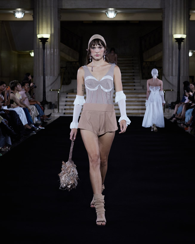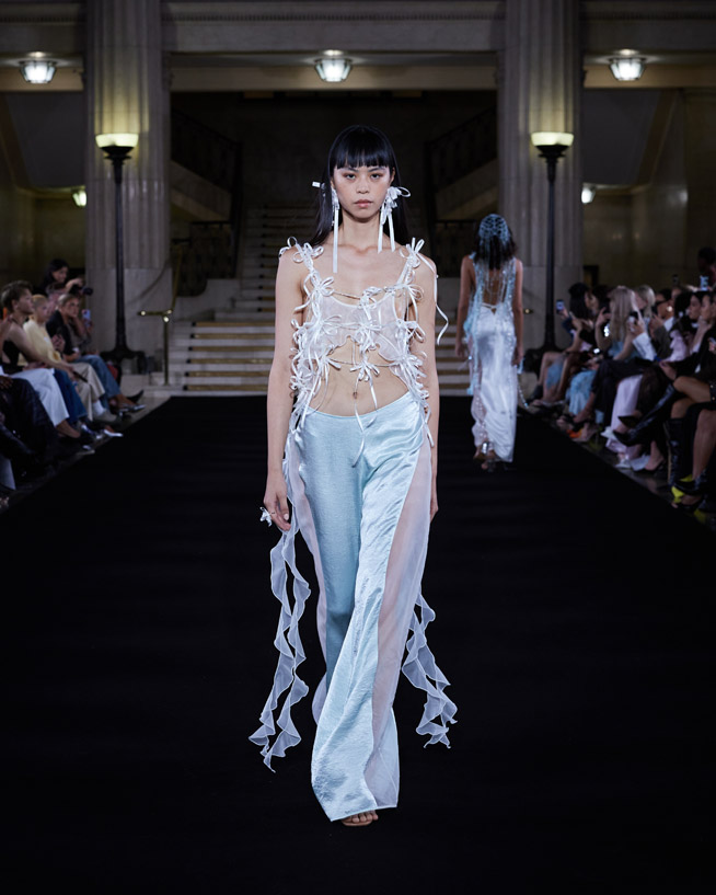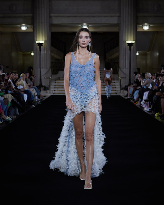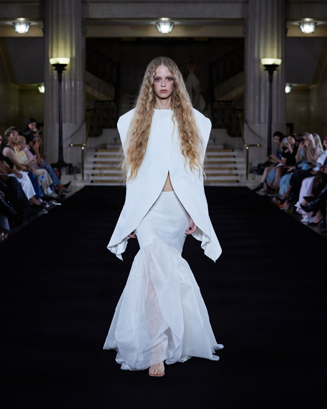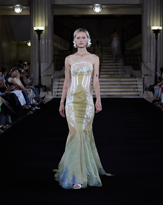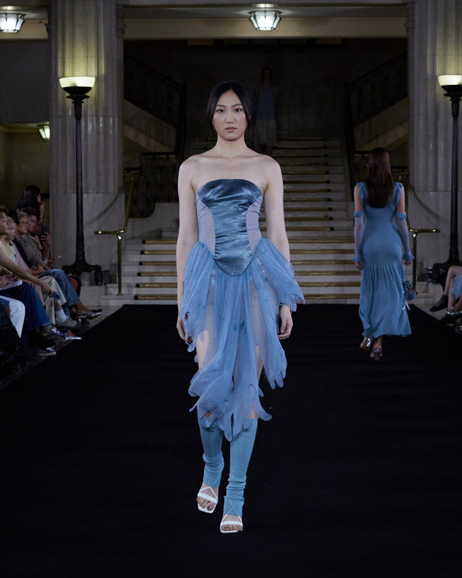 r.l.e’s SS24 collection was nothing short of a tour de force, showcasing avant-garde pattern-making techniques that sculpted enthralling and distinctive body contours. Paired with imaginative fabric combinations, it unfurled the organic allure of the human form in an extraordinary fashion. The primary source of inspiration flowed from the ethereal world of aquatic life, with the Betta fish serving as a muse. Elements such as oversized fishtails and gracefully pleated lines resonated beautifully with the audience, symbolizing the beauty that often remains confined within closed environments, akin to the graceful fish within an aquarium. This metaphorical resonance was a striking contrast to the unseen and undefined realms of aesthetics.
