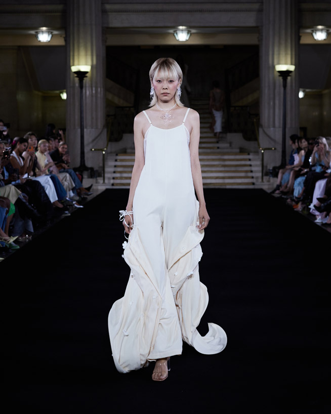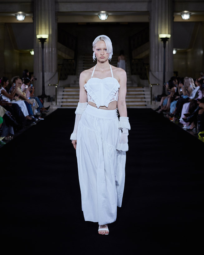 r.l.e’s SS24 collection was nothing short of a tour de force, showcasing avant-garde pattern-making techniques that sculpted enthralling and distinctive body contours. Paired with imaginative fabric combinations, it unfurled the organic allure of the human form in an extraordinary fashion. The primary source of inspiration flowed from the ethereal world of aquatic life, with the Betta fish serving as a muse. Elements such as oversized fishtails and gracefully pleated lines resonated beautifully with the audience, symbolizing the beauty that often remains confined within closed environments, akin to the graceful fish within an aquarium. This metaphorical resonance was a striking contrast to the unseen and undefined realms of aesthetics.