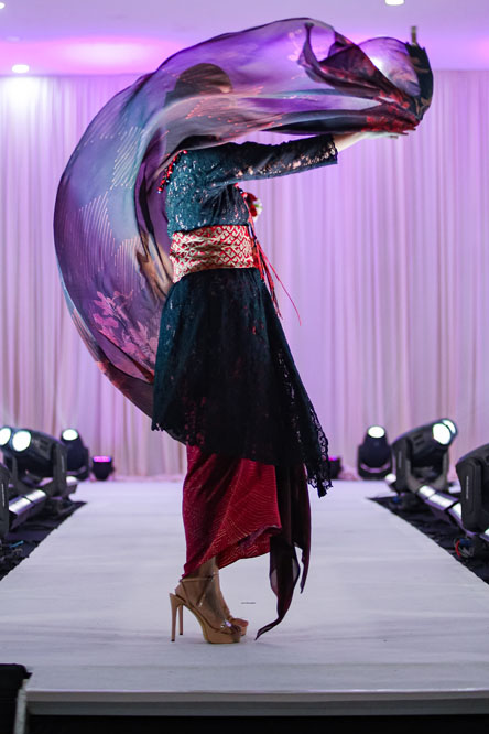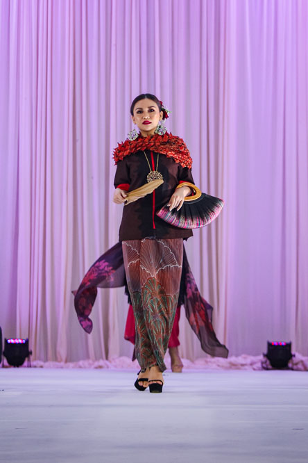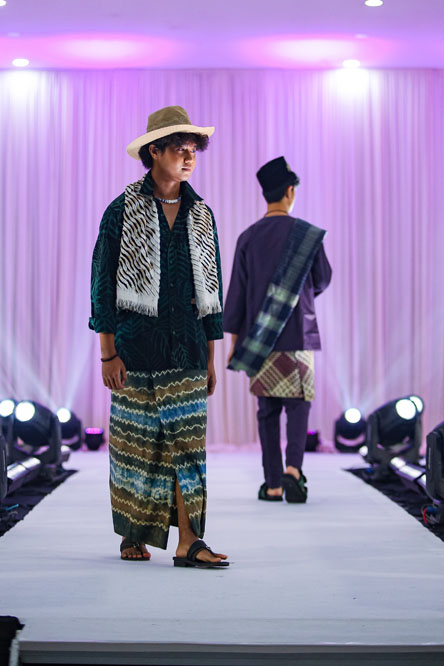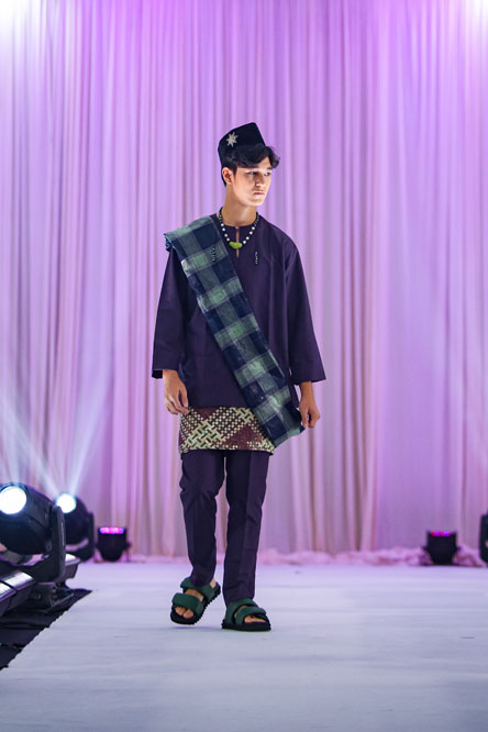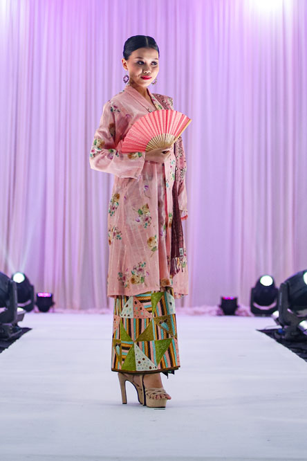 He uses new Sarawakian batik with Dayak patterns or local themes like the pattern of the multi-coloured layered cake (kueh lapis) so popular in the region. He also incorporates and celebrates diverse cultures like matching the Chinese style baju ‘peki’ (a traditional reimagined blouse combining Chinese samfoo and kebaya hybrid) with a batik sarong with Dayak patterns, to emphasize the cultural diversity of Malaysia.