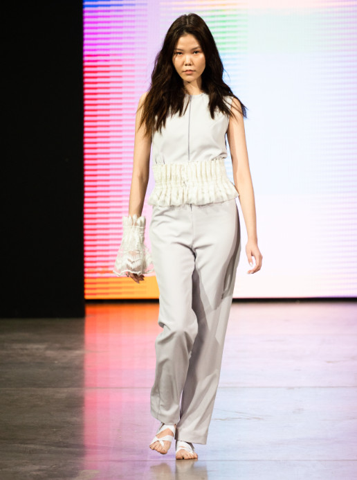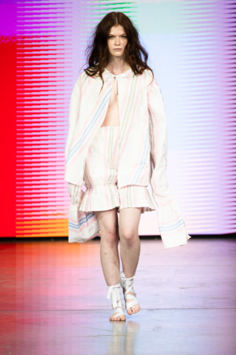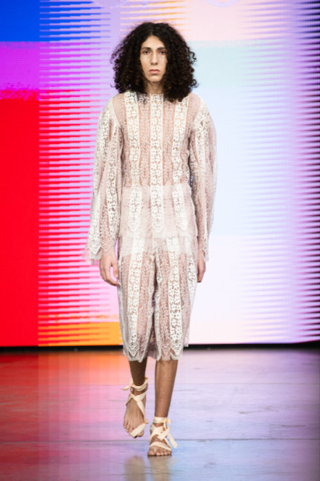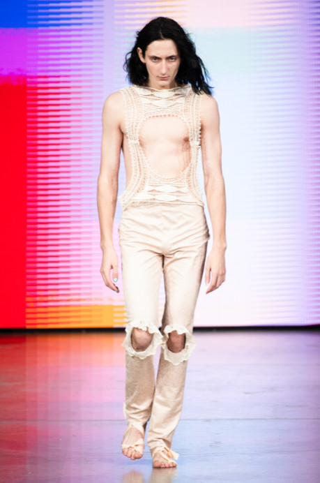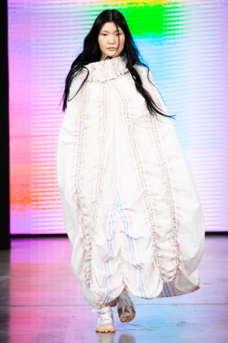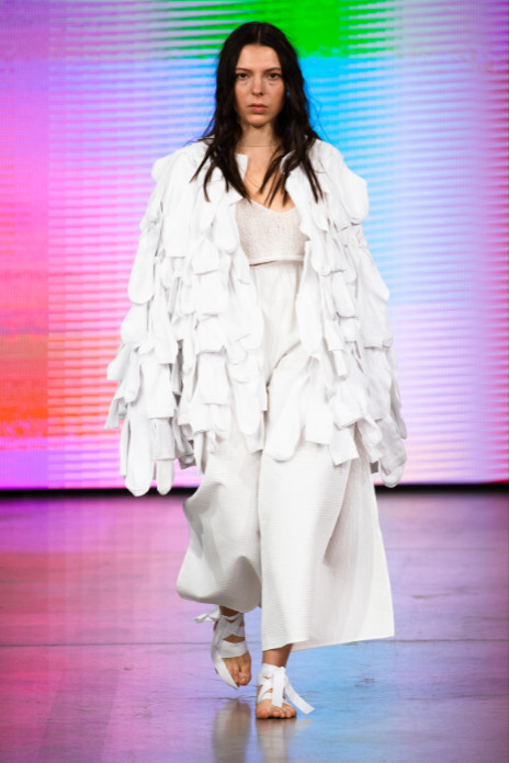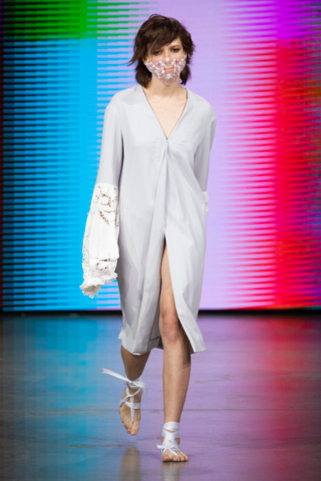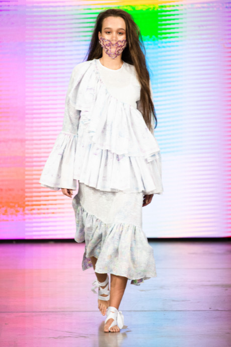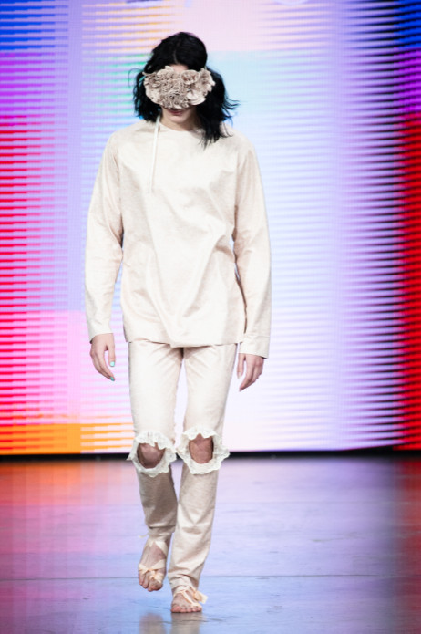 Long lacy cotton sleeves, ribbons tied to ankles, knitted tank tops and long, shimmering skirt-pants – all this formed an image of a Yakut woman of the 21st century. Some garments were oversized and inspired by traditional bedwear. Accessories featured embellished sparkly masks, traditional embroidered headscarves and lacey veils adorned with felt teardrops. The lace masks were the highlight of this soft and comfy collection in pastel pinks and blues – getting one of these faceguards should be the goal of every fashionista as soon as possible.