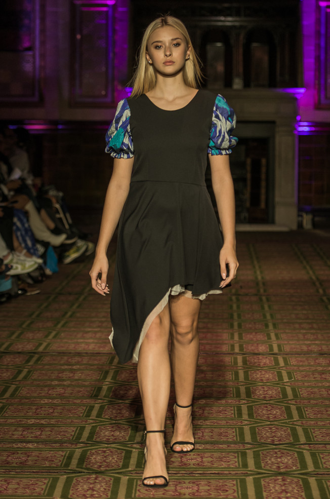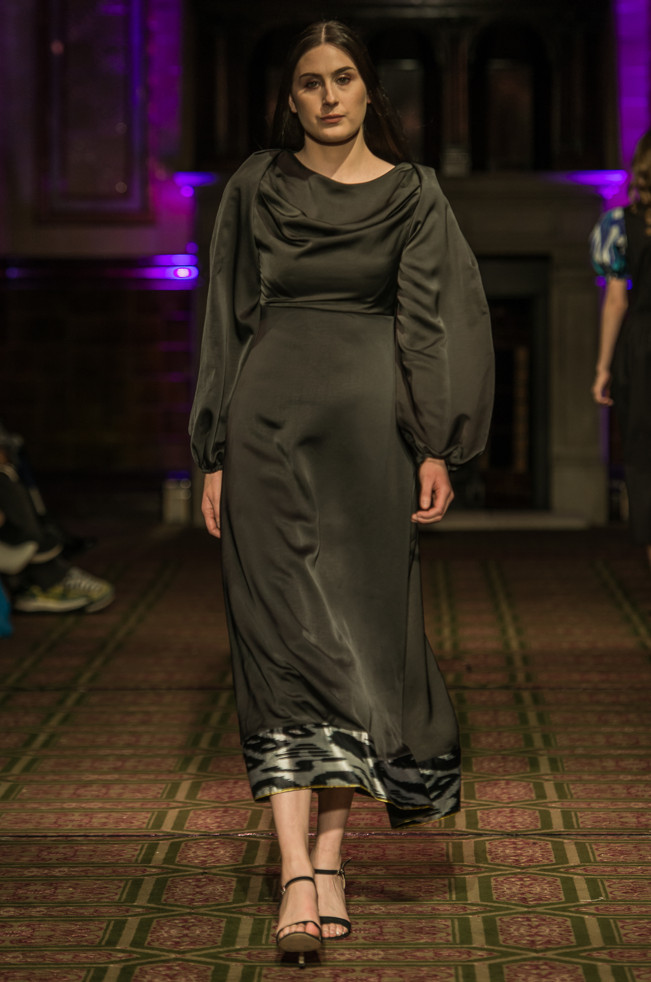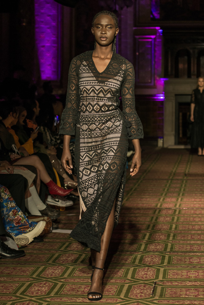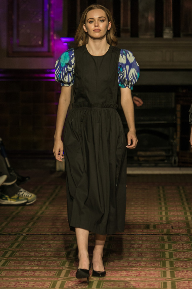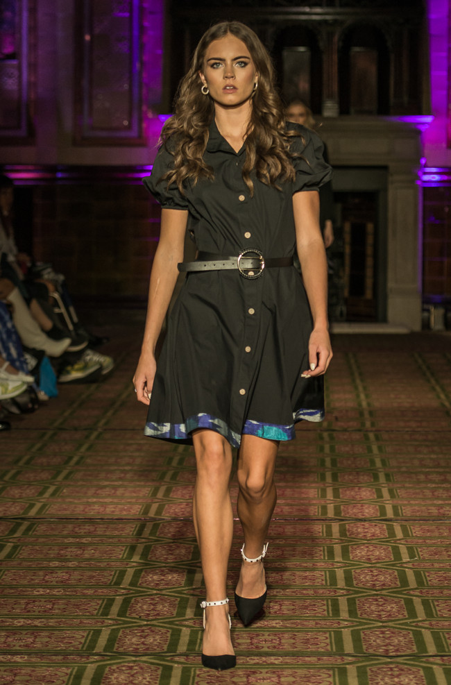 The collection is made in shades of black with trimmings made from multi-colour hand-woven Ikat fabric sourced from Uzbekistan.