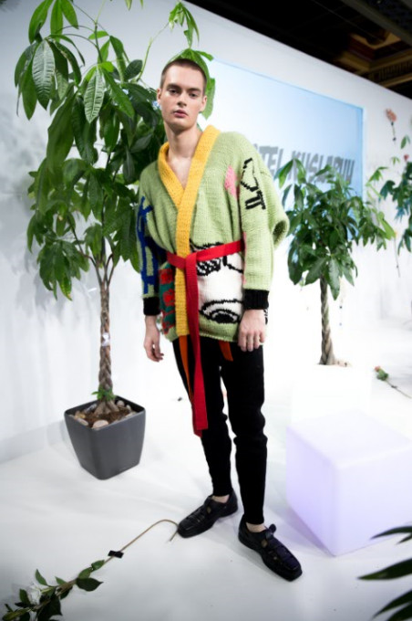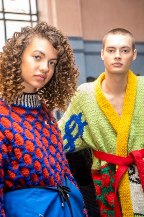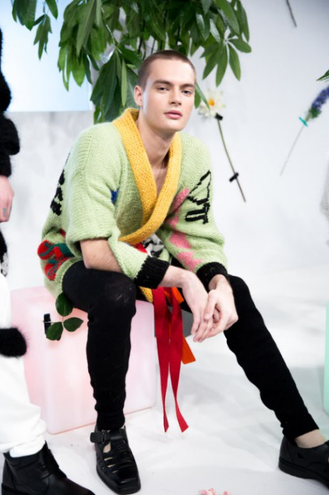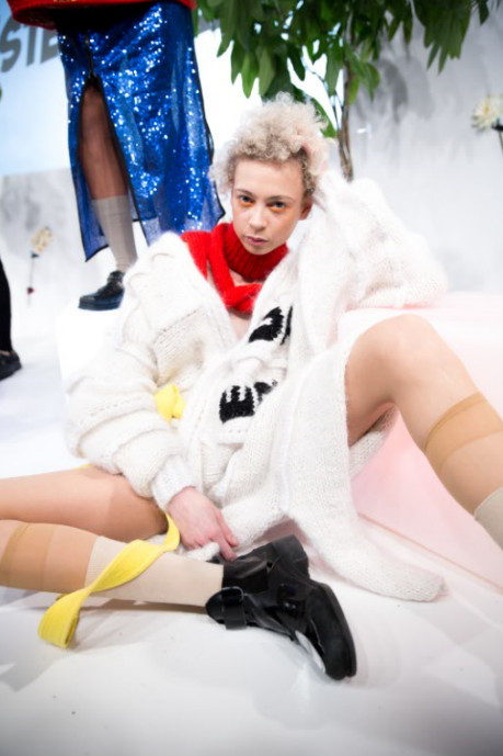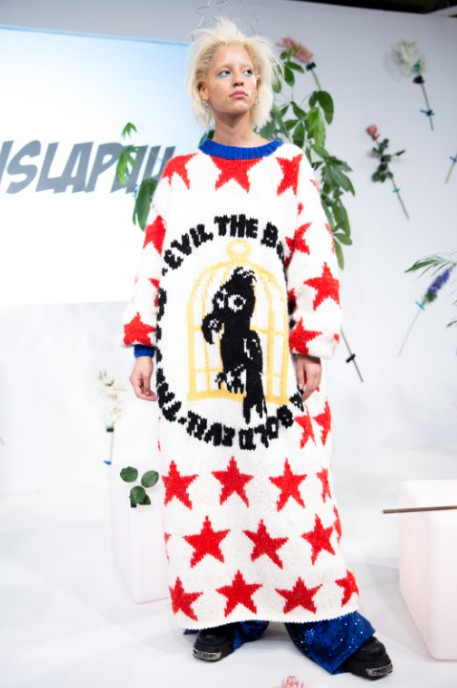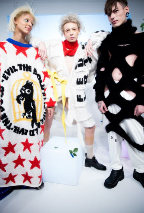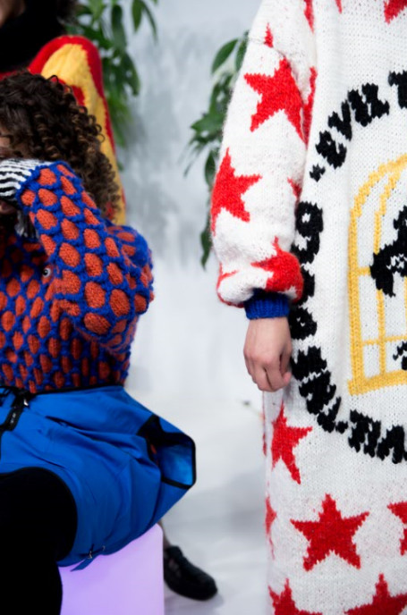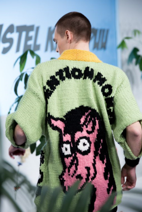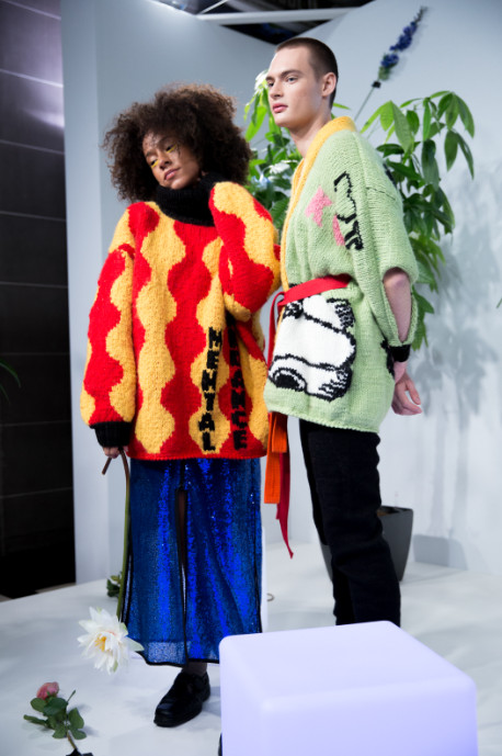 The AW18 collection is inspired by dark secrets, phobias, social anxieties and traumas. The pieces themselves, talk about serious and inconvenient subjects through highest levels of self-irony. Most of the bold, colourful designs in the collection are hand knit as a protest against fast fashion. A twist is added by portraying serious topics with cute and fuzzy materials, such as yarns from alpaca, camel, goat and sheep. Flirting with sculptural forms, bold colours, unique patterns, the collection shares provocative messages and symbols, transcending traditional gender conformity.