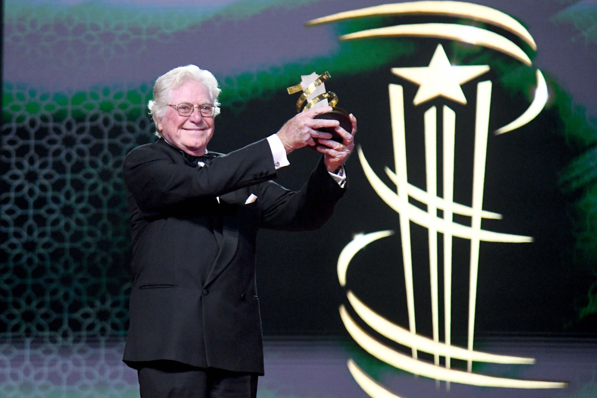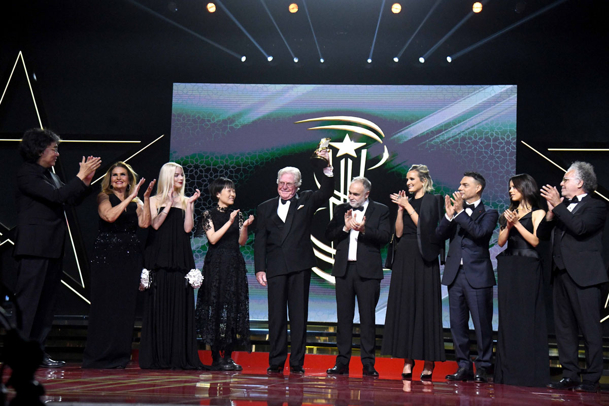 Egyptian actor Hussein Fahmy (C) holds the Tribute Award as he is acknowledged by fellow film industry personalities, from left: Jury President and South Korean filmmaker Bong Joon-ho, Egyptian actress Yousra, jury members US actress Anya Taylor-Joy, Canadian director and playwright Celine Song, Brazilian film director and visual artist Karim Ainouz (6th L), French film director and screenwriter Julia Ducournau, Iranian actor and director Payman Maadi, American actress Jenna Ortega, and Moroccan filmmaker Hakim Belabbes pose on stage at the Opening Red Carpet during the 22nd Marrakech International Film Festival on November 28, 2025 in Marrakech, Morocco. Photo Credit: Shooting.ma
