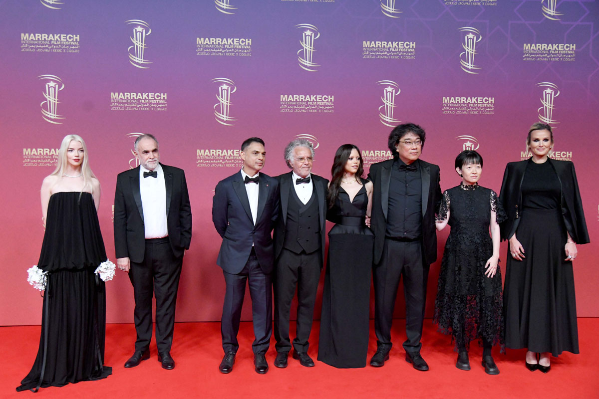 (L-R) Jury Members : Anya Taylor-Joy, Karim Aïnouz, Payman Maadi, Hakim Belabbes, Jenna Ortega, Jury President Bong Joon-ho, Celine Song and Julia Ducournau attends the Opening Red Carpet during the 22nd Marrakech International Film Festival on November 28, 2025 in Marrakech, Morocco. (Photo by Shooting.ma)